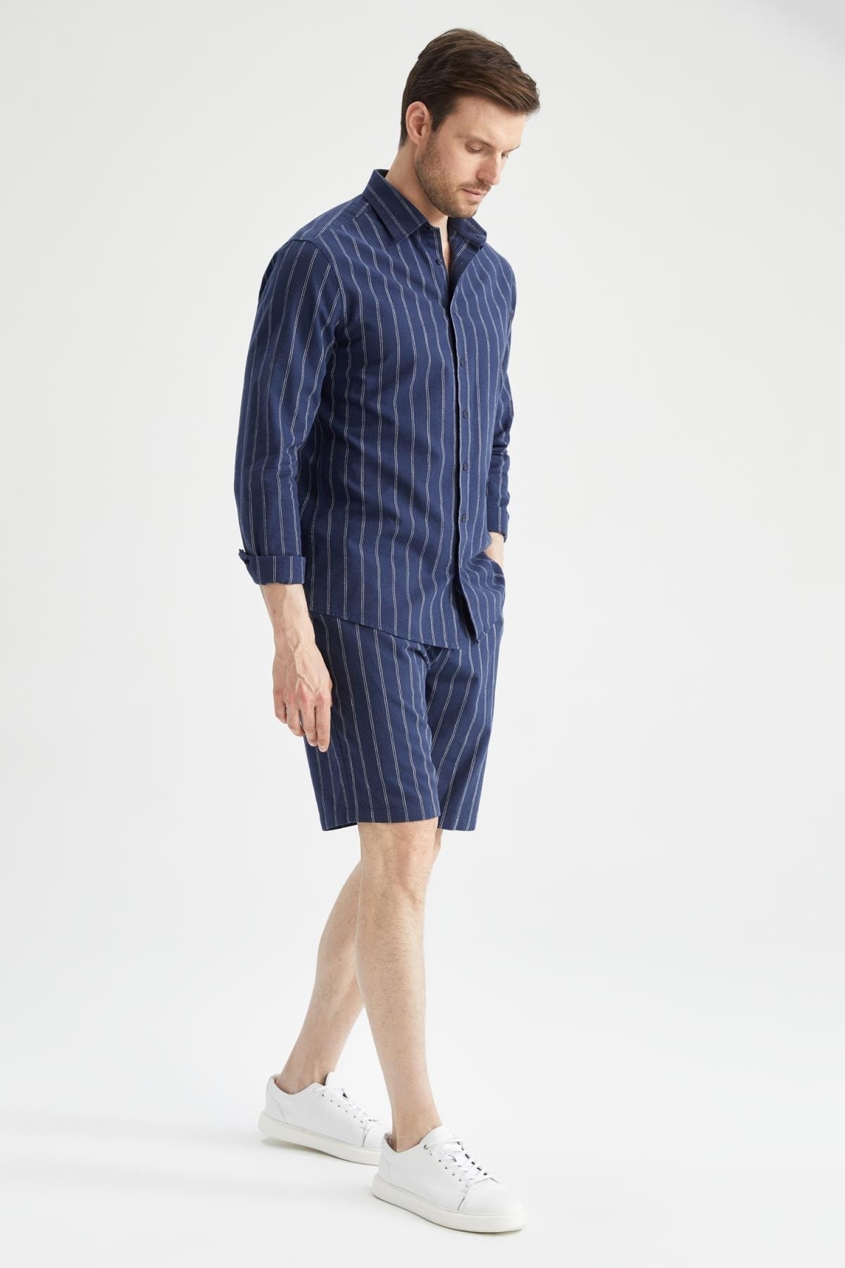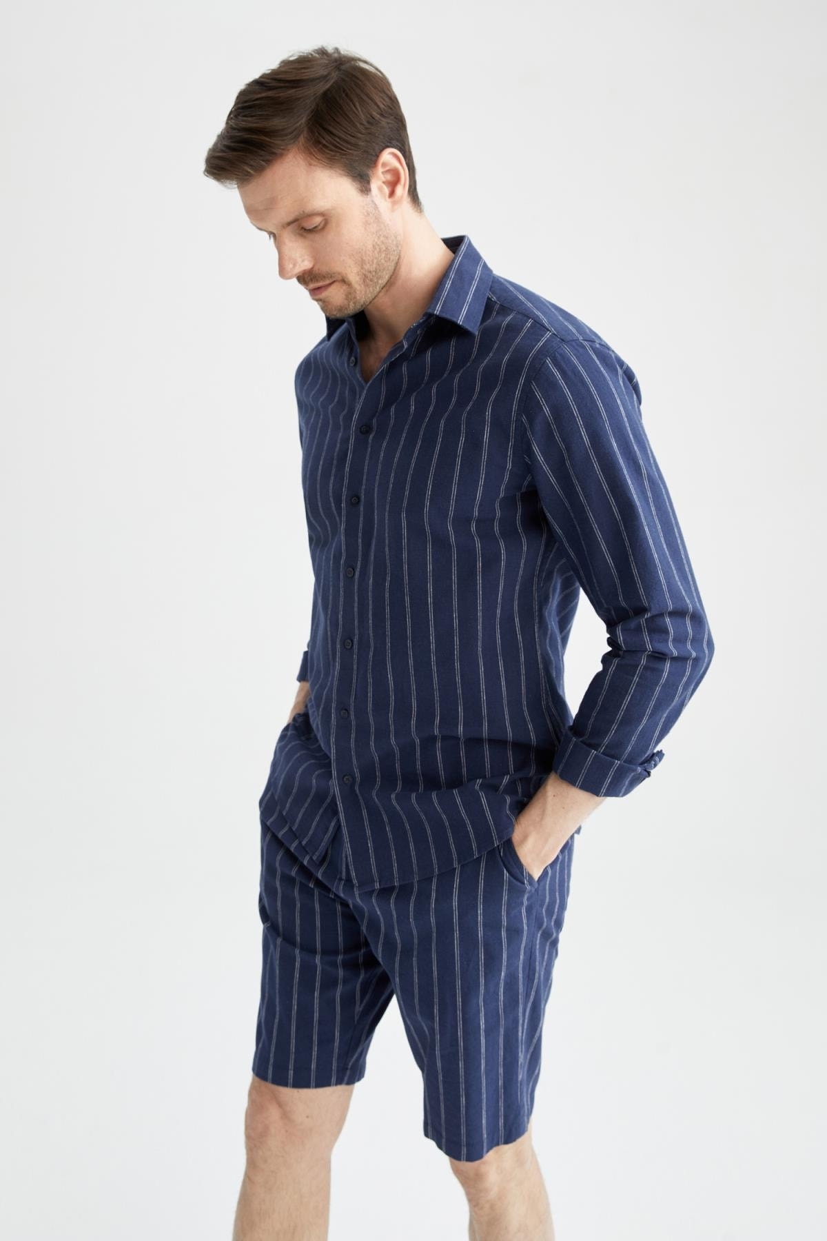 Cepli, çizgili, pamuk keten karışımlı hava alan kumaşıyla dinamik ve aynı zamanda şık görünmeyi sevenlerin tercihi, tarzınıza farklı bir hava katacak baskılı tişörtlerle, jean, keten gömleklerle kombinleyebileceğiniz defacto erkek regular fit keten karışımlı çizgili bermuda şort.