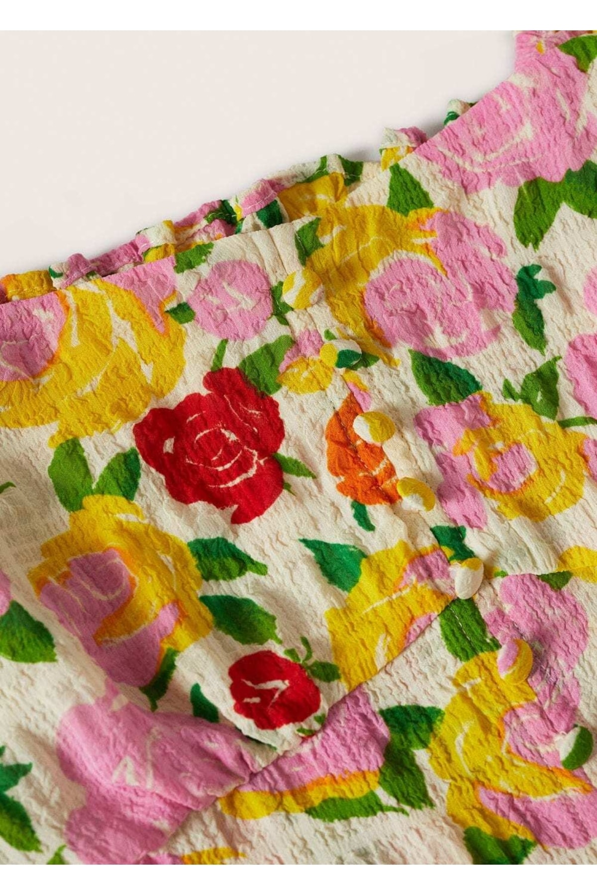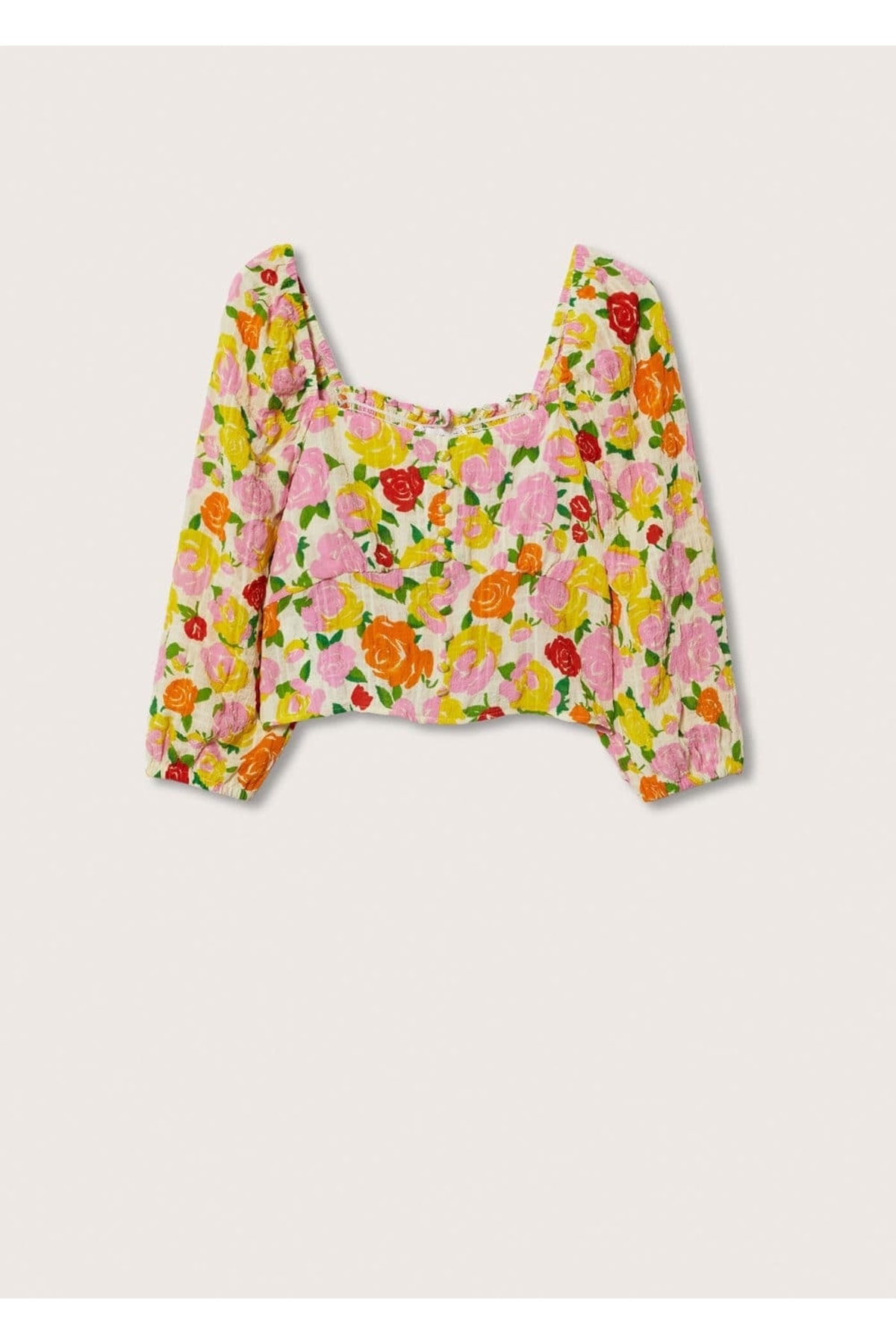 Bluz .-- pradera. Dökümlü kumaş, Çiçekli model, Düz model, Kısaltılmış tasarım, Çiçekli, Yuvarlak yakalı, Uzun kollu ve manşetli, Dekoratif püsküllü, Arkası elastik bantlı, Total look. 98% polyester,2% elastan, Astar: 100% polyester. Yan dikiş uzunluğu 25.6 cm, Arka uzunluk 34.0 cm. MAKİNEDE MAKS. 30°C'DE YIKAYIN, ÇAMAŞIR SUYU KULLANMAYIN, MAKS. 110°C İLE ÜTÜLEYİN, PERKLOROETİLEN KURU TEMİZLEME UYGULAYIN, KURUTMA MAKİNESİNDE KURUTULAMAZ