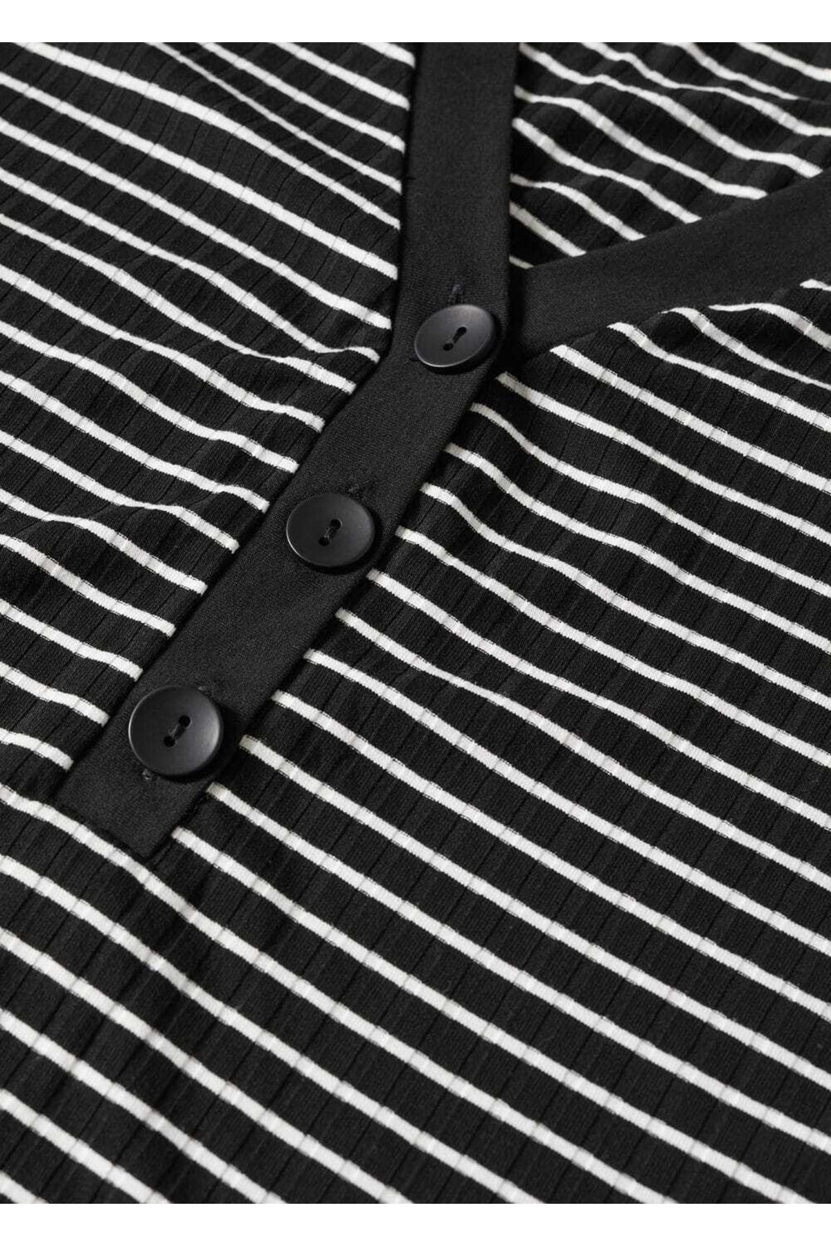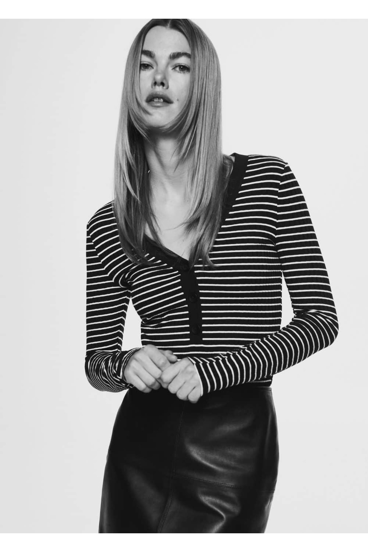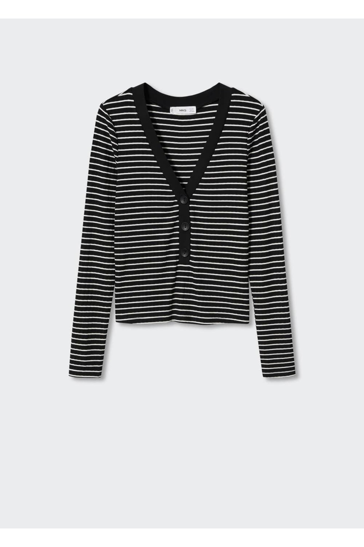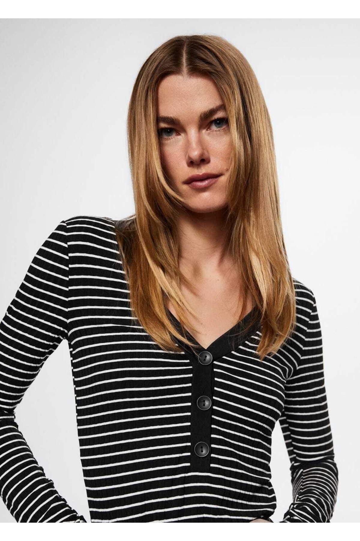 Tişört .-- noir. Committed Koleksiyonu, Lastik örgülü kumaş, Streç kumaş, Çizgili, Düz model, Düğmeli v yaka, Uzun kollu, Committed etiketli giysiler, çevresel etkilerinin azaltılarak, sürdürülebilir lifler veya süreçler kullanılarak üretilen ürünlerdir. Mango'nun hedefi, doğaya daha fazla adanmış olan uygulamaları desteklemek ve koleksiyondaki sürdürülebilir giysi sayısını arttırmaktır. 93% viskoz,7% elastan, Yaka: 93% viskoz,7% elastan. Yan dikiş uzunluğu 34.4 cm, Arka uzunluk 52.0 cm. KISA SANTRFÜJLE MAKİNEDE MAKS. 30°C'DE YIKAYIN, ÇAMAŞIR SUYU KULLANMAYIN, MAKS. 110°C İLE ÜTÜLEYİN, KURU TEMİZLEME YAPILMAZ, KURUTMA MAKİNESİNDE KURUTULAMAZ