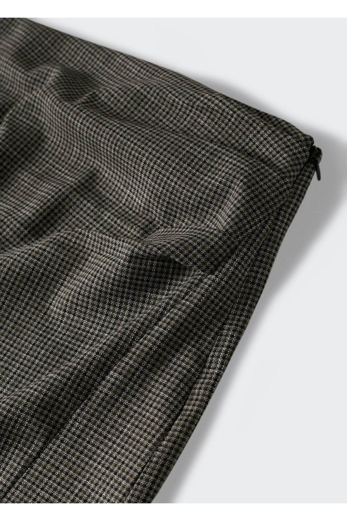 Etek .-- Minigi. Geri dönüştürülmüş polyester karışımlı kumaş, kazayağı desenli, düz tasarım, kısa boy, gizli yan fermuar kapamalı, ön alt kısımı yırtmaç detaylı, iç astarsız, büyük beden mevcuttur, committed koleksiyonu, committed etiketli giysiler, çevresel etkilerinin azaltılarak, sürdürülebilir lifler veya süreçler kullanılarak üretilen ürünlerdir. Mango'nun hedefi, doğaya daha fazla adanmış olan uygulamaları desteklemek ve koleksiyondaki sürdürülebilir giysi sayısını arttırmaktır. 40% recycled polyester,30% viskoz,28% polyester,2% elastan. Yan dikiş uzunluğu 45.5 cm, etek uzunluğu 46.8 cm. Makinede maks. 30°c'de yıkayın, çamaşır suyu kullanmayın, maks. 110°c ile ütüleyin, kuru temizleme yapılmaz, kurutma makinesinde kurutulamaz