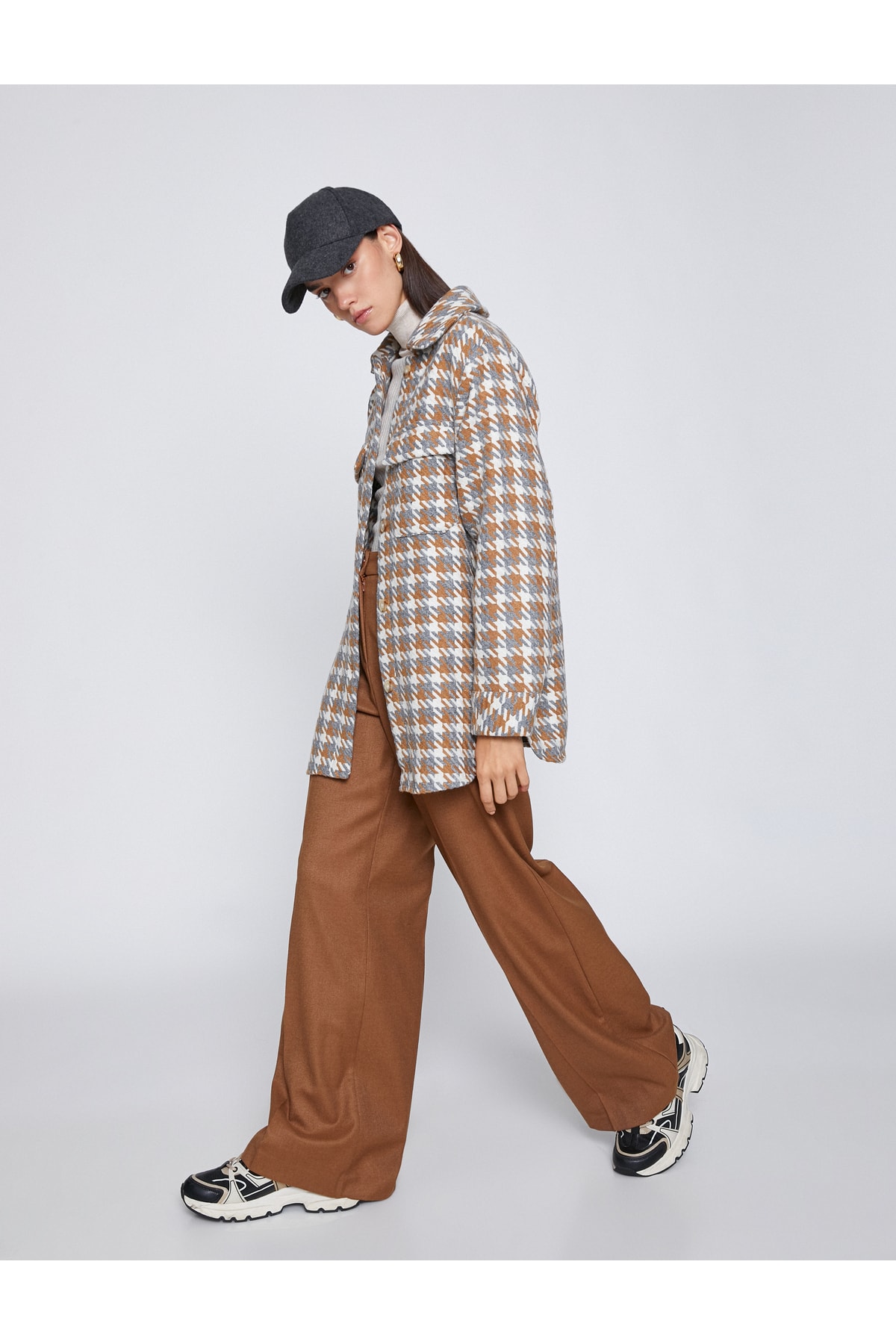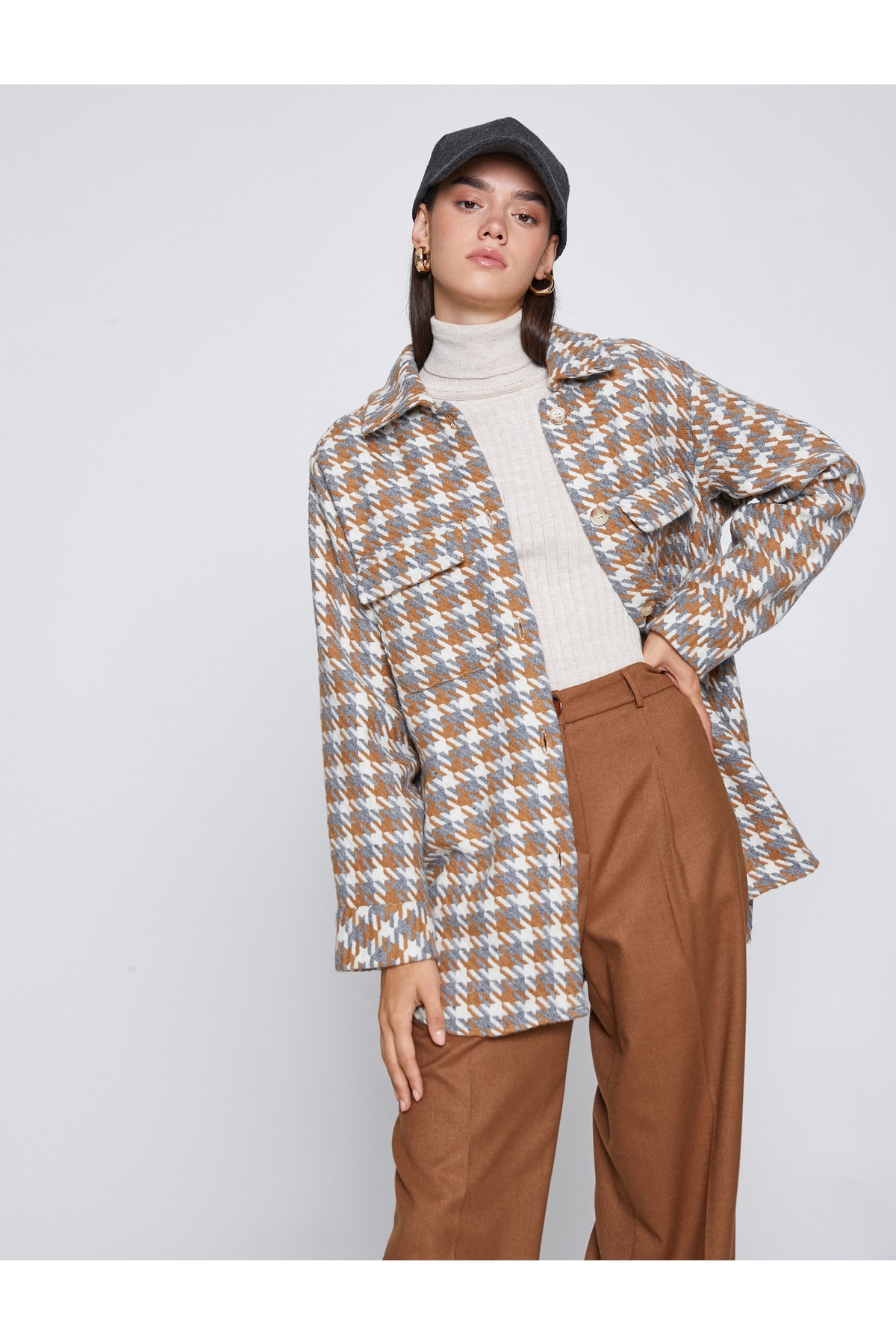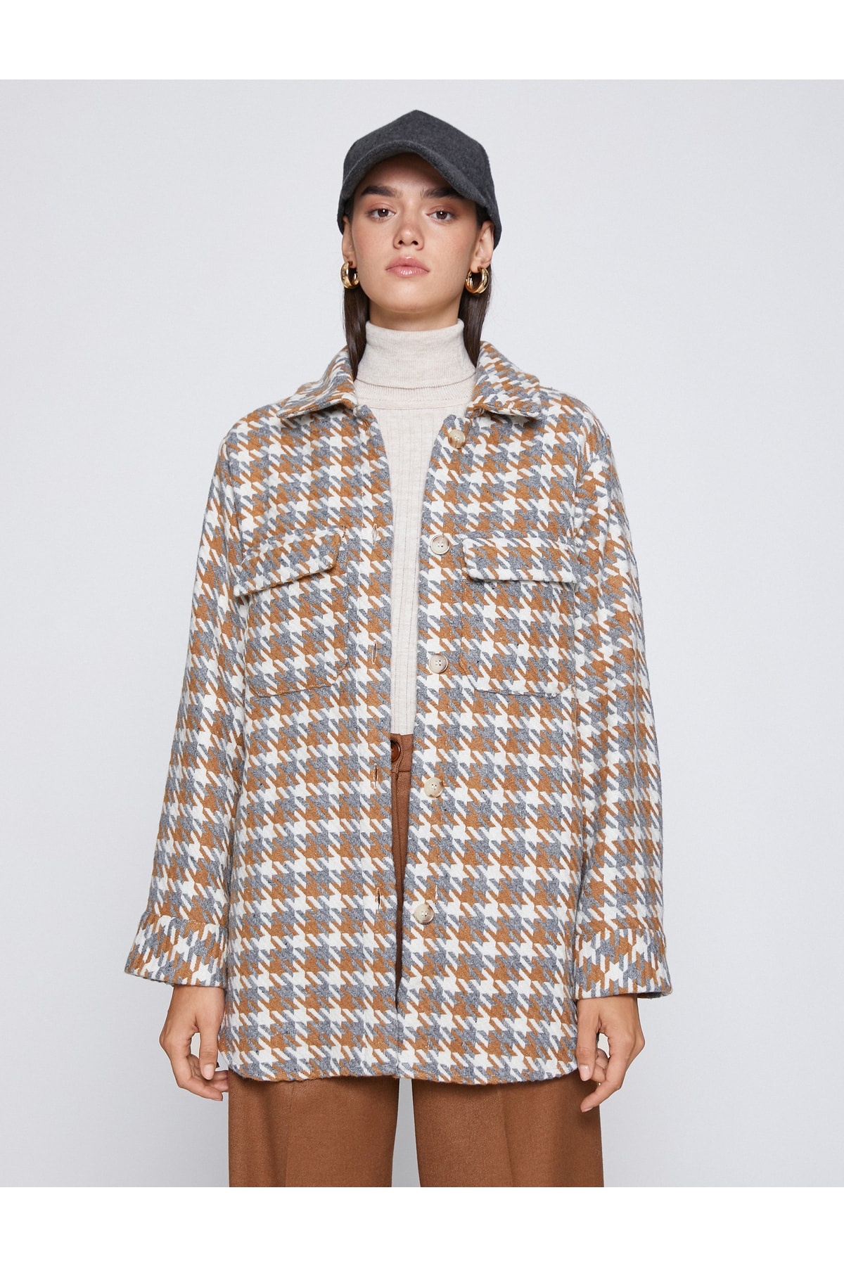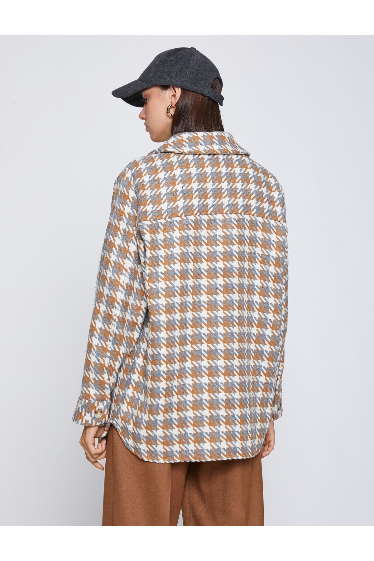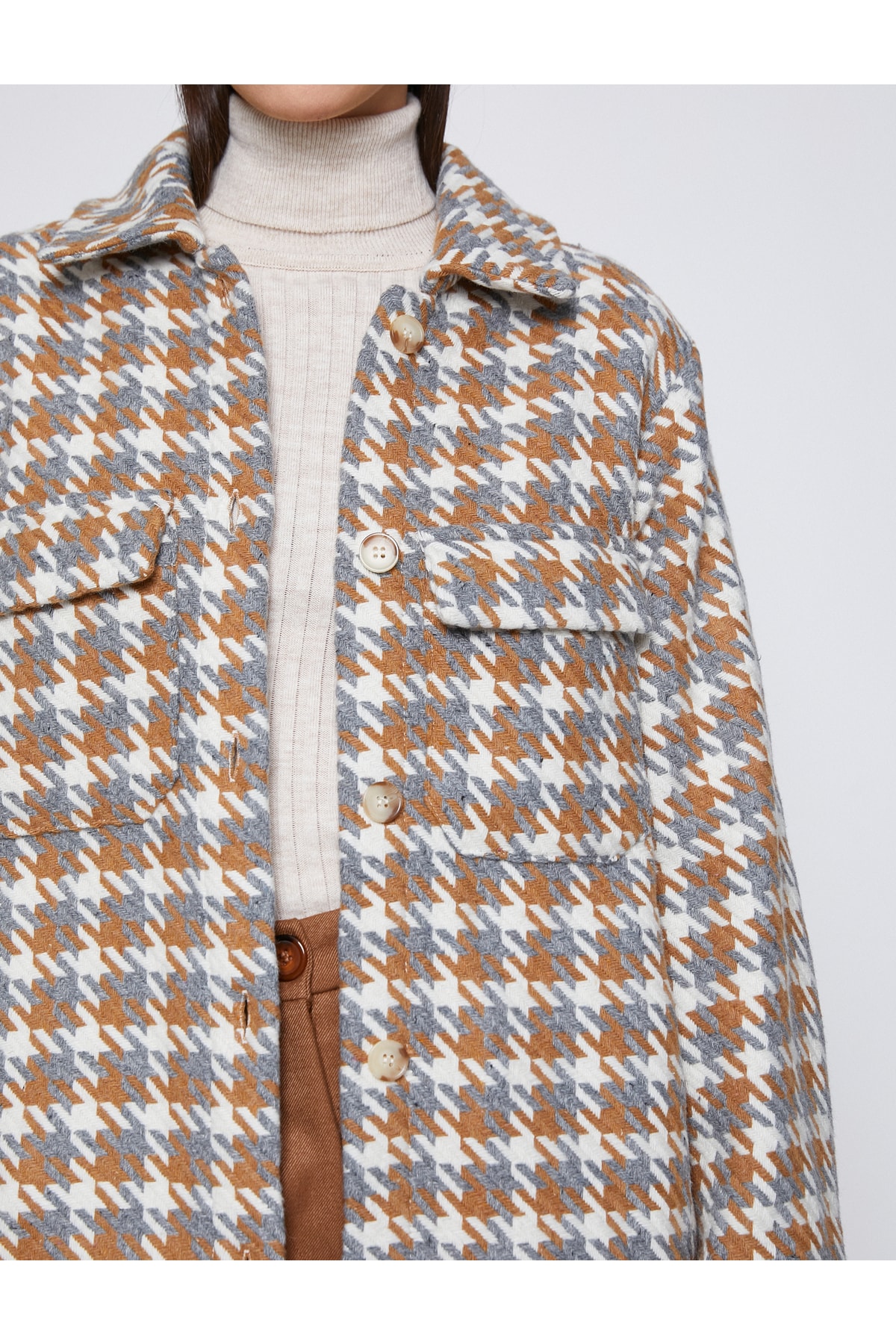 Cepli, düğmeli, kazayağı desenli shacket (gömlek ceket).