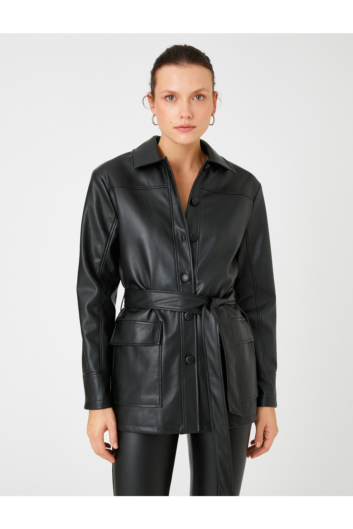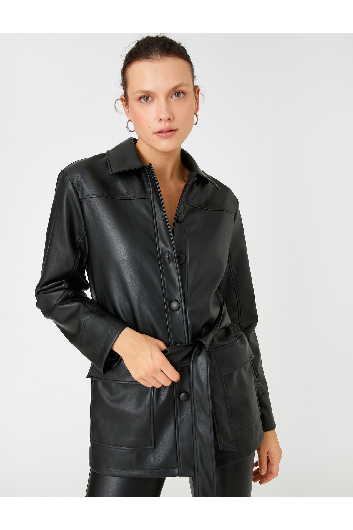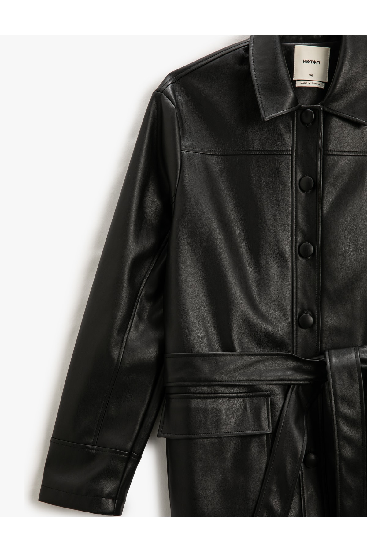 - نام : Oversize Deri Görünümlü Ceket Gömlek Yaka Kuşaklı