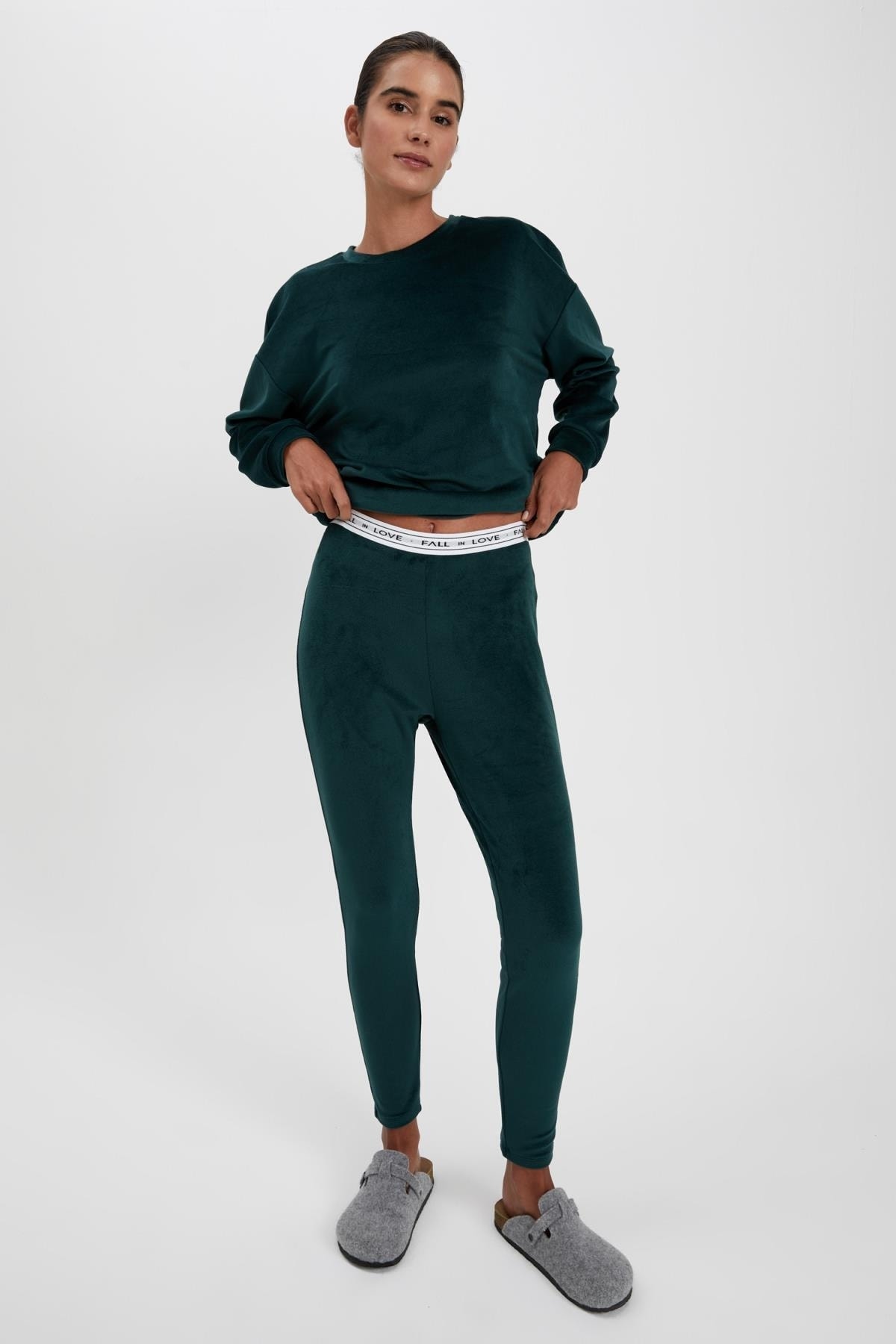 Yılbaşı temalı veli slogan baskılı uzun alt tasarımıyla, rahat kalıbı ile evde hem rahat olmak hem de güzel görünmek isteyen kadınlar için, yumuşacık velur kumaşıyla tercih edeceğiniz DeFacto Kadın Fall In Love Regular Fit Yılbaşı Temalı Beli Baskı Detaylı Pijama Altı