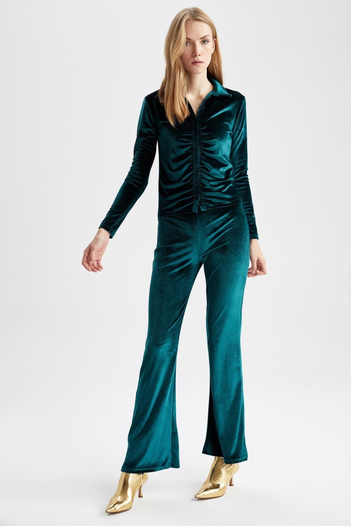 Rahat kesimi ile kolayca fit bir görünüm elde edebileceğiniz, yüksek belli, aynı zamanda son zamanların en trend pamuklu dokuma pantolonu DeFacto Kadın Kadife Pantolon.