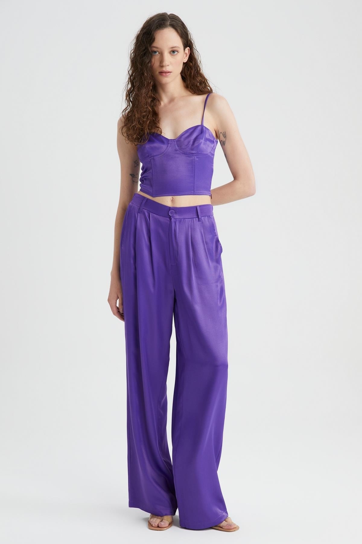 Geniş paça saten dokuma kumaşlı şık tasarımı, kolayca fit bir görünüm sağlayan yüksek ve esnek bel modeli her tarz crop sweatshirt, crop top, basic tişört, tunik, kimono, triko kazak ve balon kollu gömlekler ile kolayca kombinleyip tarz bir görünüm sağlayabileceğiniz, yumuşacık dokusu ve farklı renk seçenekleriyle DeFacto Kadın Normal Bel Geniş Paça Saten Pantolon