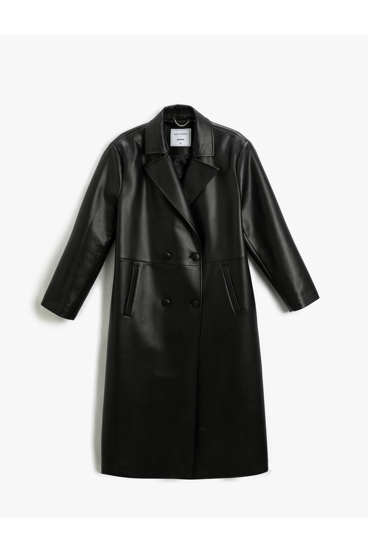 Ece Sükan X Koton | Kruvaze, düğmeli, cepli, uzun deri görünümlü ceket.