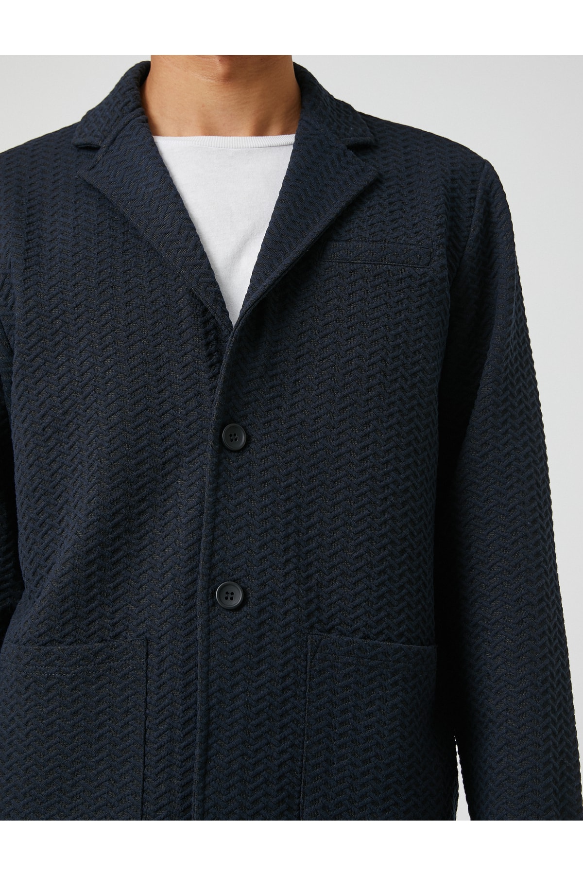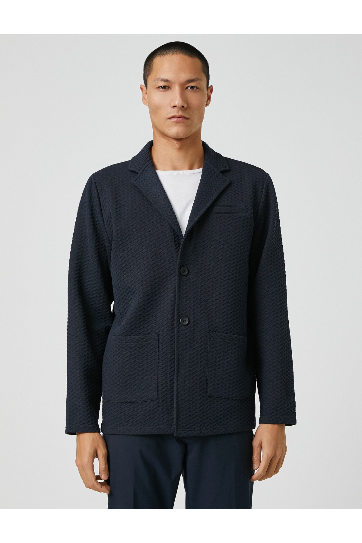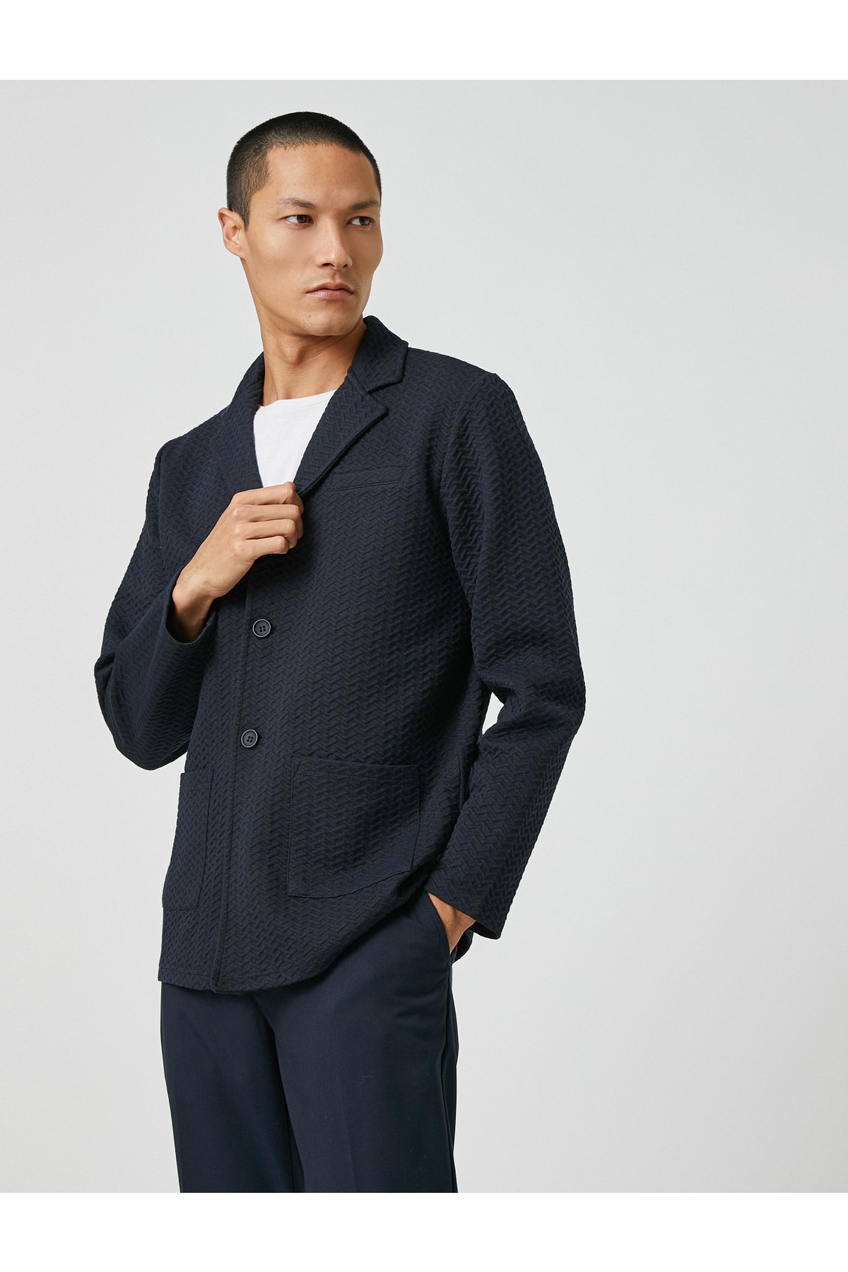 Cep detaylı, geniş yaka, düğmeli, dokulu basic ceket.
