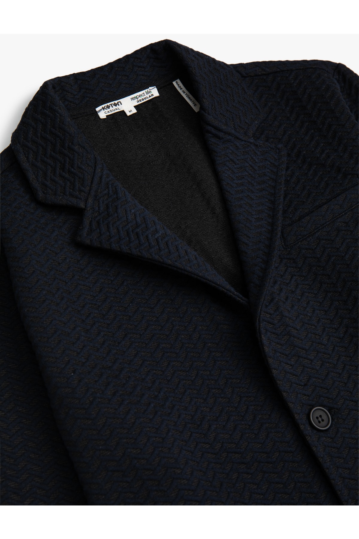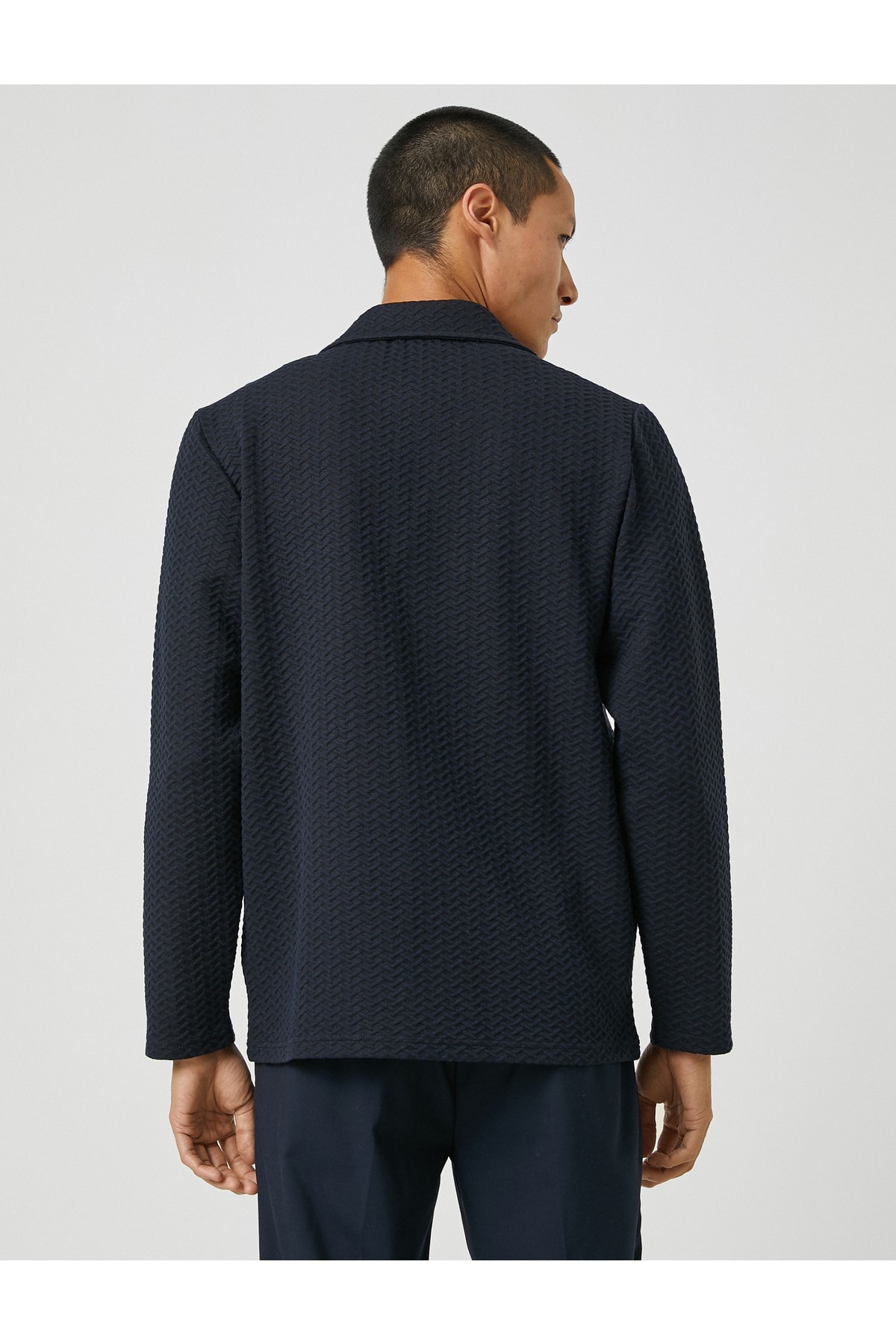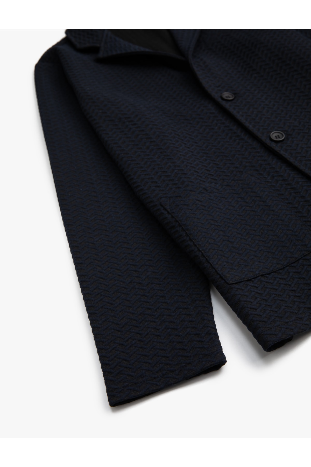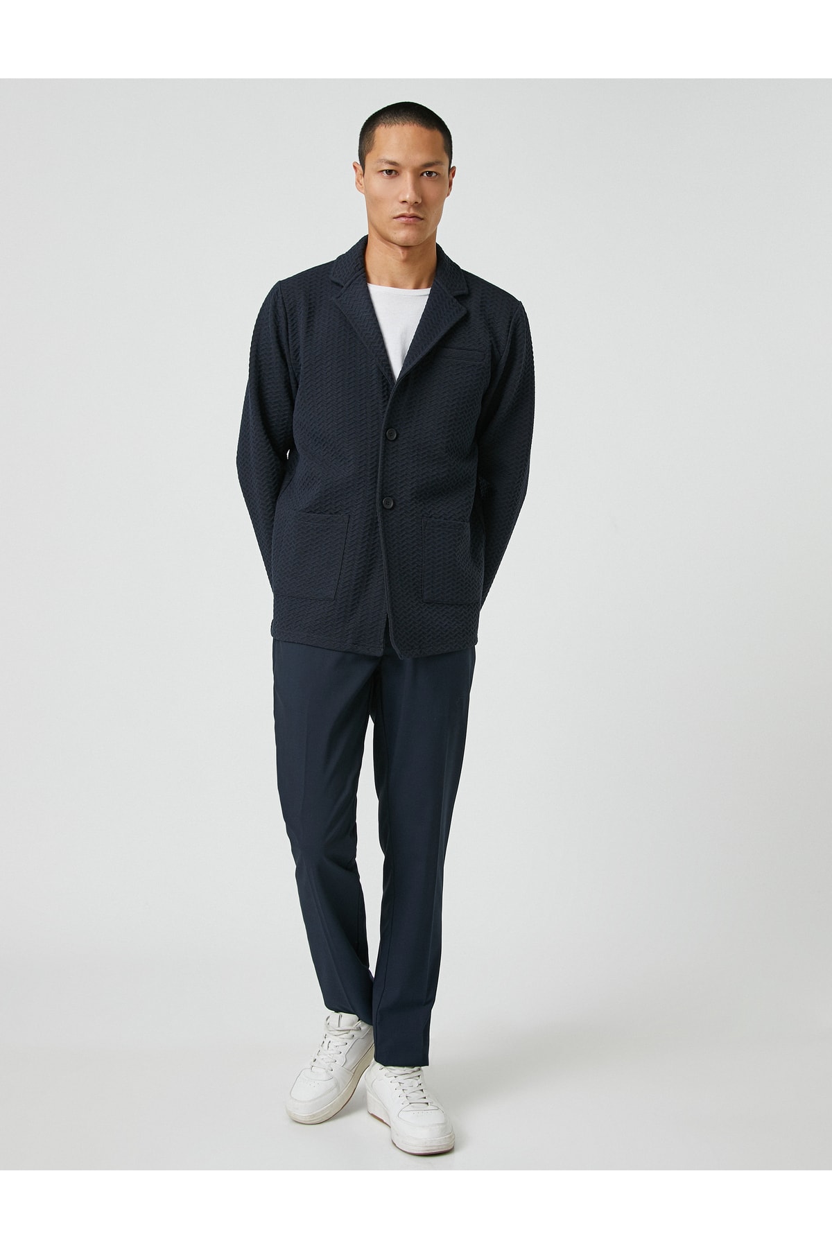 Cep detaylı, geniş yaka, düğmeli, dokulu basic ceket.
