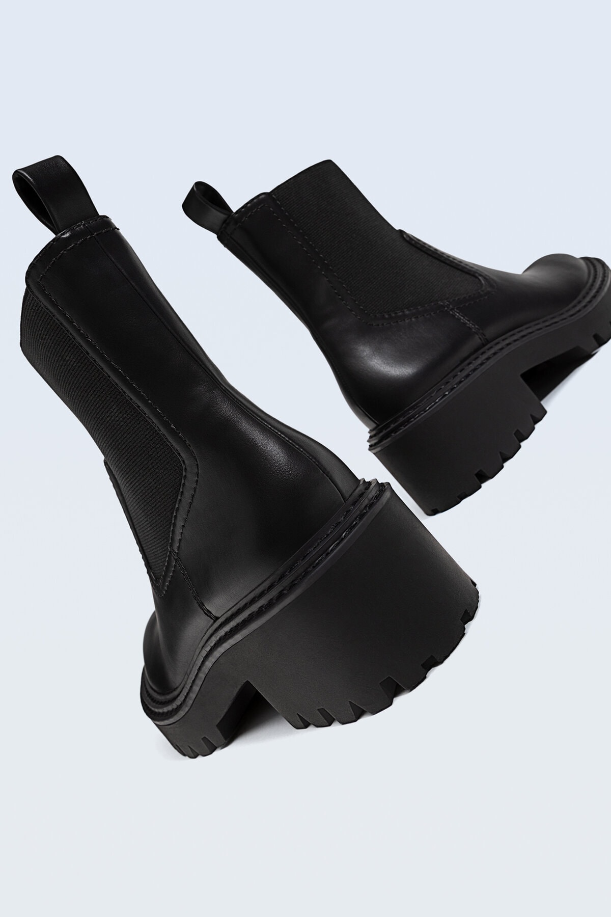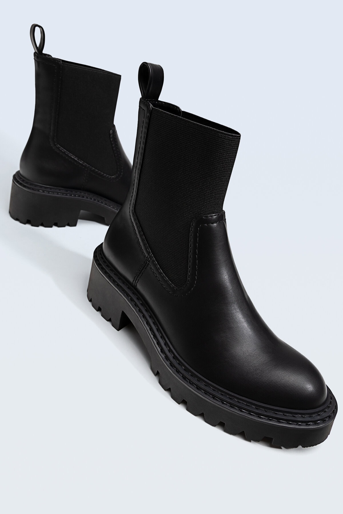 Düz bot. Siyah rengi mevcut. Arkası çekecekli. Dikiş detaylı ve yanı ve önü elastik bantlı. Tırtıklı tabanlı.