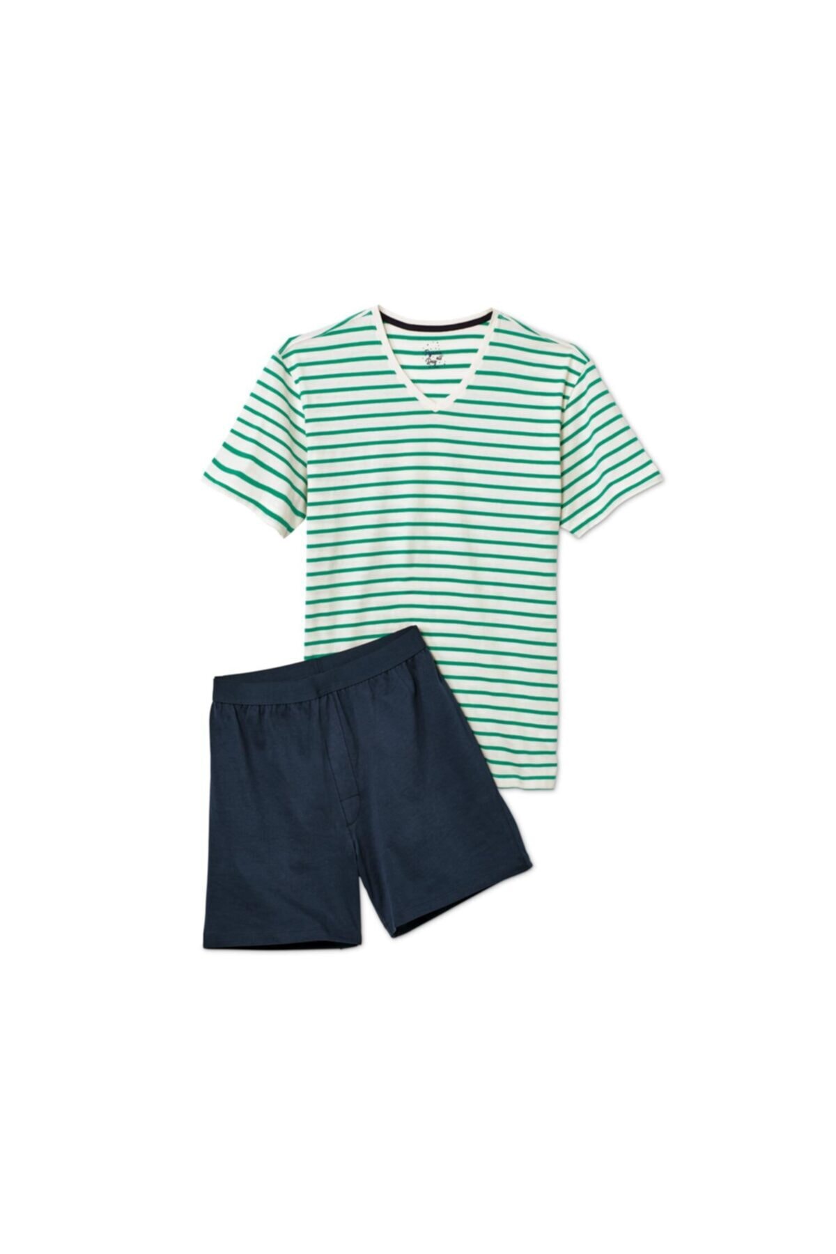 Organik Pamuklu Yumuşak Single Jersey Kısa Pijama Takımı Kesim: Normal kesim Renk: Üst kısmı beyaz-yeşil çizgiliAlt kısmı lacivert Malzeme: %100 pamuklu (organik tarımdan) Ölçüler: Üst kısmın toplam uzunluğu yakl. 77 cmAlt kısmın iç bacak uzunluğu yakl. 16 cm (L 52/54) Organik pamuktan kısa pijama takımı|Yumuşak Single Jersey kumaş|V yakalı üst |Elastik bel lastikli pijama altı|GOTS sertifikalı
