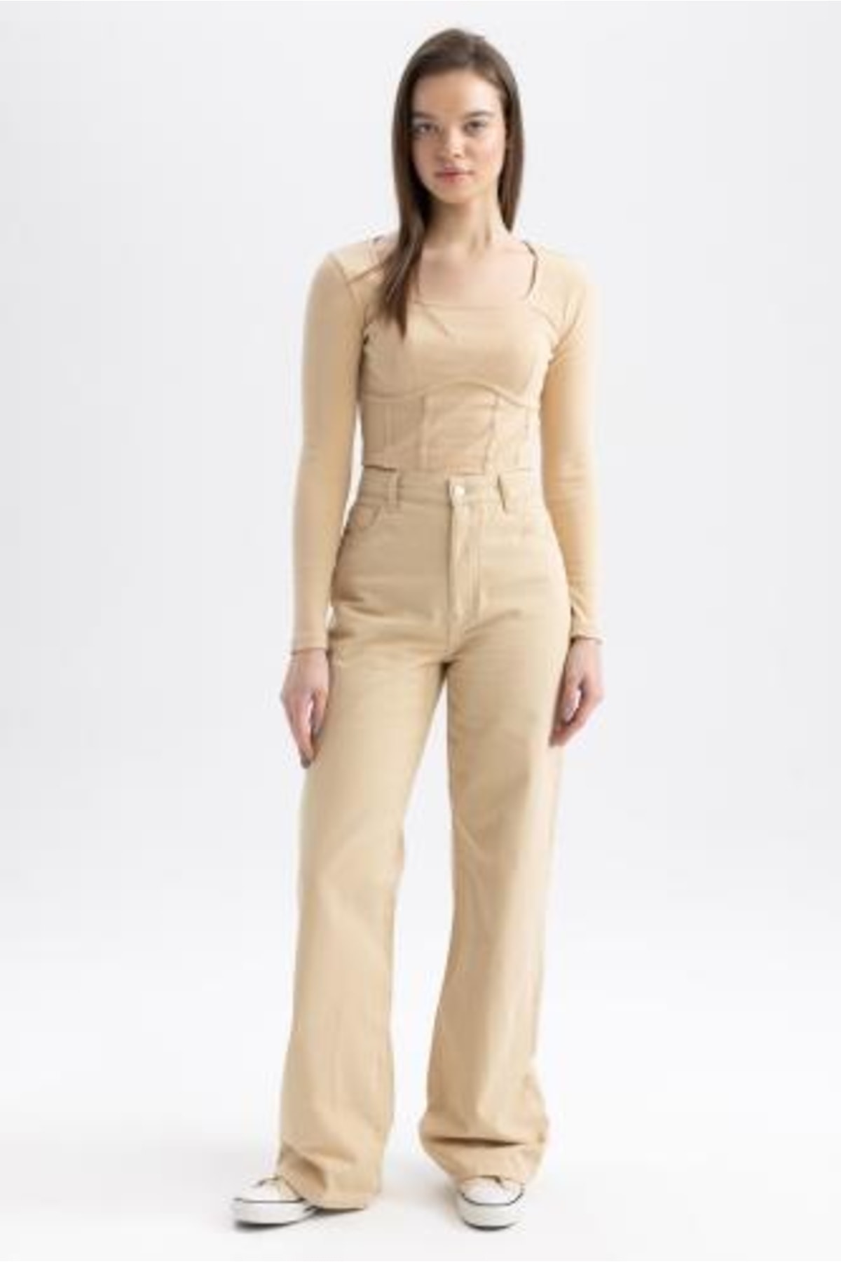 Wide leg tasarımıyla ve gabardin pamuklu kumaşıyla kolayca fit bir görünüm sağlayan modeli ile her tarz crop, tişört, kazak ve gömlekler ile kolayca kombinleyip tarz bir görünüm sağlayabileceğiniz, yüksek bel cep detaylı DeFacto Kadın Wide Leg Geniş Paça Gabardin Pantolon.