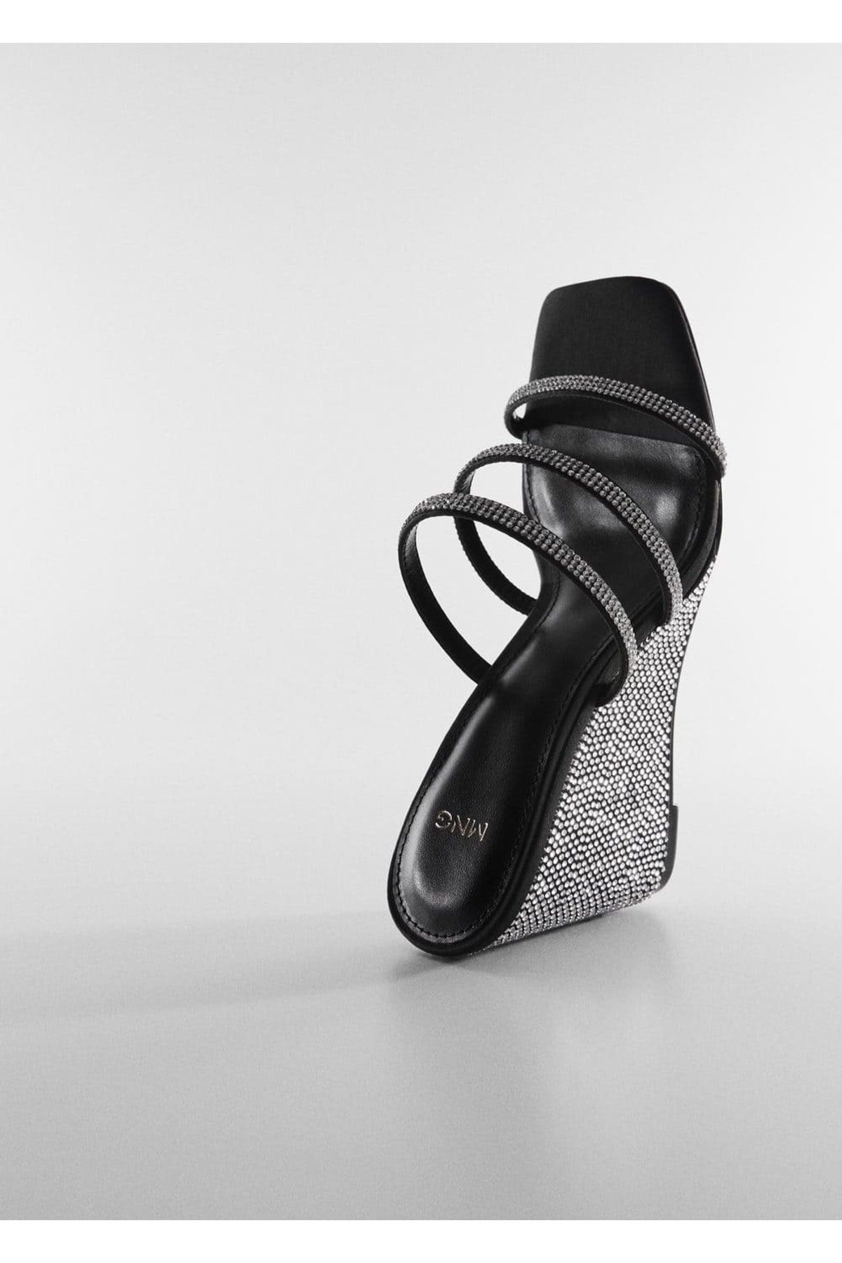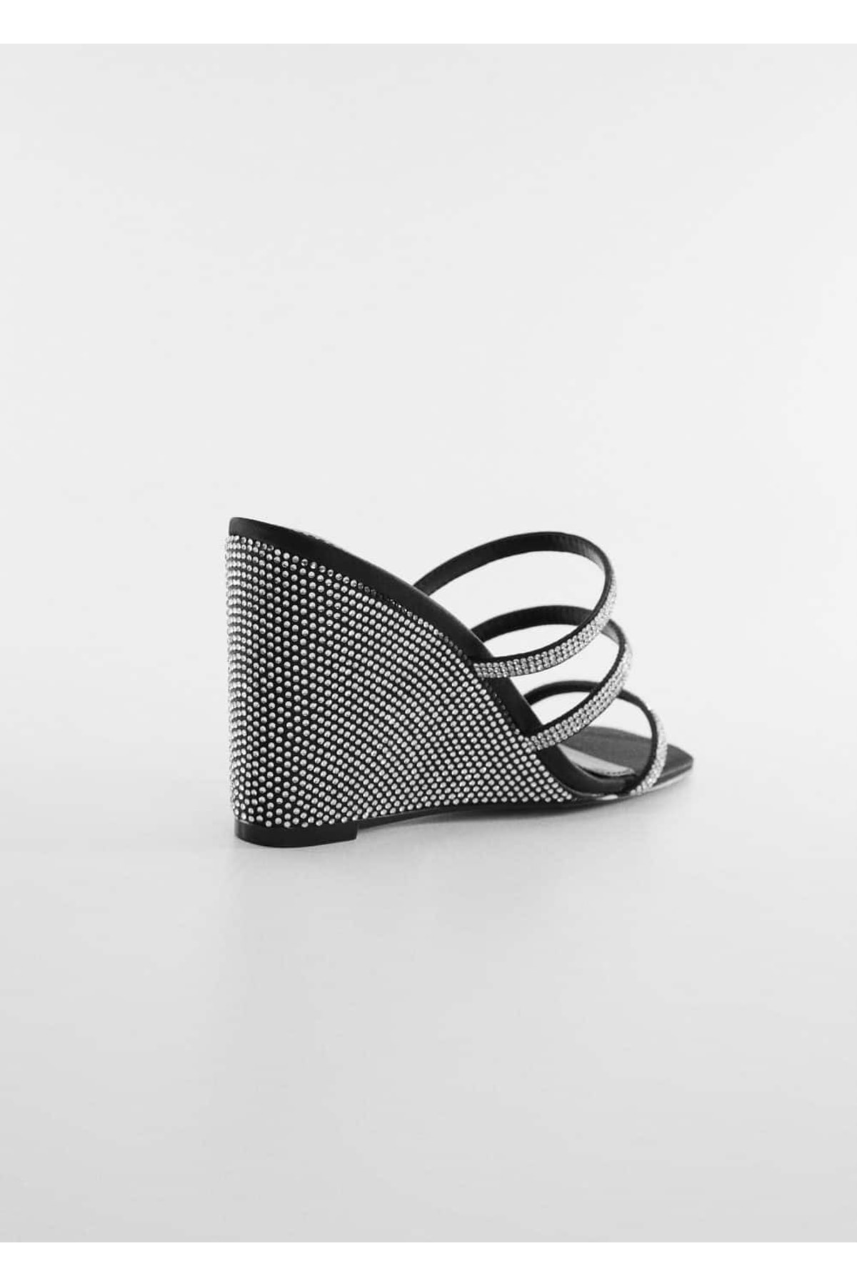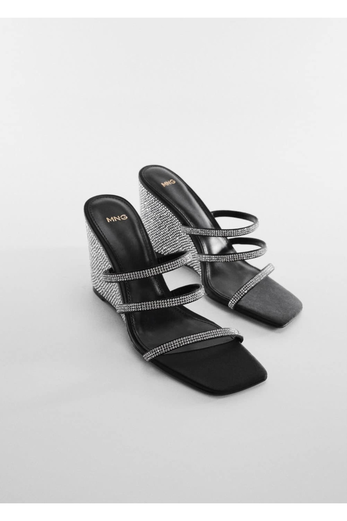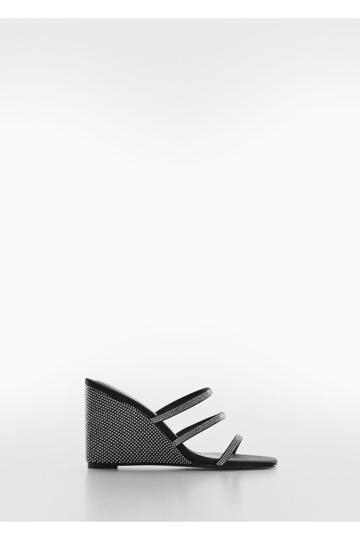 Sandalet .-- Flas. Kare uçlu, dolgu topuk, stras taşlı, kapamasız, 10 cm topuk. 100% polyester, astar: 100% poliüretan, süs esyasi: 100% cam, ayakkabitabani: 56% poliüretan,44% polyester, ana kumas: 100% termoplastik, yama astari: 100% agac