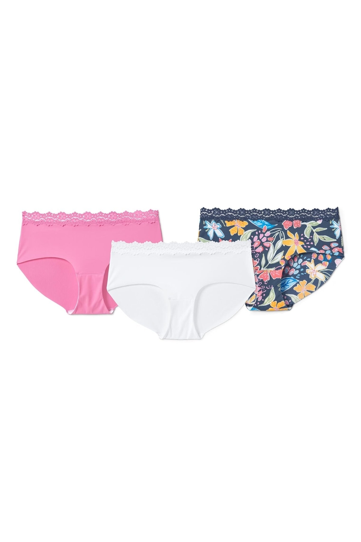 3 Adet Magic-Cut Külot Renk: 1x beyaz, 1x pembe, 1x çok renkte çiçek baskılı lacivert Malzeme: %75 poliamit, %25 elastanDantel %85 poliamit, %15 elastan Kenarları son derece düzdür – iz yapmaz|Zarif dantelli bel bandı|Son derece hafif Microtouch kumaştan – yüksek giyim konfor için neredeyse hissedilmez|Uzun ömürlülük ve yıkamaya dirençlilik için kaliteli marka elastanlı|Ağ kısmı pamuklu