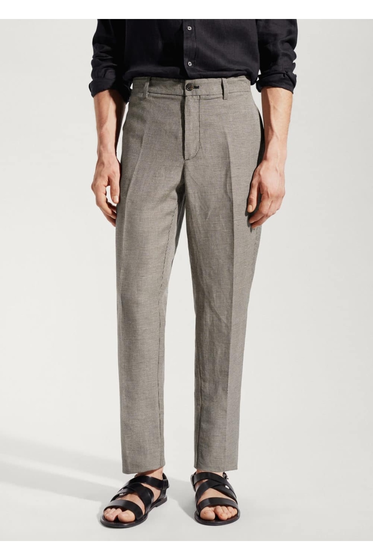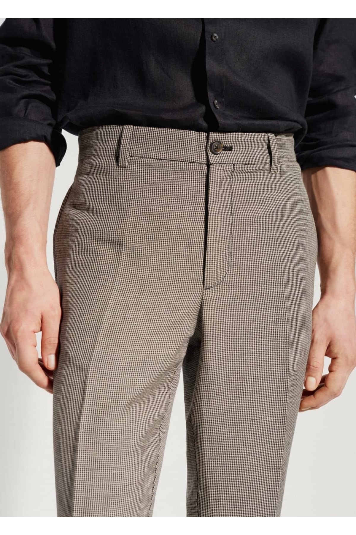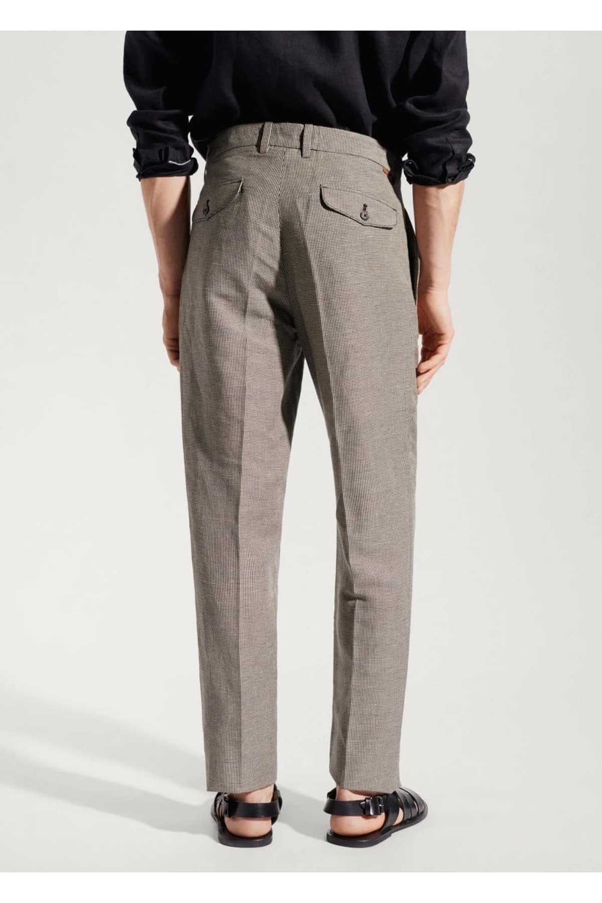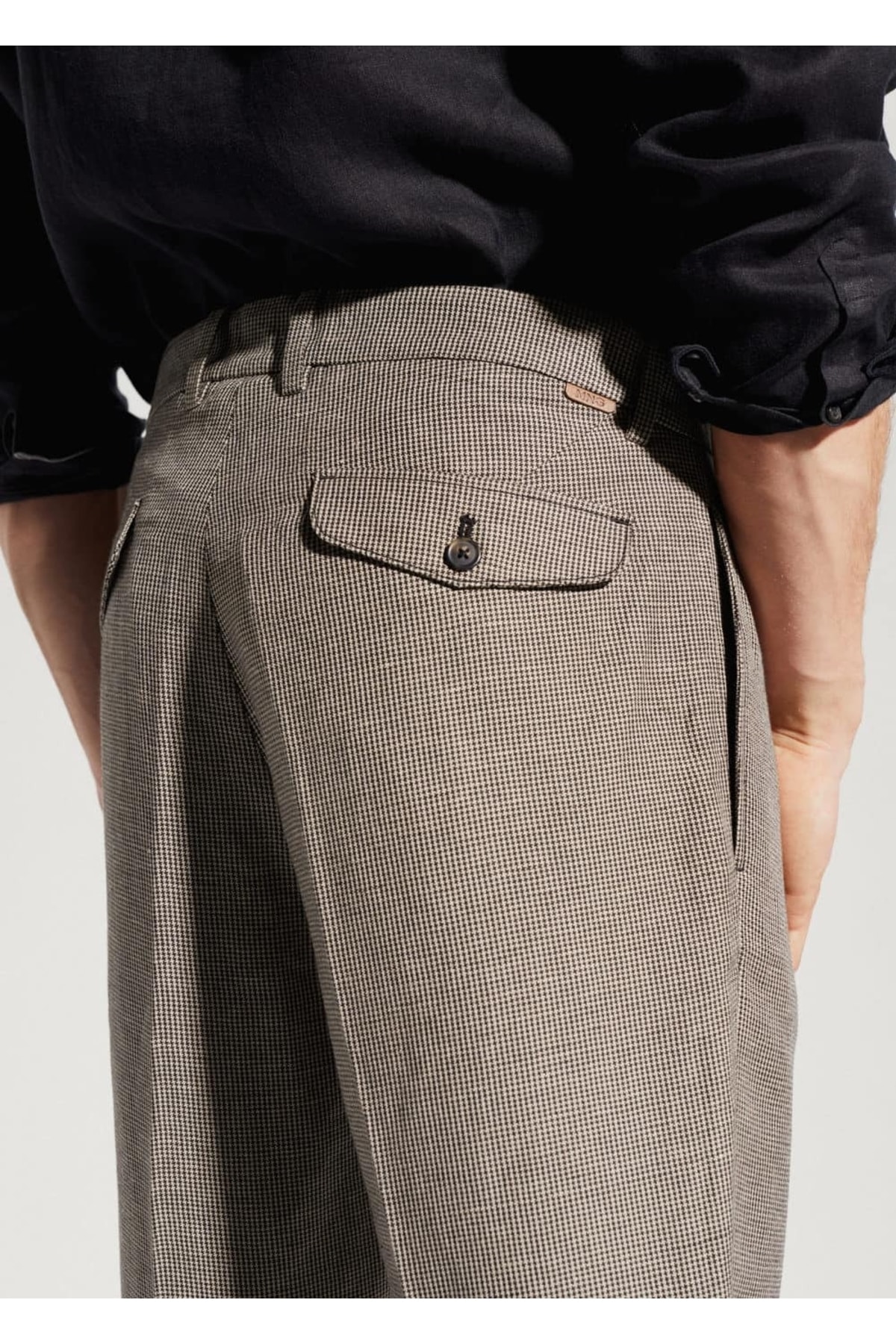 Pantolon .-- cid. Dar kesim, Keten karışımlı kumaş, Mini kazayağı desenli, Fermuarlı ve düğmeli, Kemer köprülü, İki ön cep, Önü pilili, Kapaklı iki arka cepli, Düz paça. 51% keten,49% viskoz, Astar cebi: 100% pamuk. İç bacak ölçüsü 72.4 cm, Yan dikiş uzunluğu 97.9 cm. MAKİNEDE MAKS. 30°C'DE YIKAYIN, ÇAMAŞIR SUYU KULLANMAYIN, MAKS. 110°C İLE ÜTÜLEYİN, KURU TEMİZLEME YAPILMAZ, KURUTMA MAKİNESİNDE KURUTULAMAZ