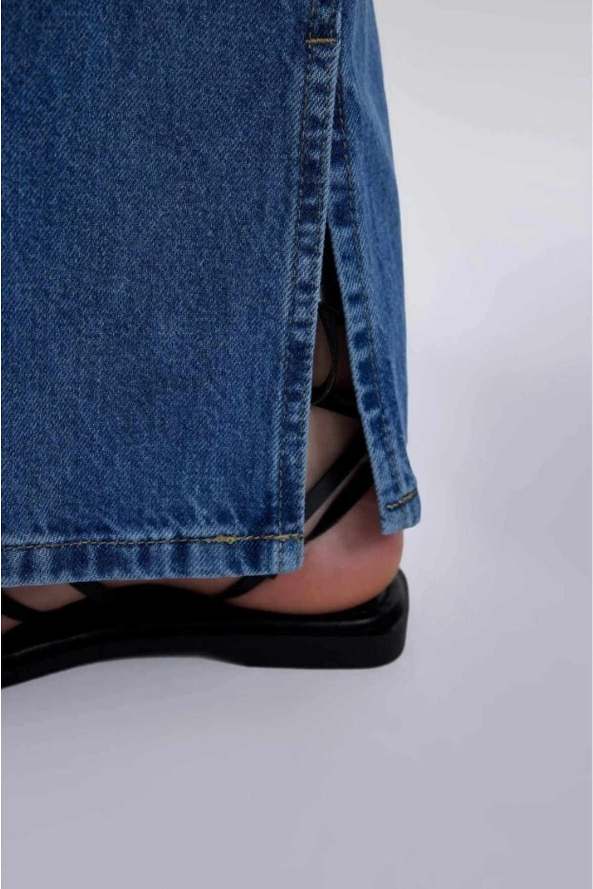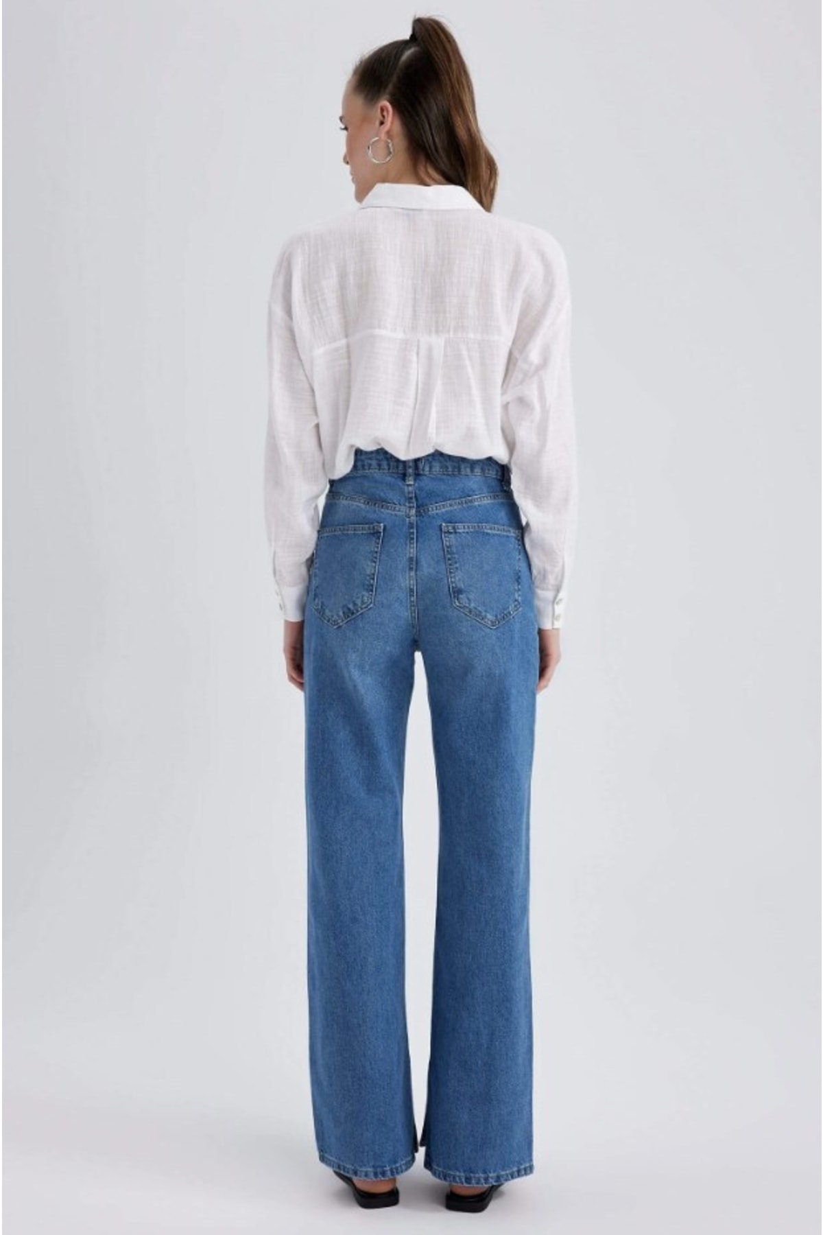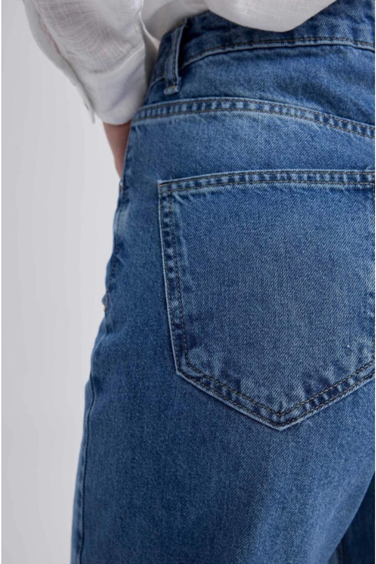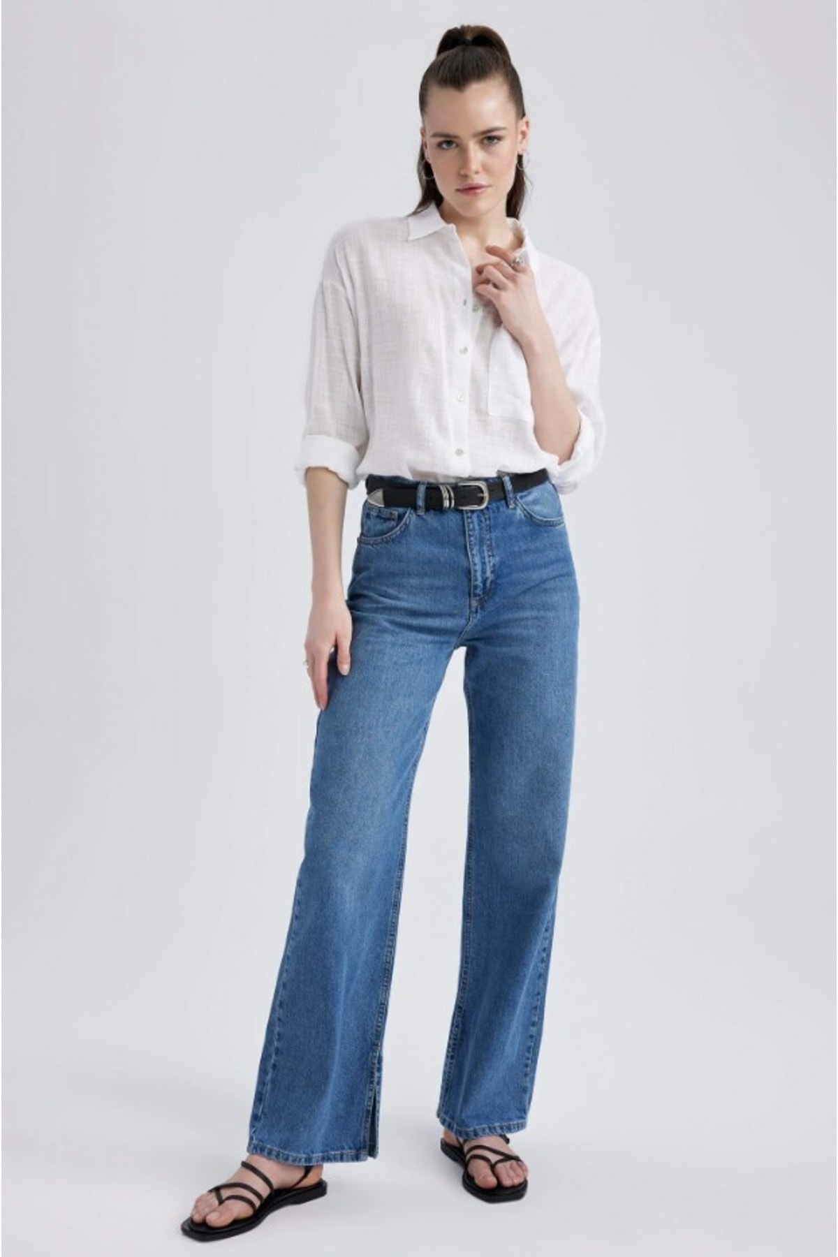 Rahat wide leg kesimi ile yırtmaçlı tasarımıyla pamuklu jean kumaşıyla aynı zamanda hem konforlu hem trend görünebileceğiniz, crop tişört, sweatshirt, askılı bluz ya da gömleklerle kombinleyebileceğiniz, zamansız jean parçalardan DeFacto Kadın 90's Wide Leg Yırtmaçlı Jean Pantolon+