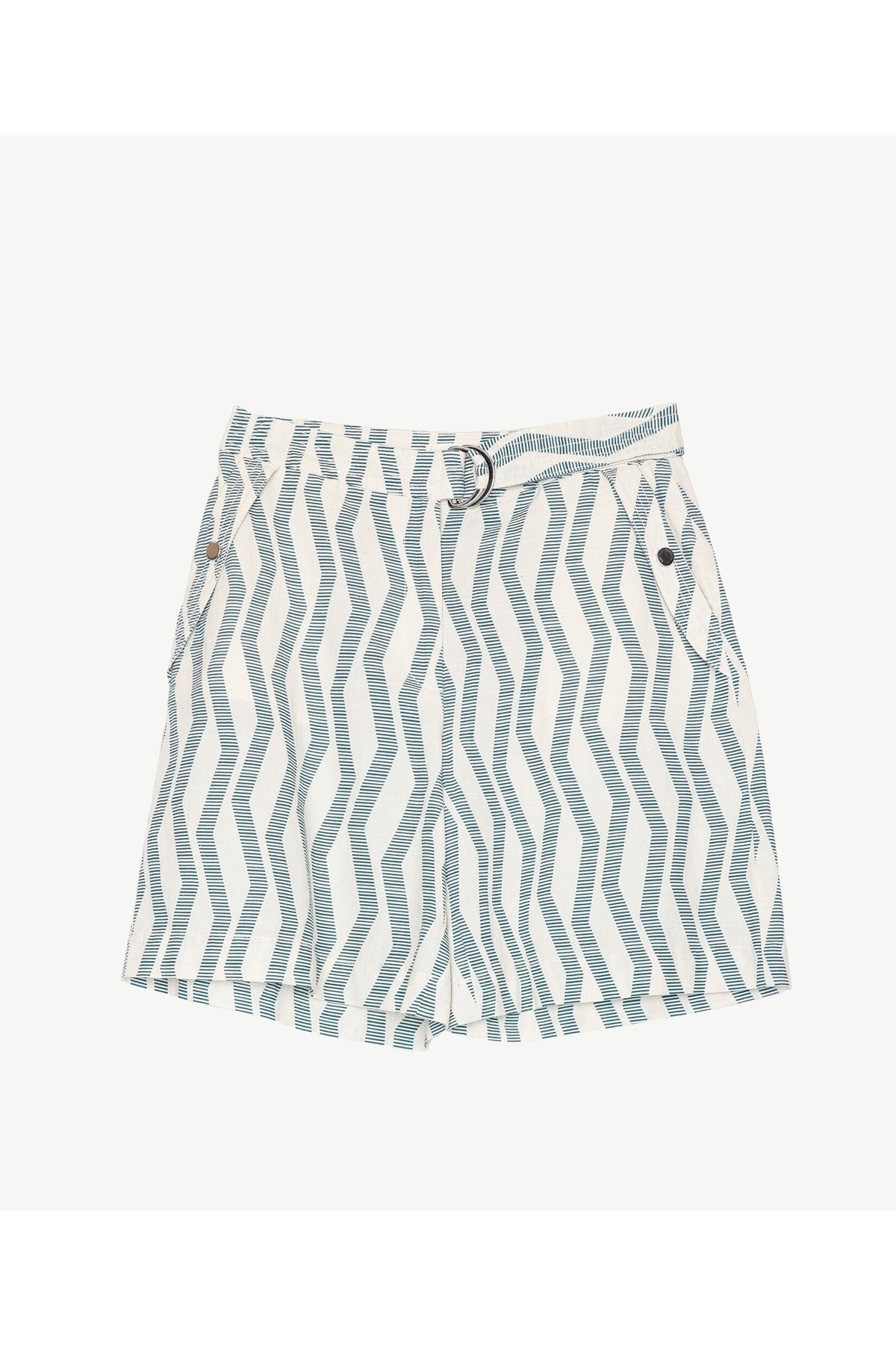 Materyal: 86-pamuk-14-keten | Ürün Ölçüleri: Şort kumaşında yer alan keten ve pamuğun birleşimi natüralist bir tarz yaratıyor. Ekru üzerine yeşil desenli şortu askılı orlon bir bluz ile eşleştirebilir, cep kapakları ve kemer tokasındaki metalik detayları genel konseptte de sürdüren gümüş tonlu aksesuarlarla kombininizi tamamlayabilirsiniz.