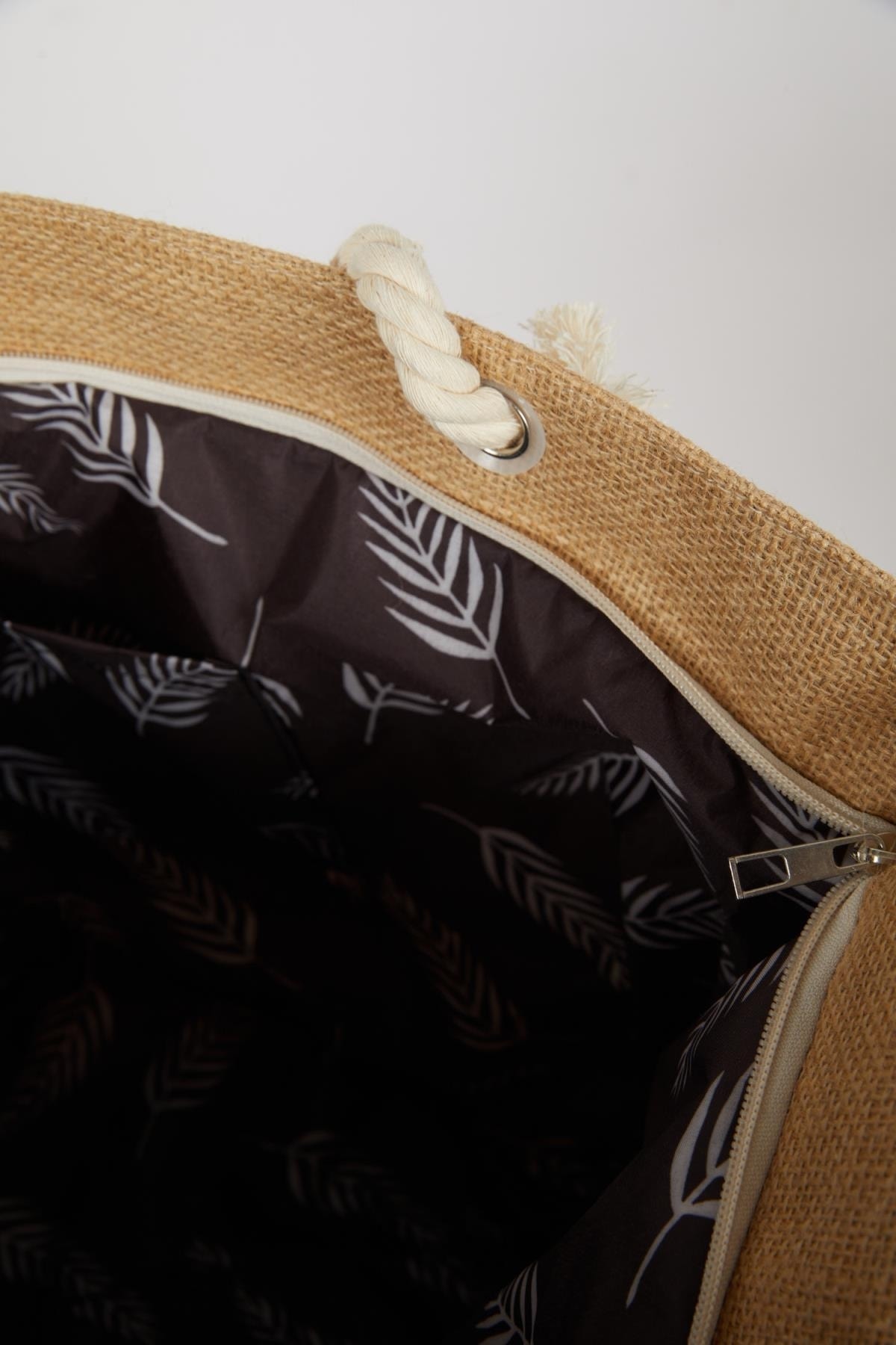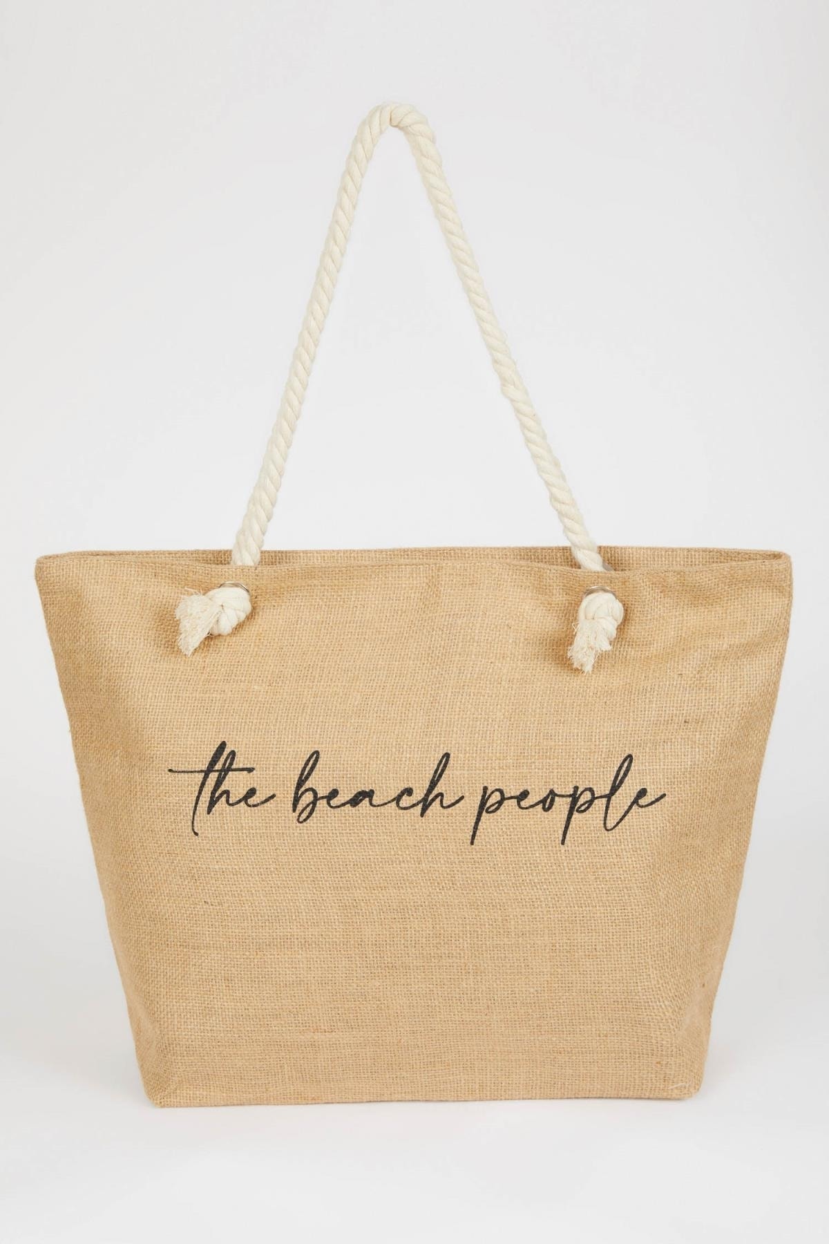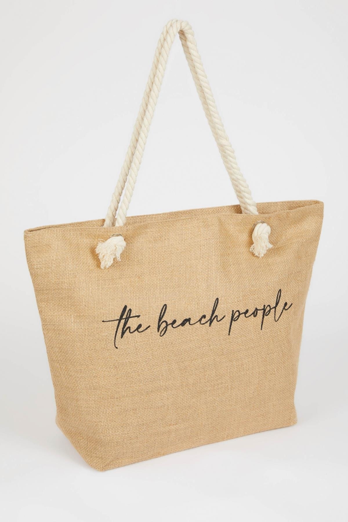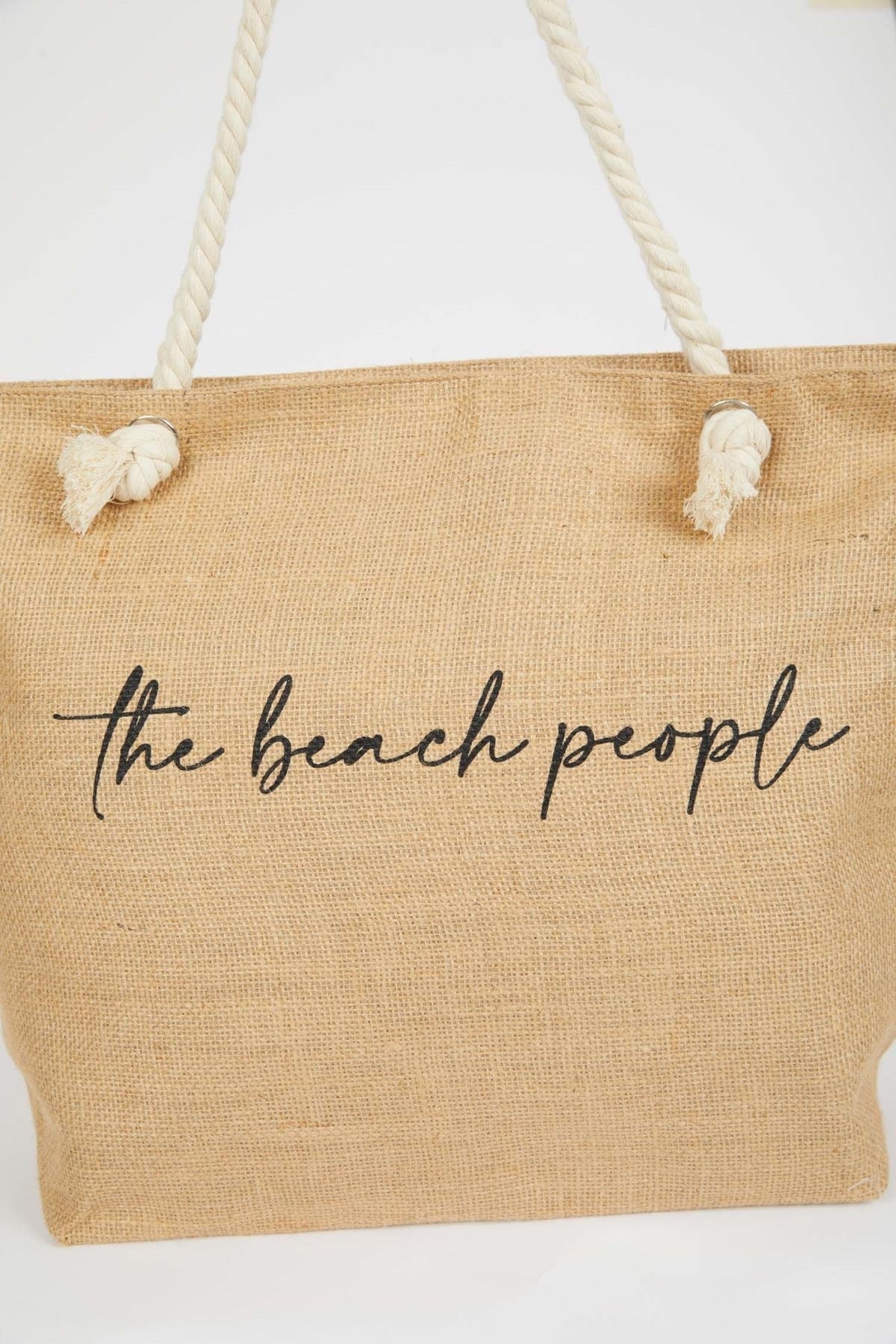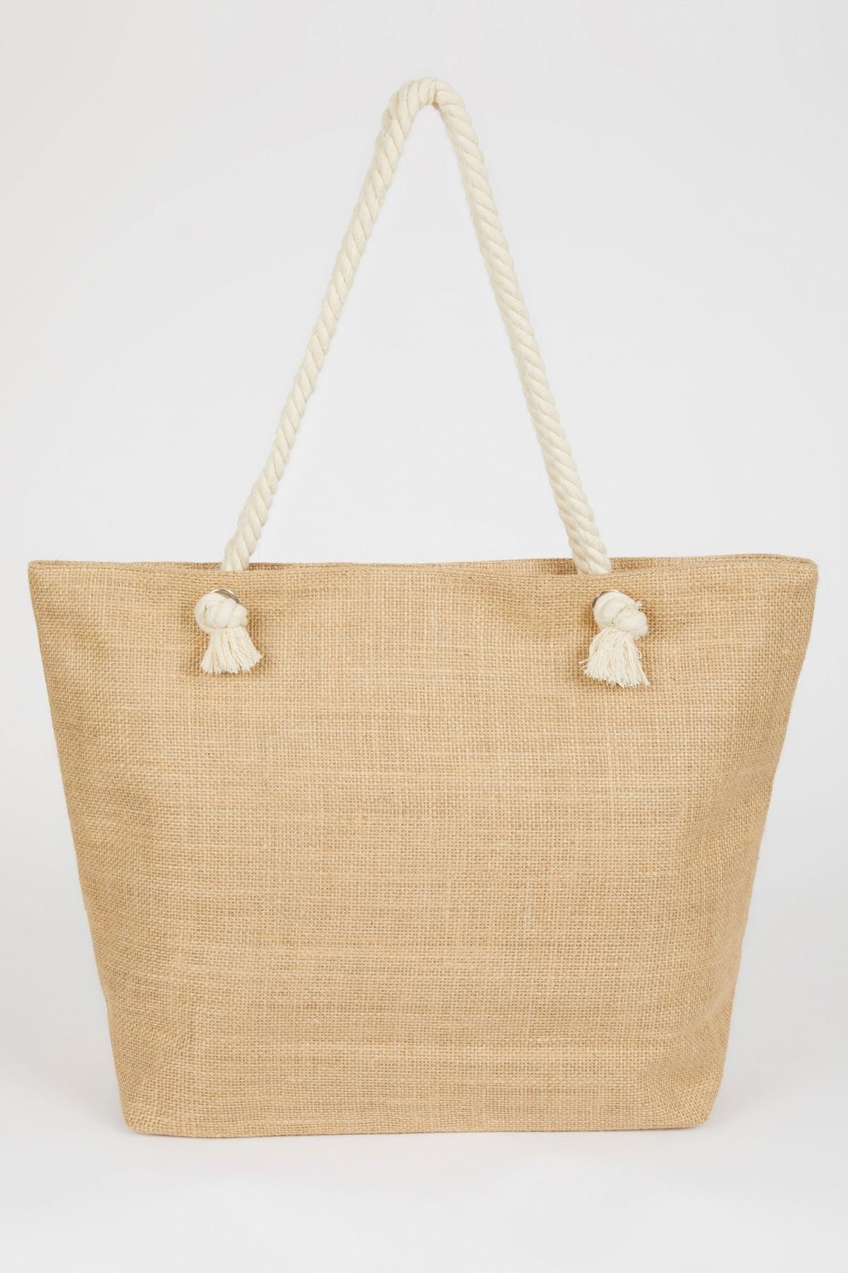 Bej renkli baskılı büyük hacimli ve halat ip askılı modeli ile mayo ve bikinilerinizle kombinleyeceğiniz şık tasarıma sahip bu yaz vazgeçilmeziniz olacak DeFacto Kadın Plaj Çantası.