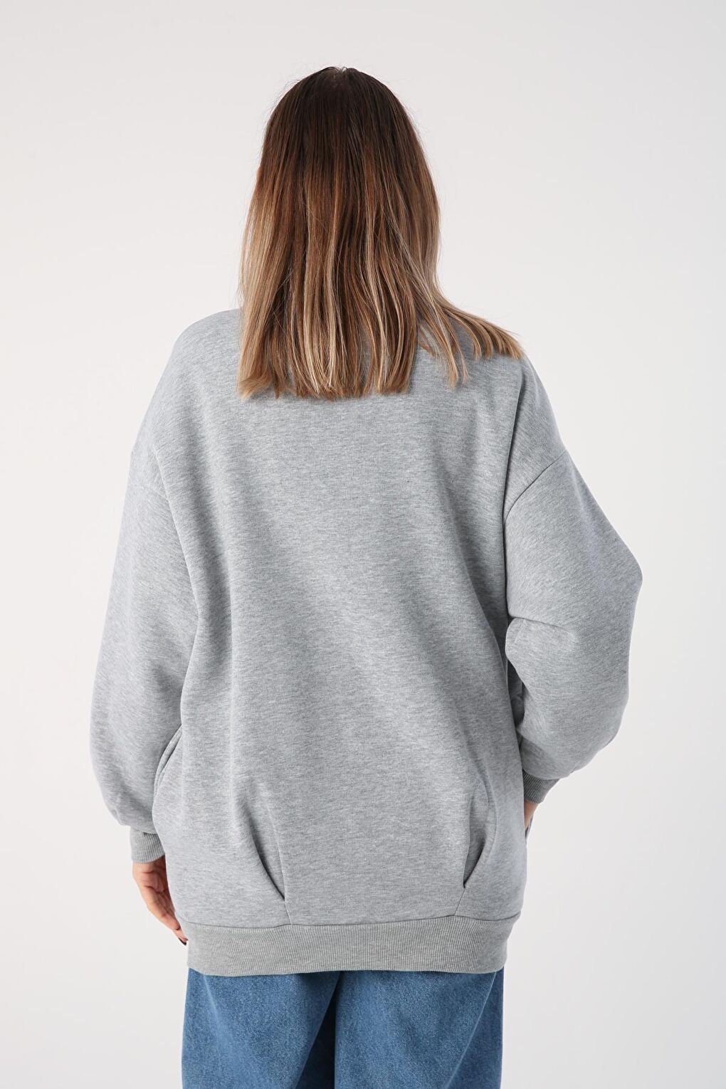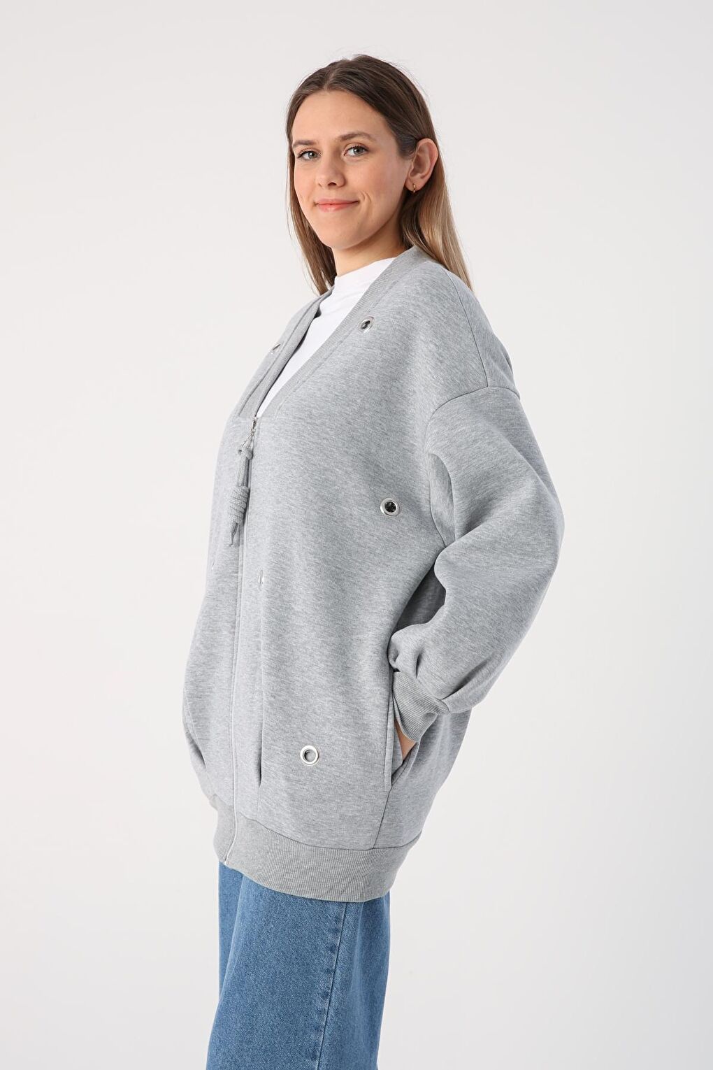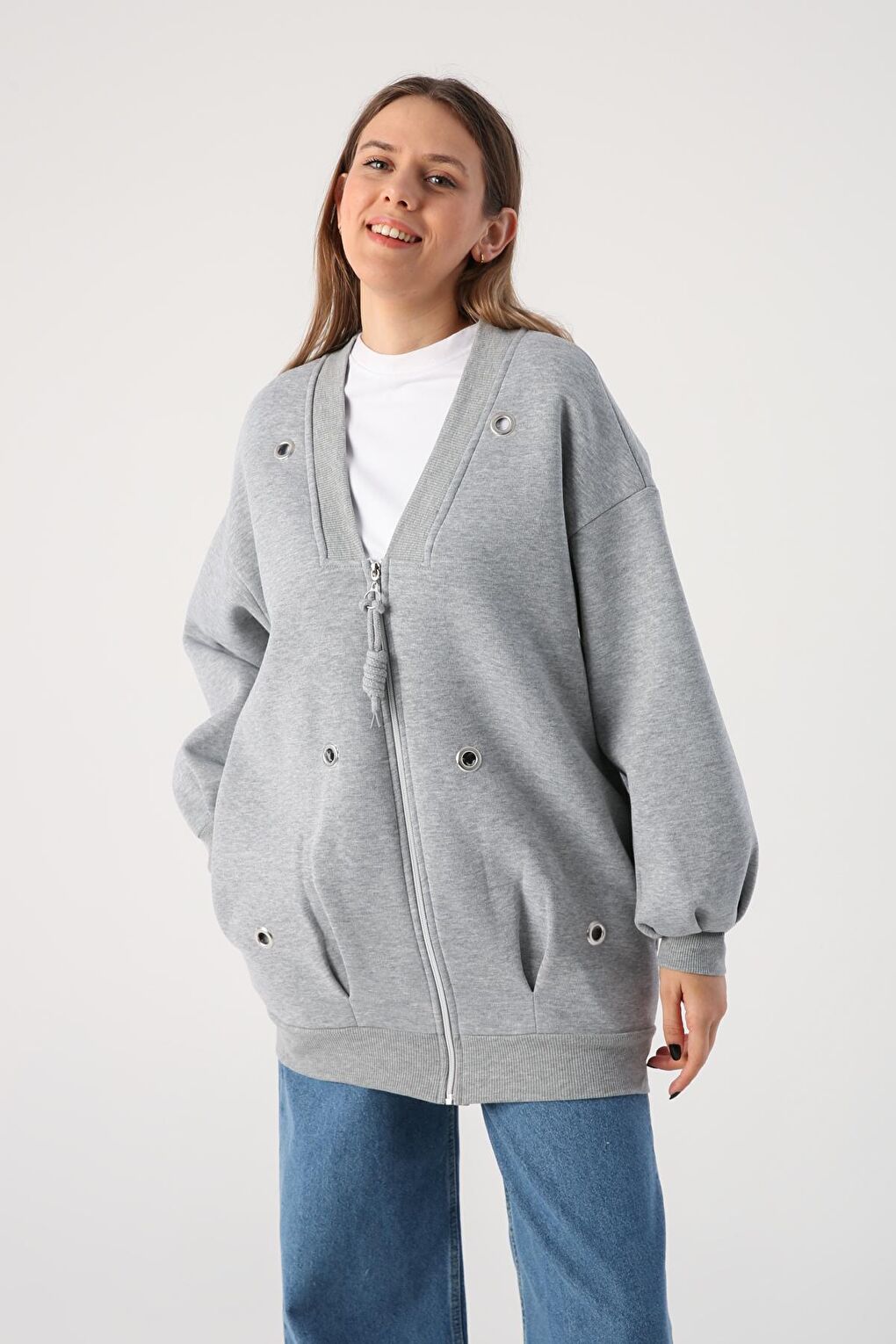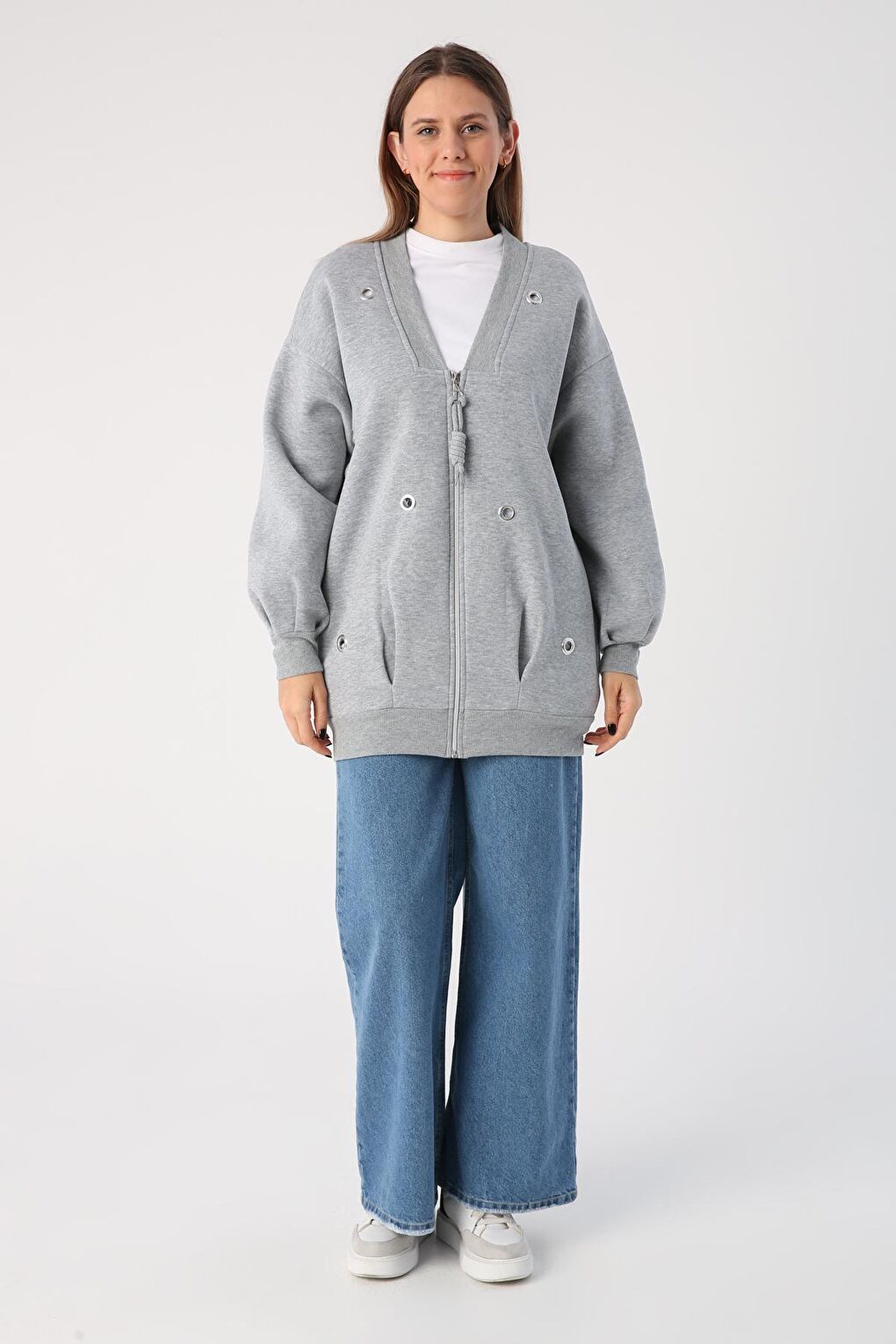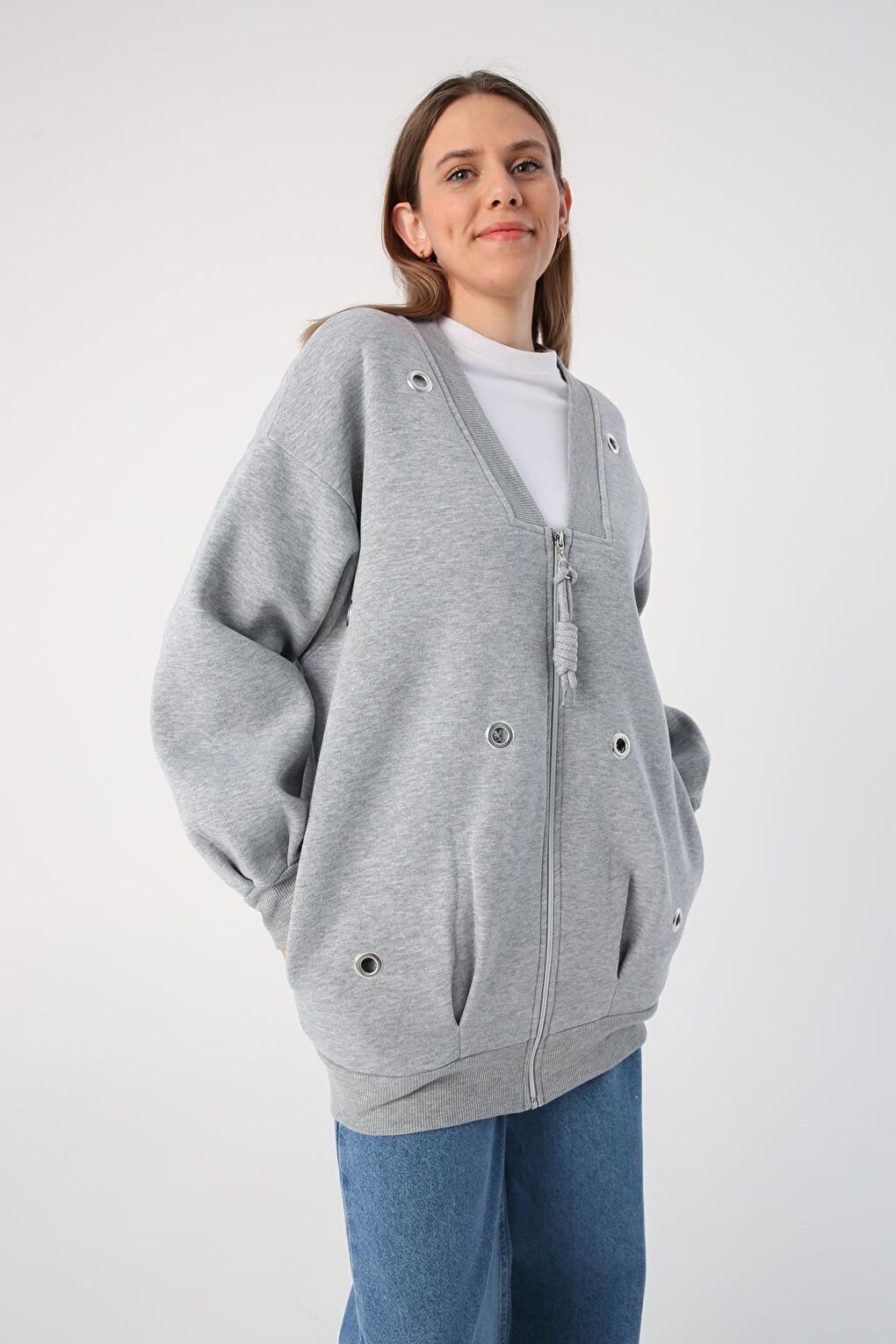 - نام : Gri Melanj V Yaka Kuşgözü Detaylı Şardonlu Fermuarlı Hırka