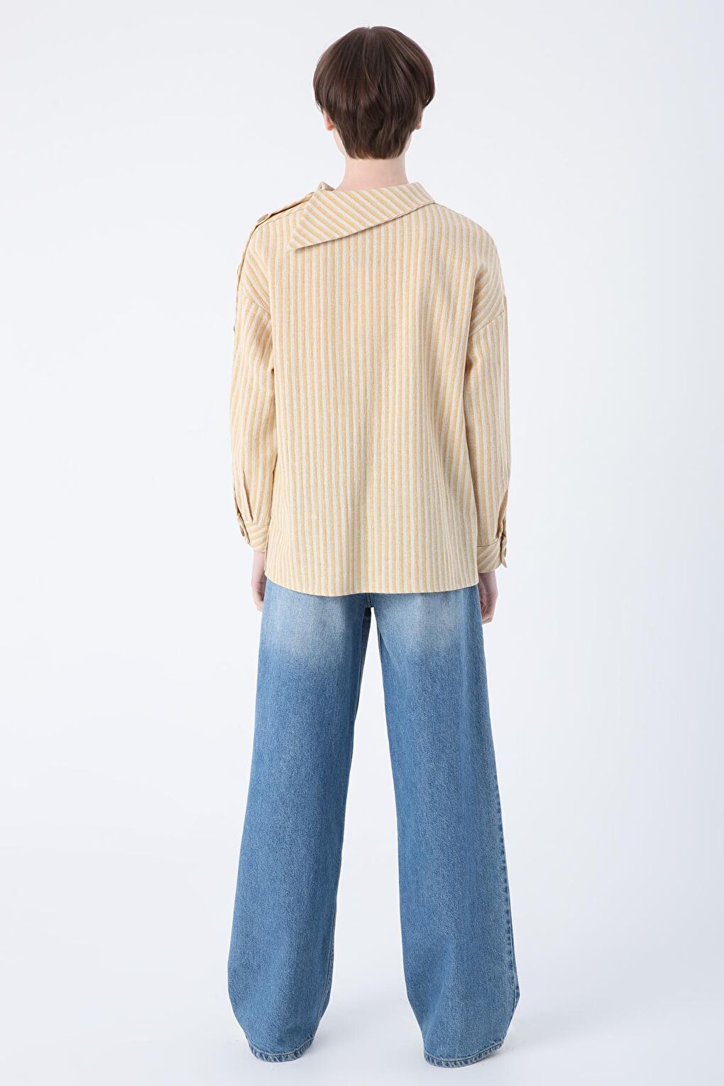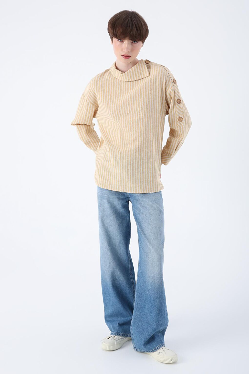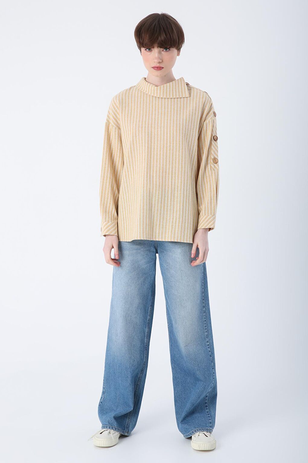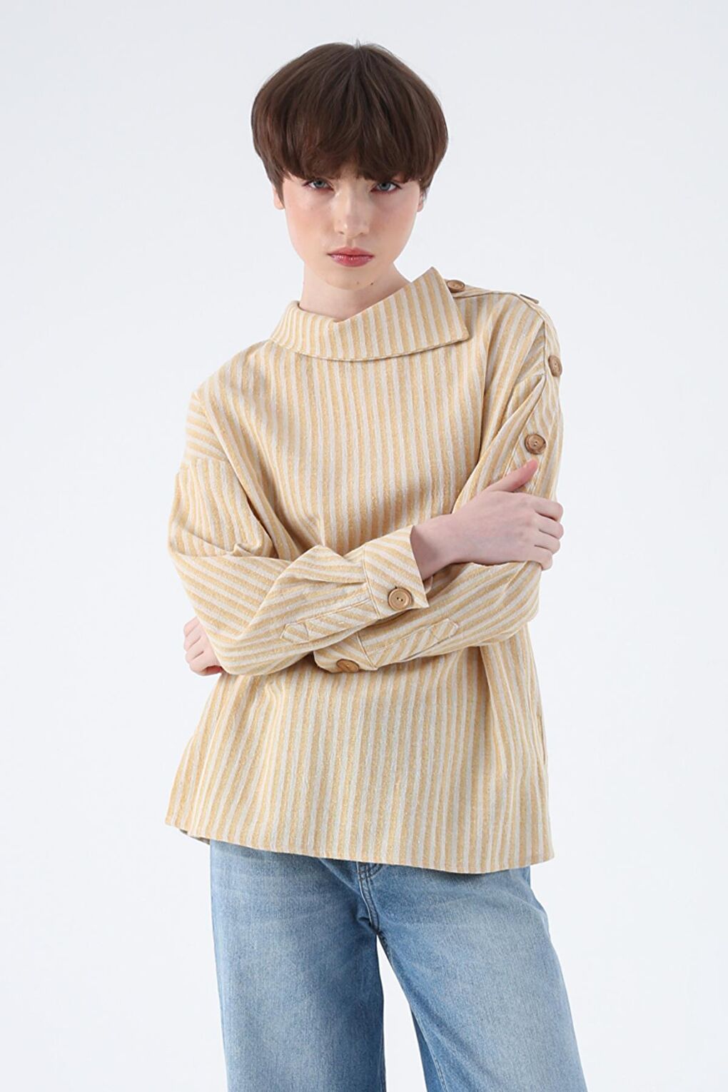 - نام : Sarı Pamuklu Omuzdan Düğmeli Çizgili Bluz