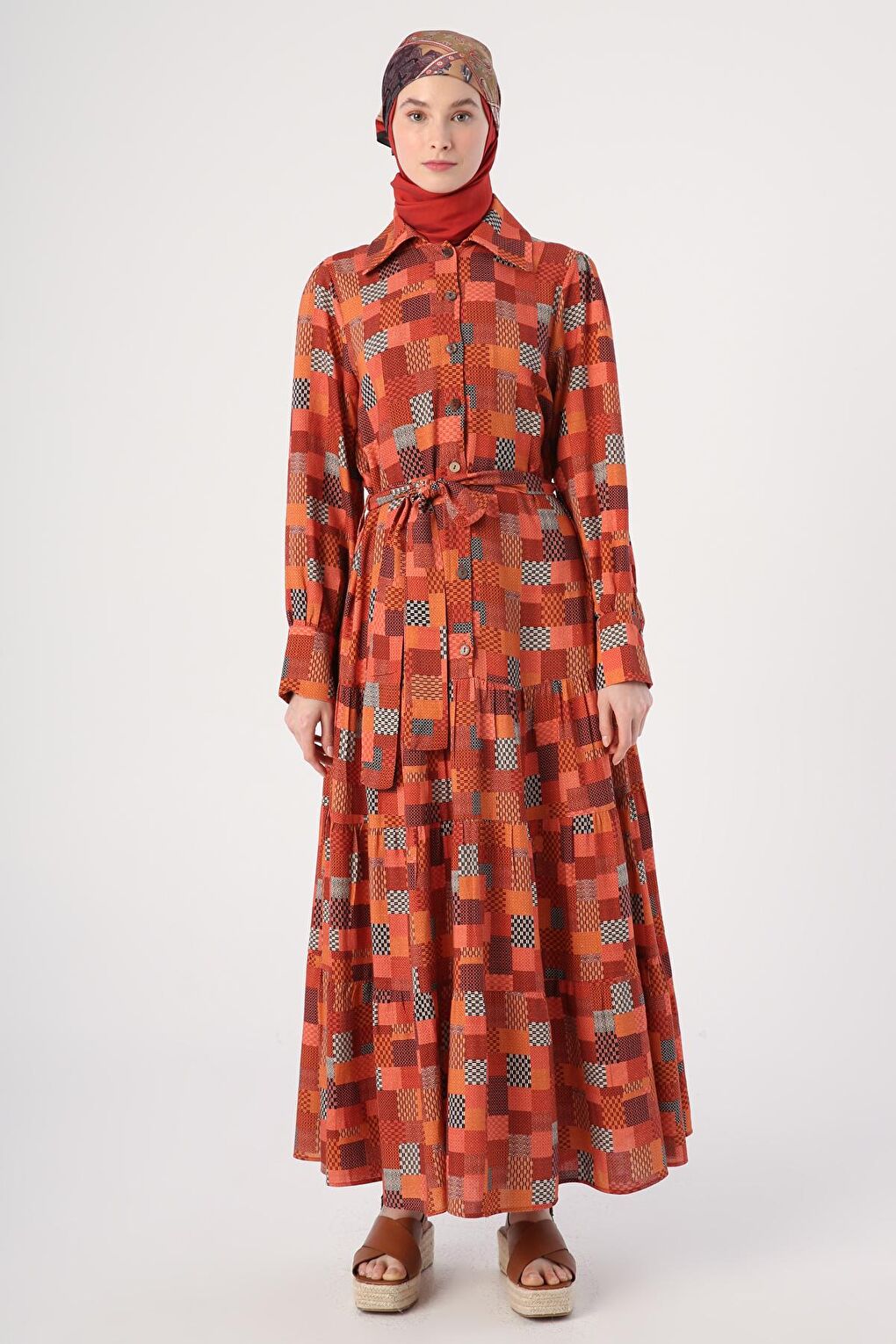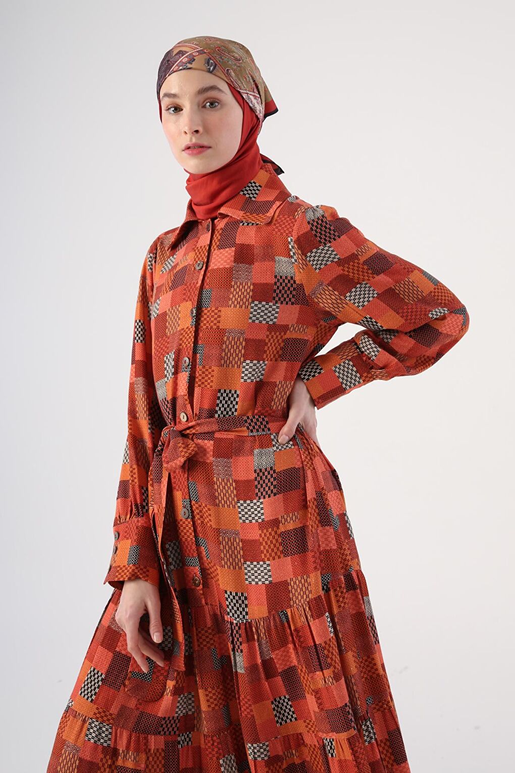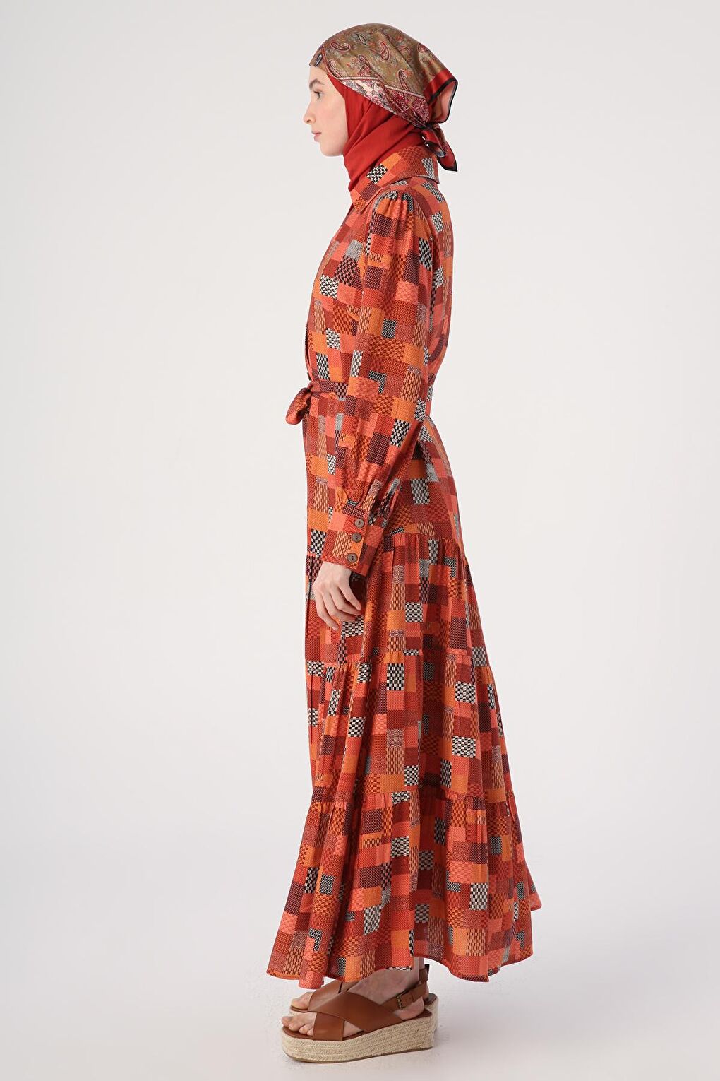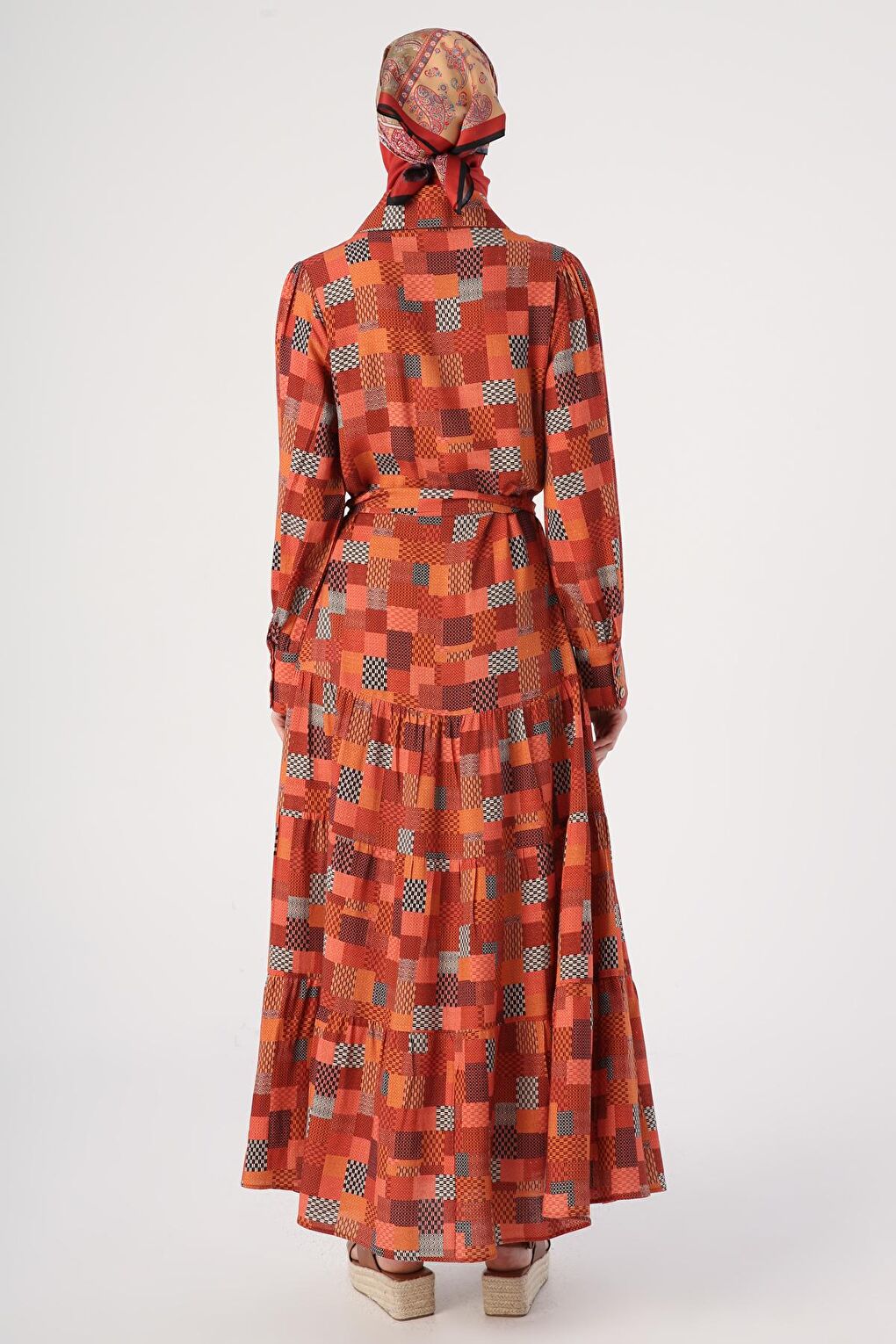 - نام : Kiremit-Siyah Kuşaklı Eteği Fırfırlı Emprime Desen Gömlek Elbise