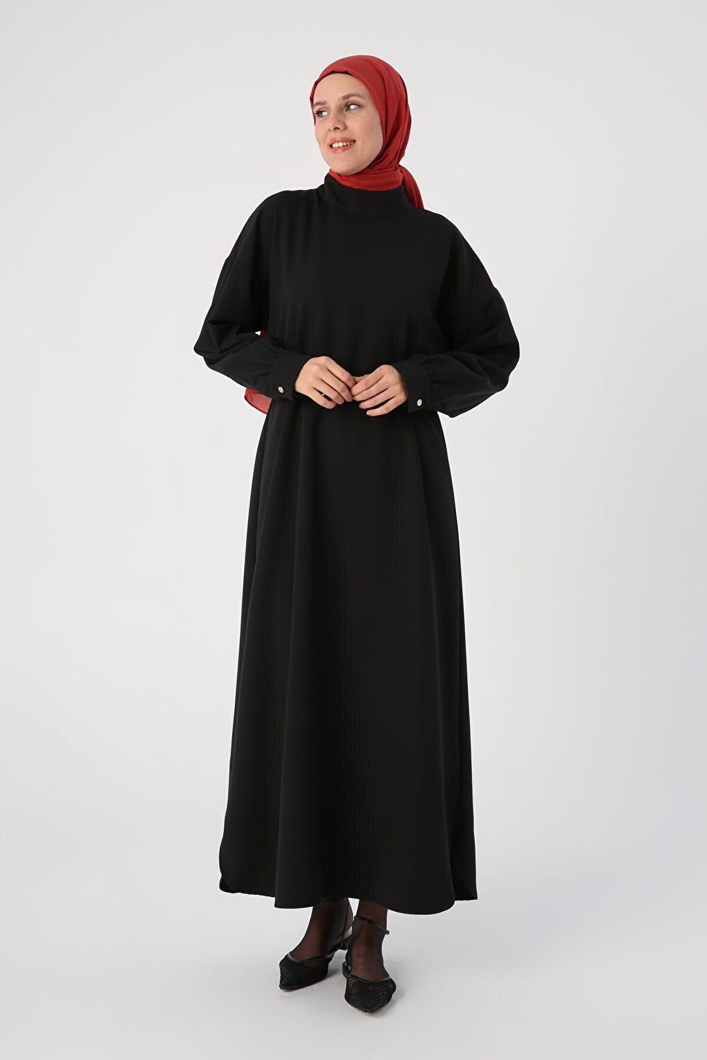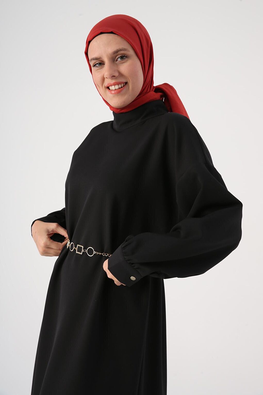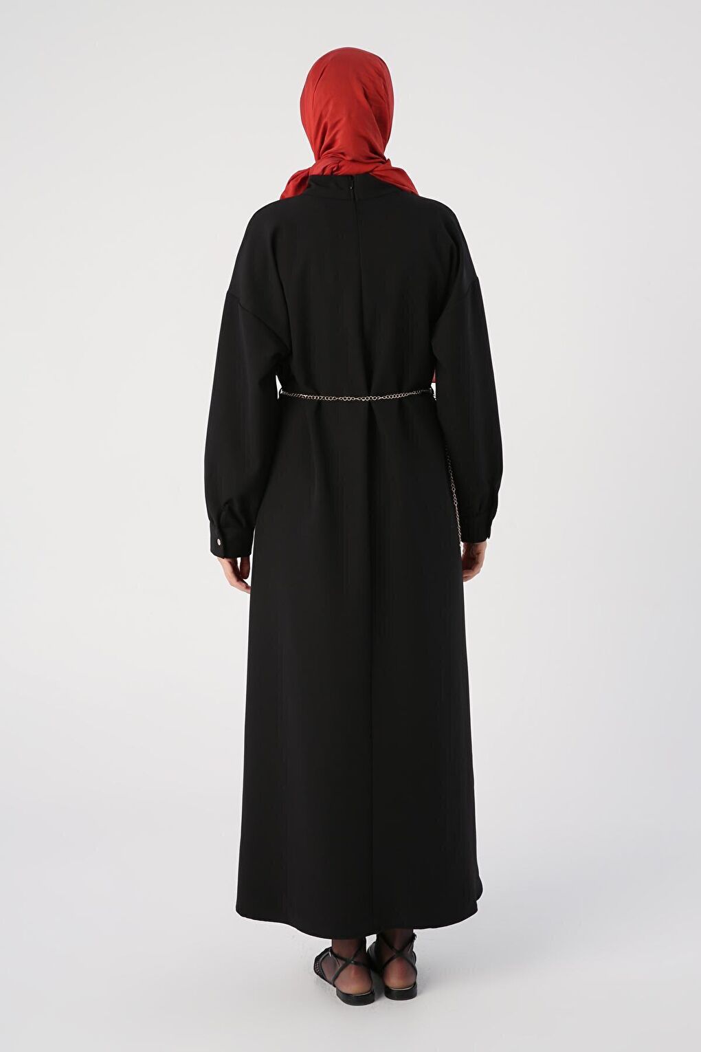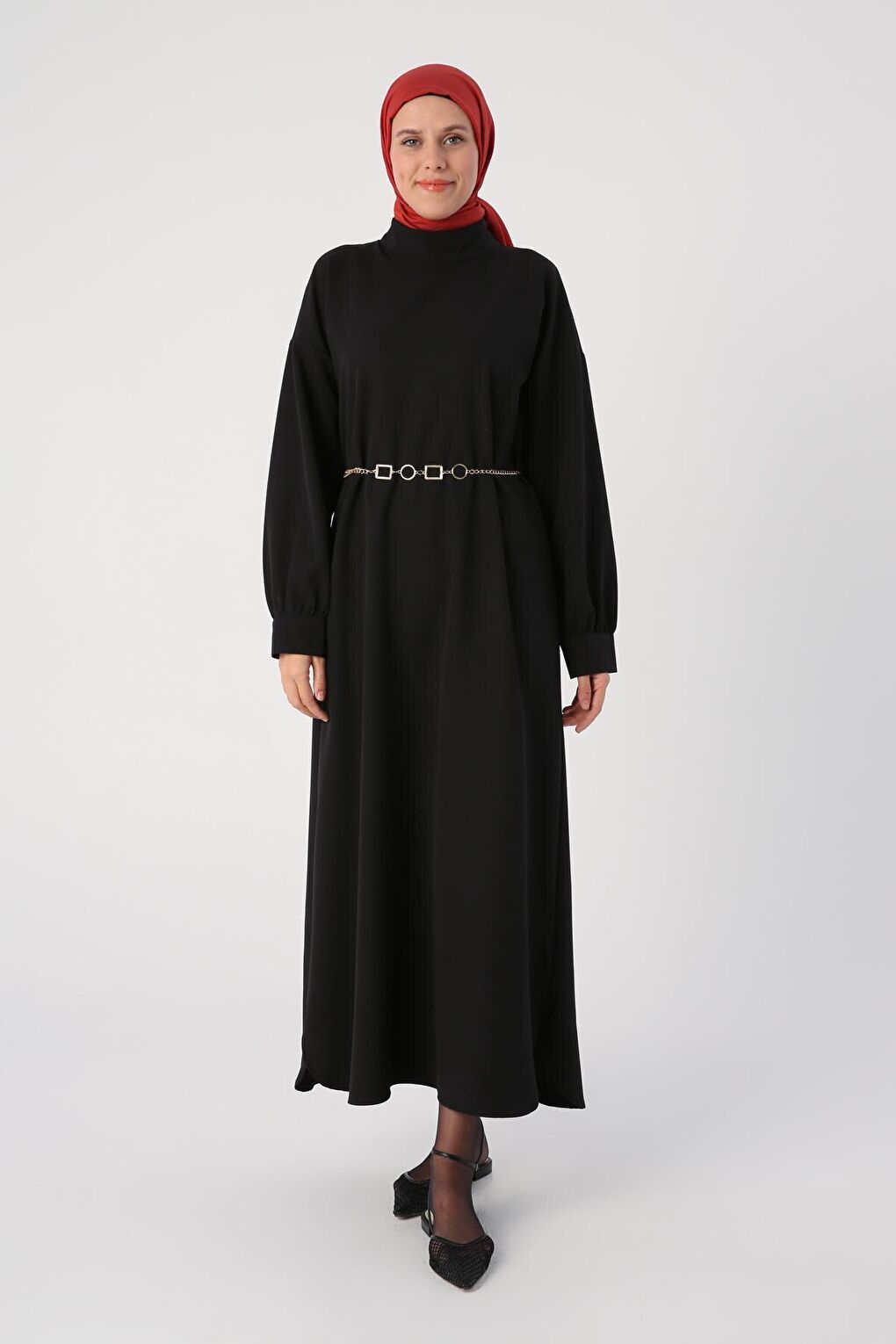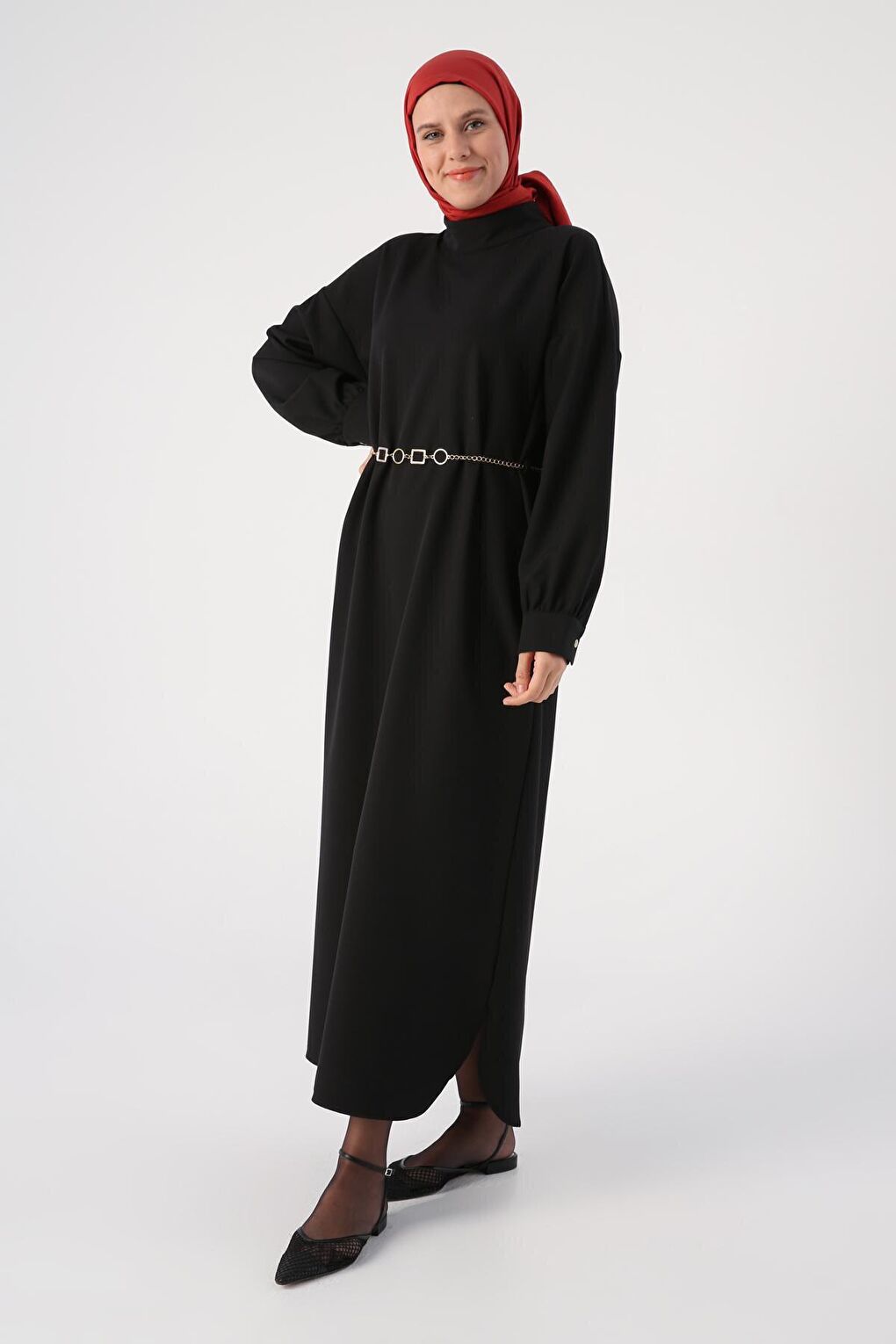- نام : Siyah Kemerli Yanları Oval Yırtmaçlı Elbise