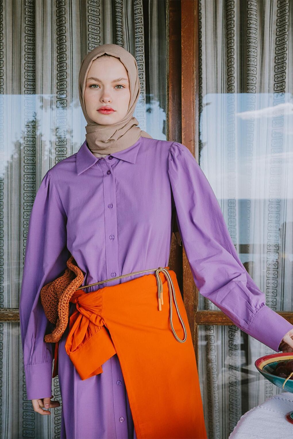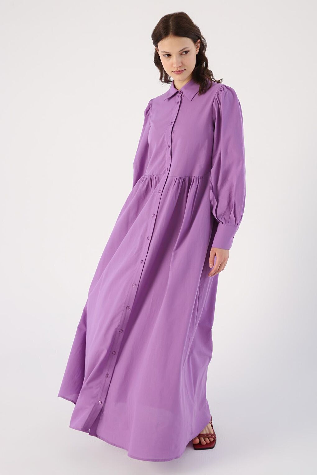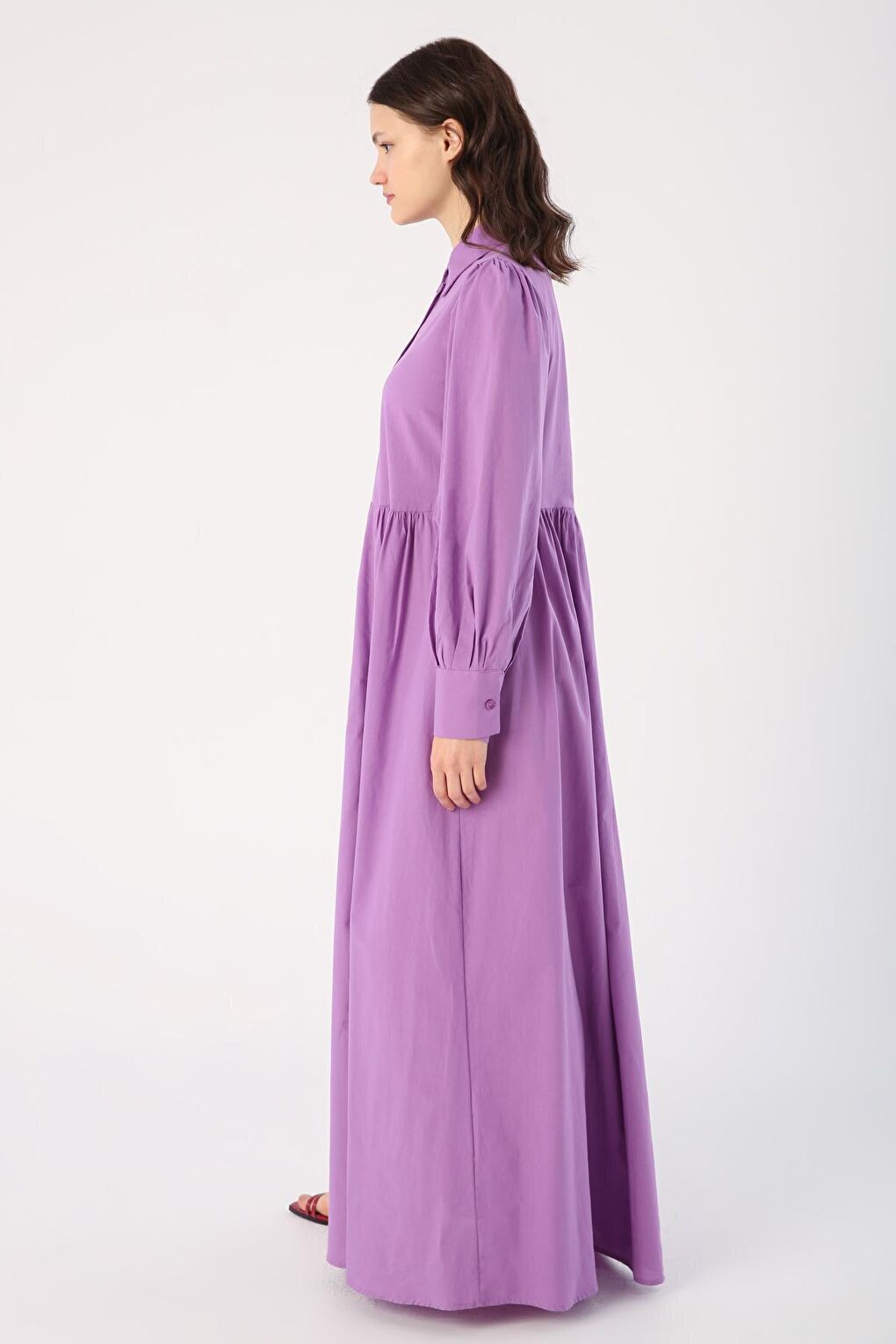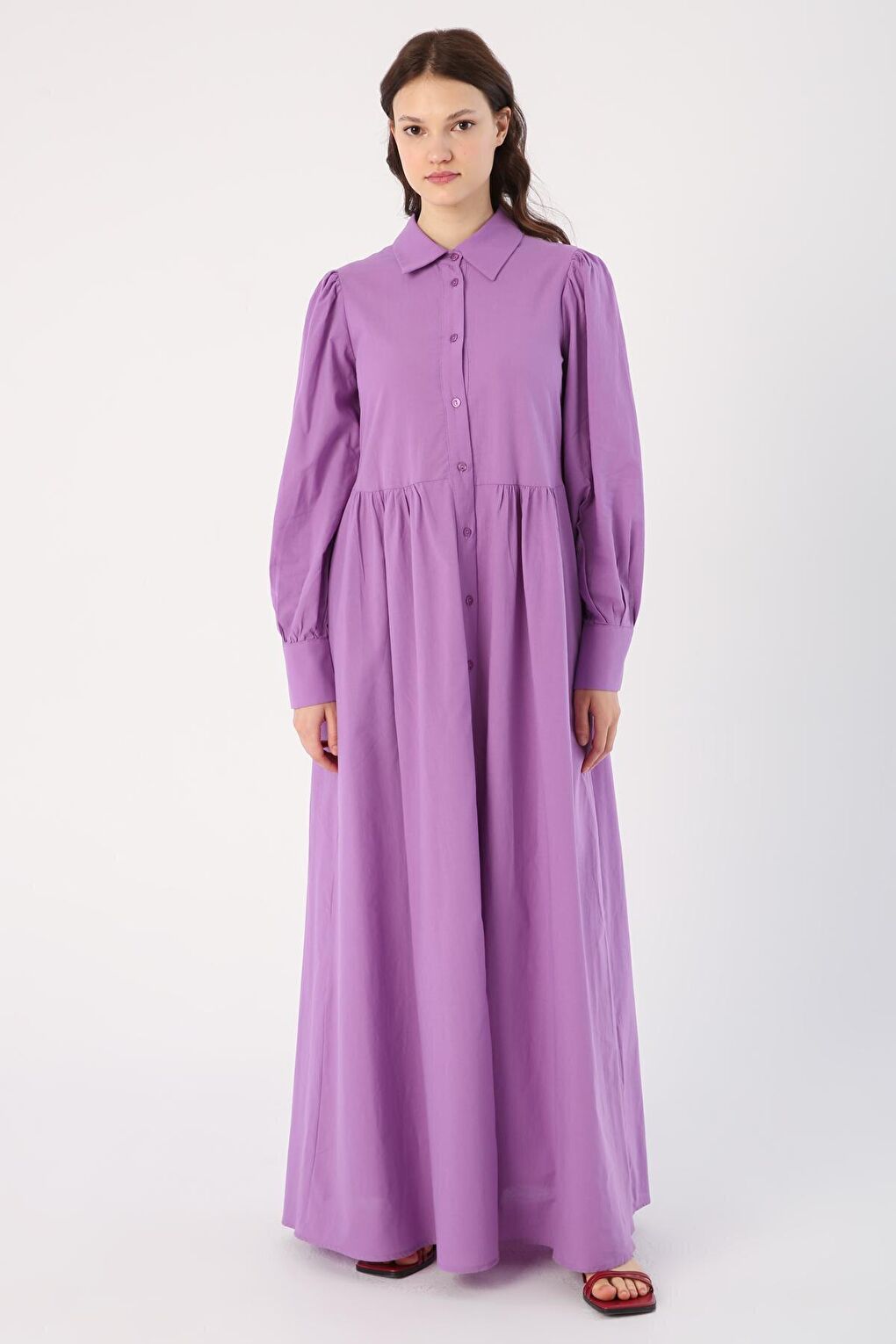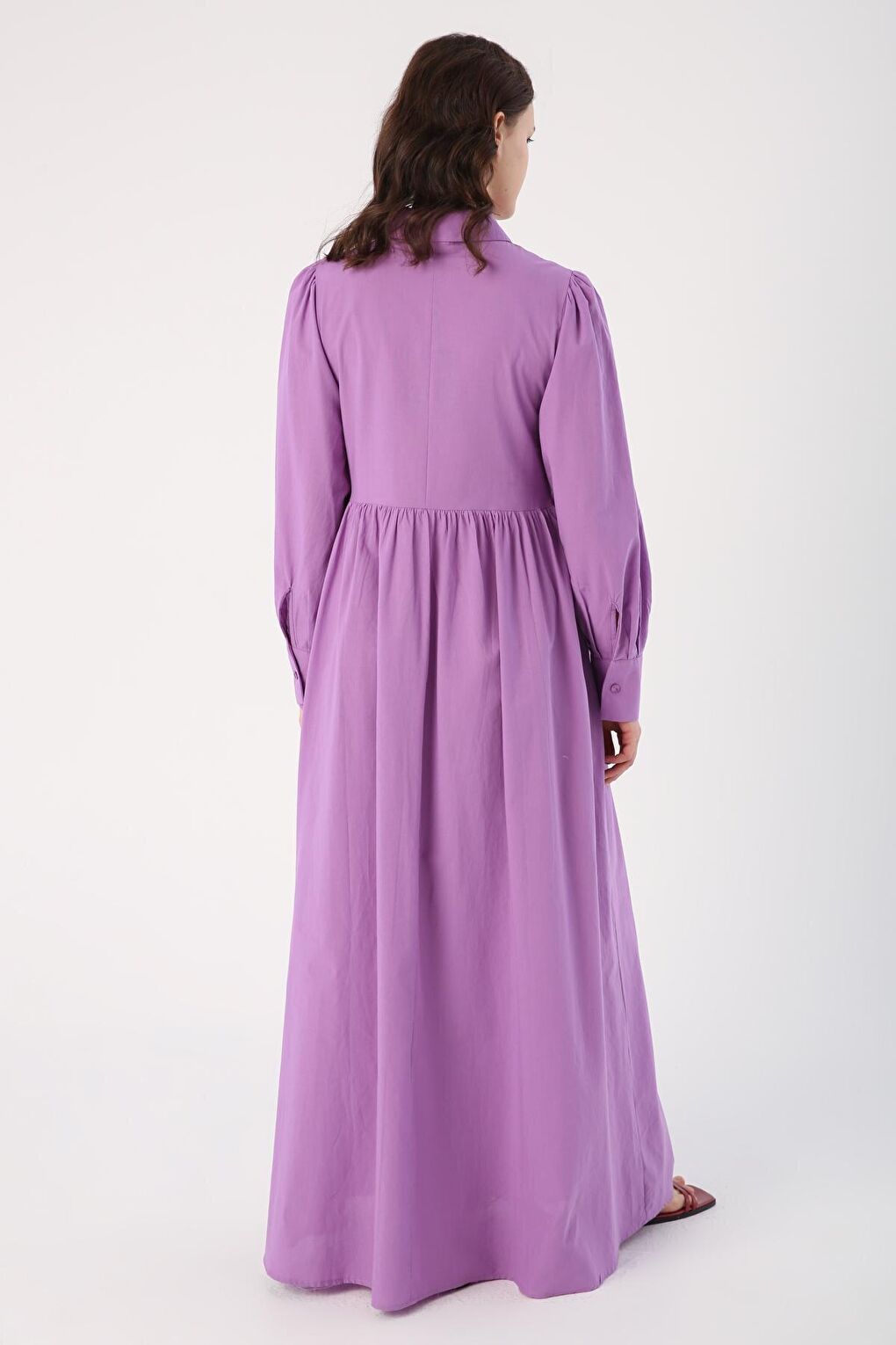 - نام : Mor %100 Pamuk Büzgülü Gömlek Elbise