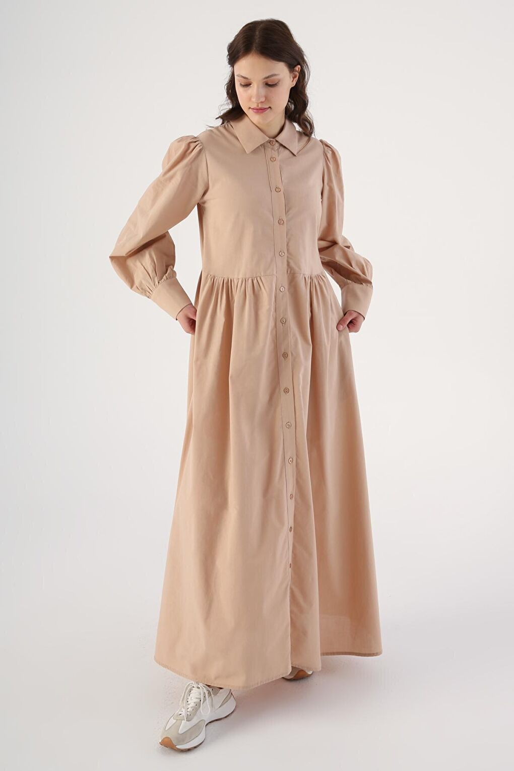 - نام : Bej %100 Pamuk Büzgülü Gömlek Elbise