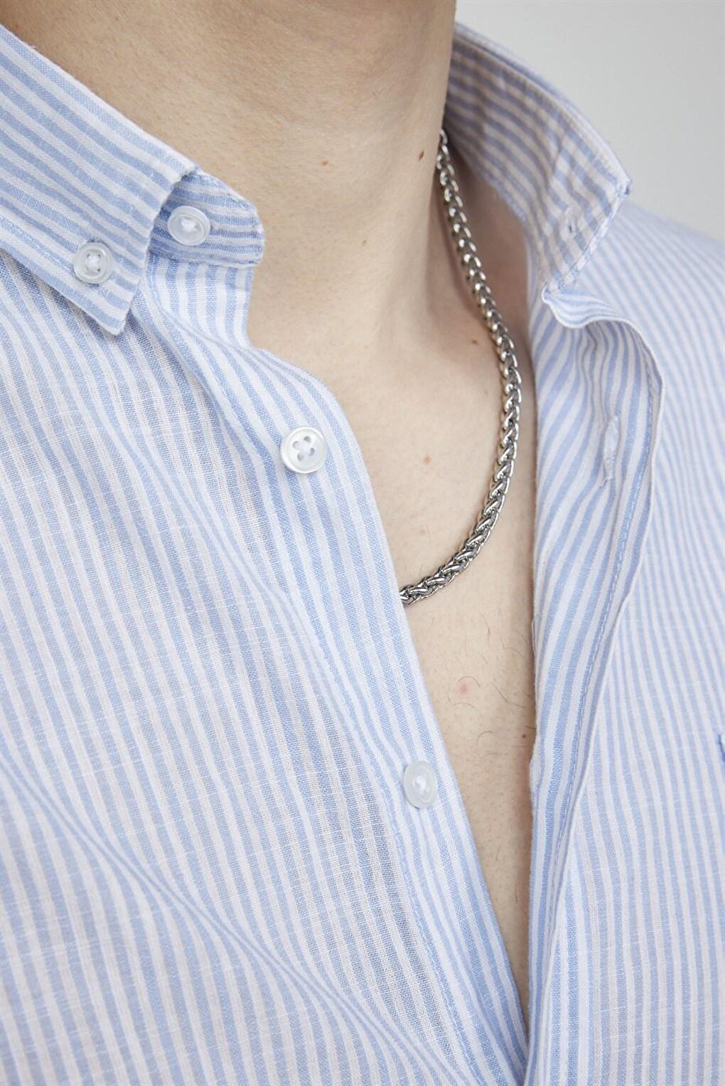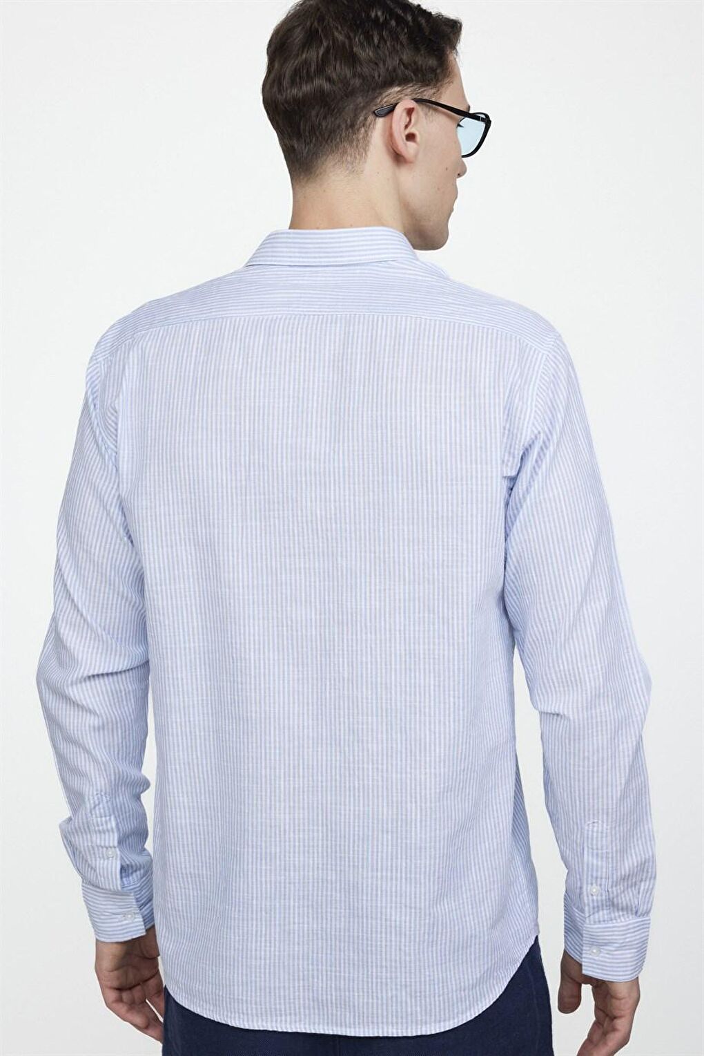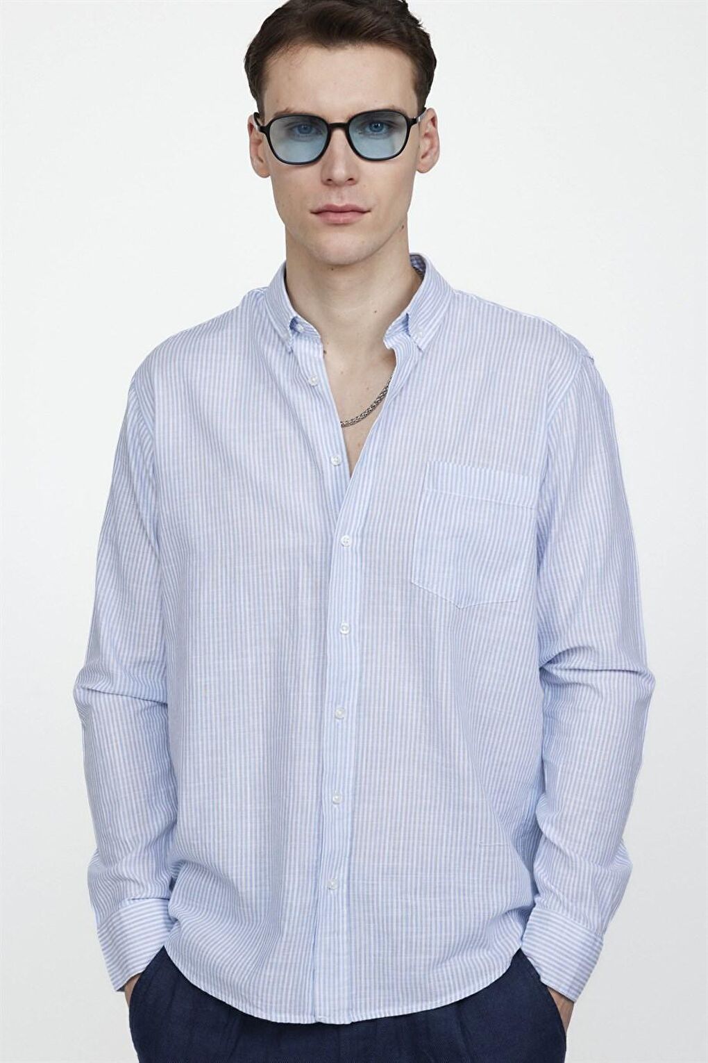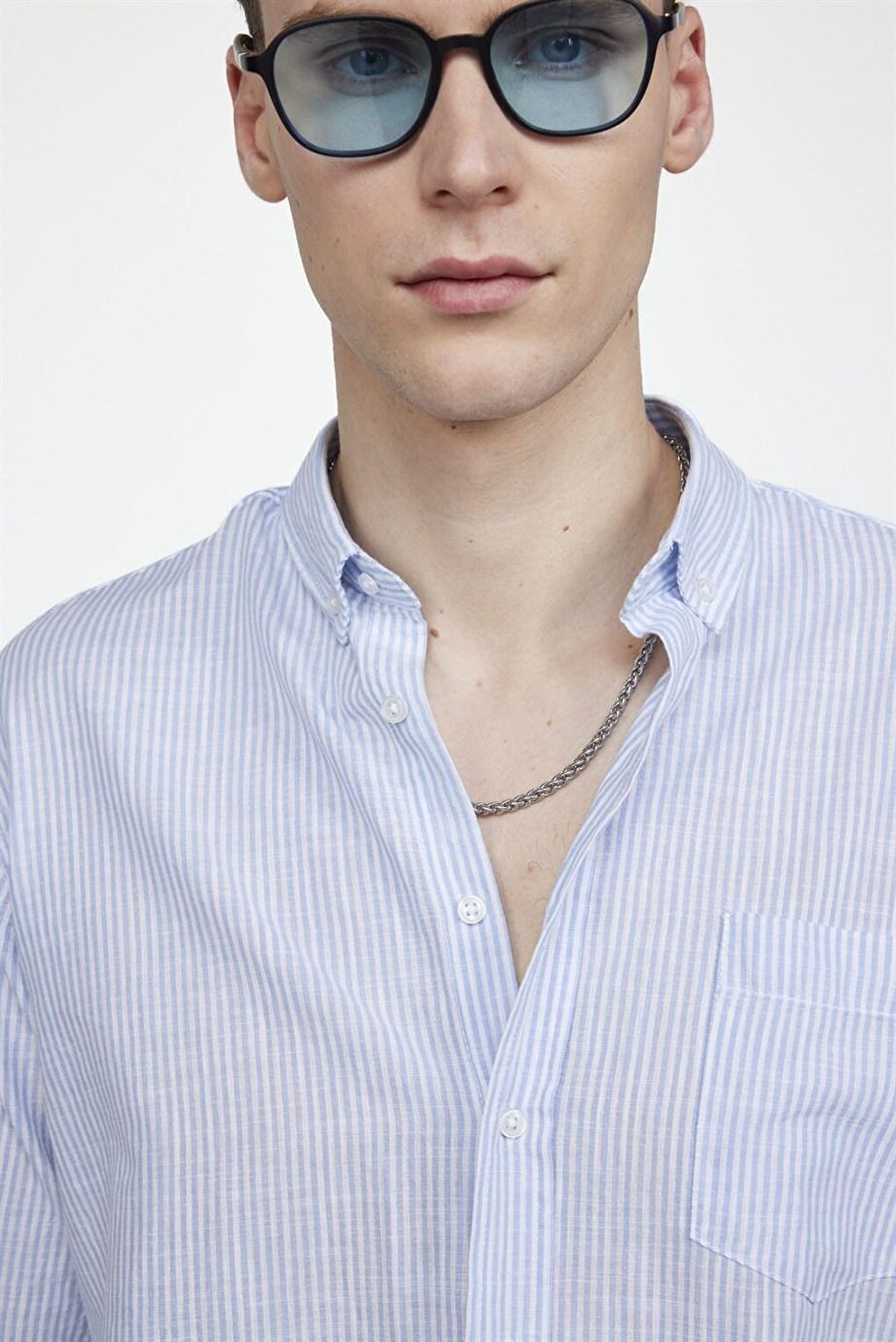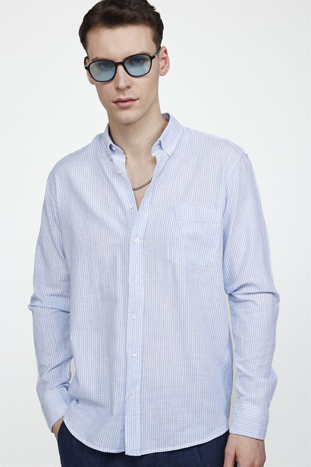 - نام : Klasik Fit Çizgili Düğmeli Yaka Pamuk Flam Mavi Gömlek