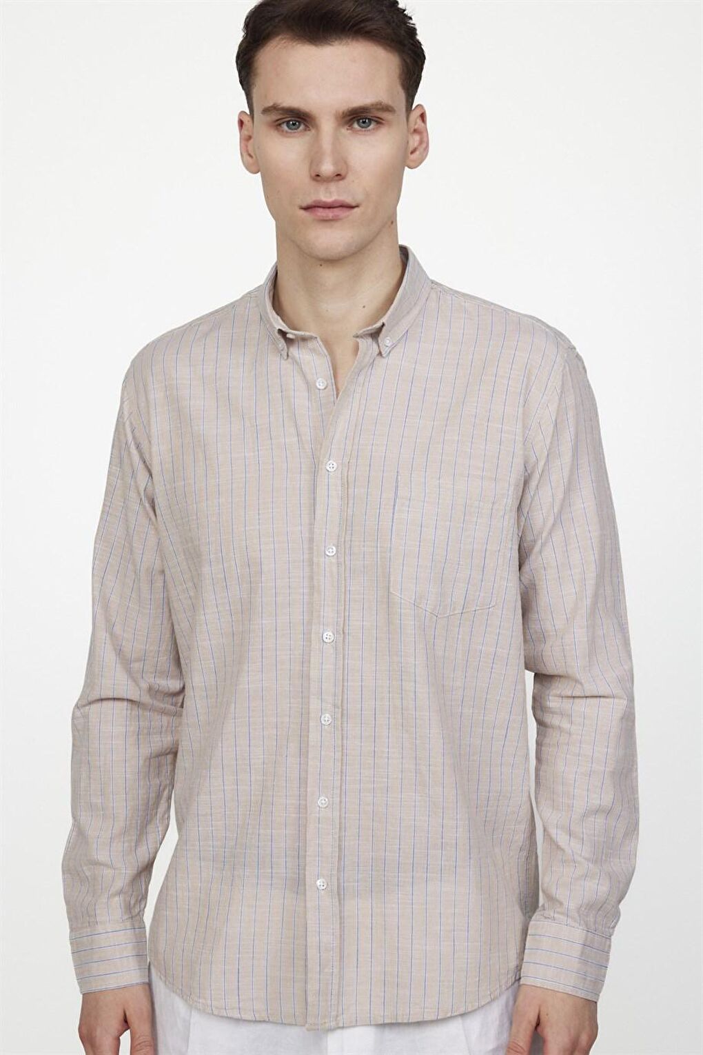 - نام : Klasik Fit Çizgili Düğmeli Yaka Pamuk Flam Gömlek