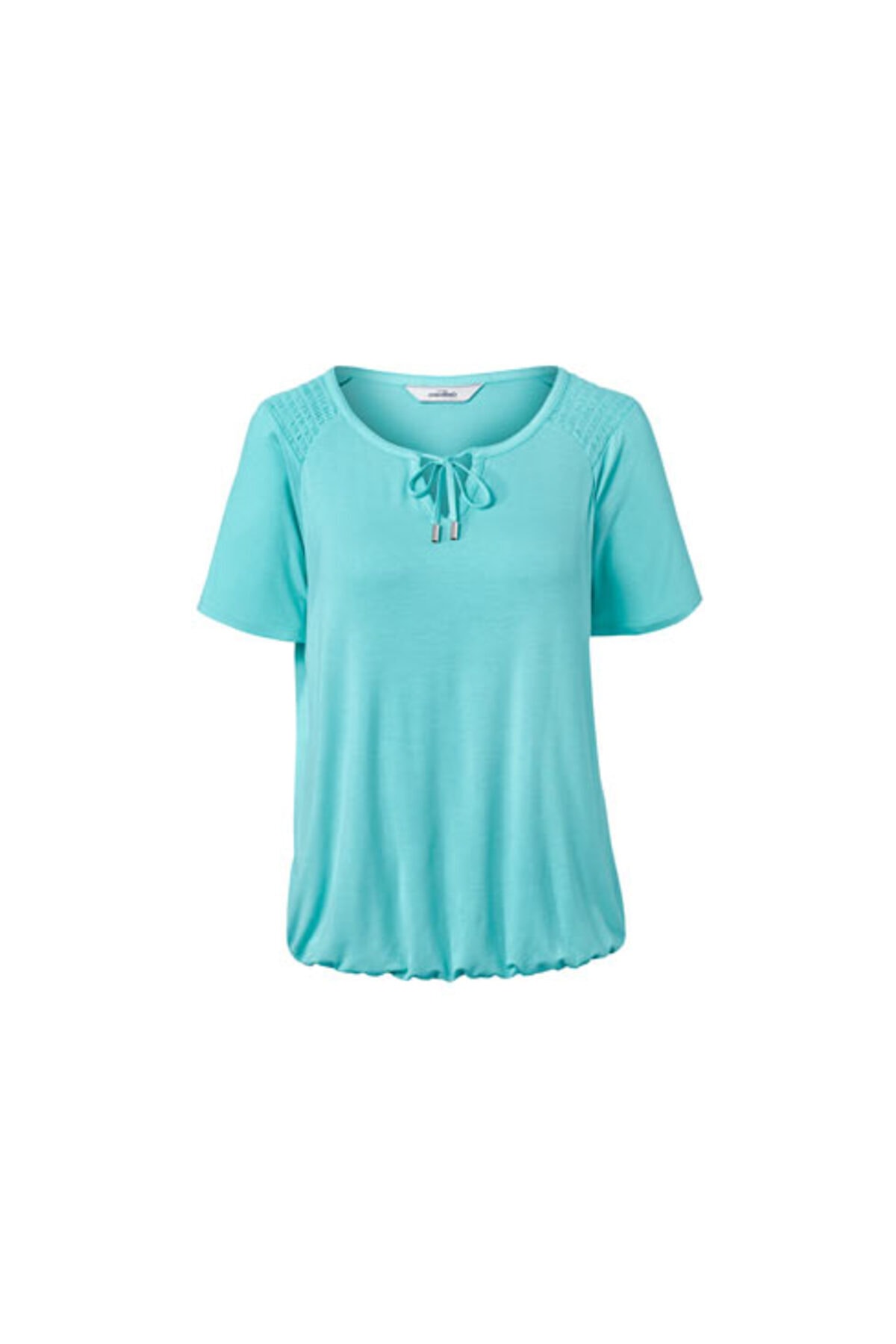 Bluz, Turkuaz Renk: Turkuaz Malzeme: %95 viskoz (Lenzing'den), %5 elastan Ölçüler: Toplam uzunluğu yakl. 65 cm (M 40/42) Rahat bir kıyafet için yazlık bluz|Yumuşak dökümlü esnek viskoz kumaş |Dekoratif büzgülü omuzlar |Rahat bir giyim hissi ve optimum uyum için elastik kenar|Yuvarlak V yakalı ve dekoratif bağcıklı |Reglan kollu kadın bluzu|Elastanlı: formunu korur, mükemmel oturur, yüksek giyim konforu sunar