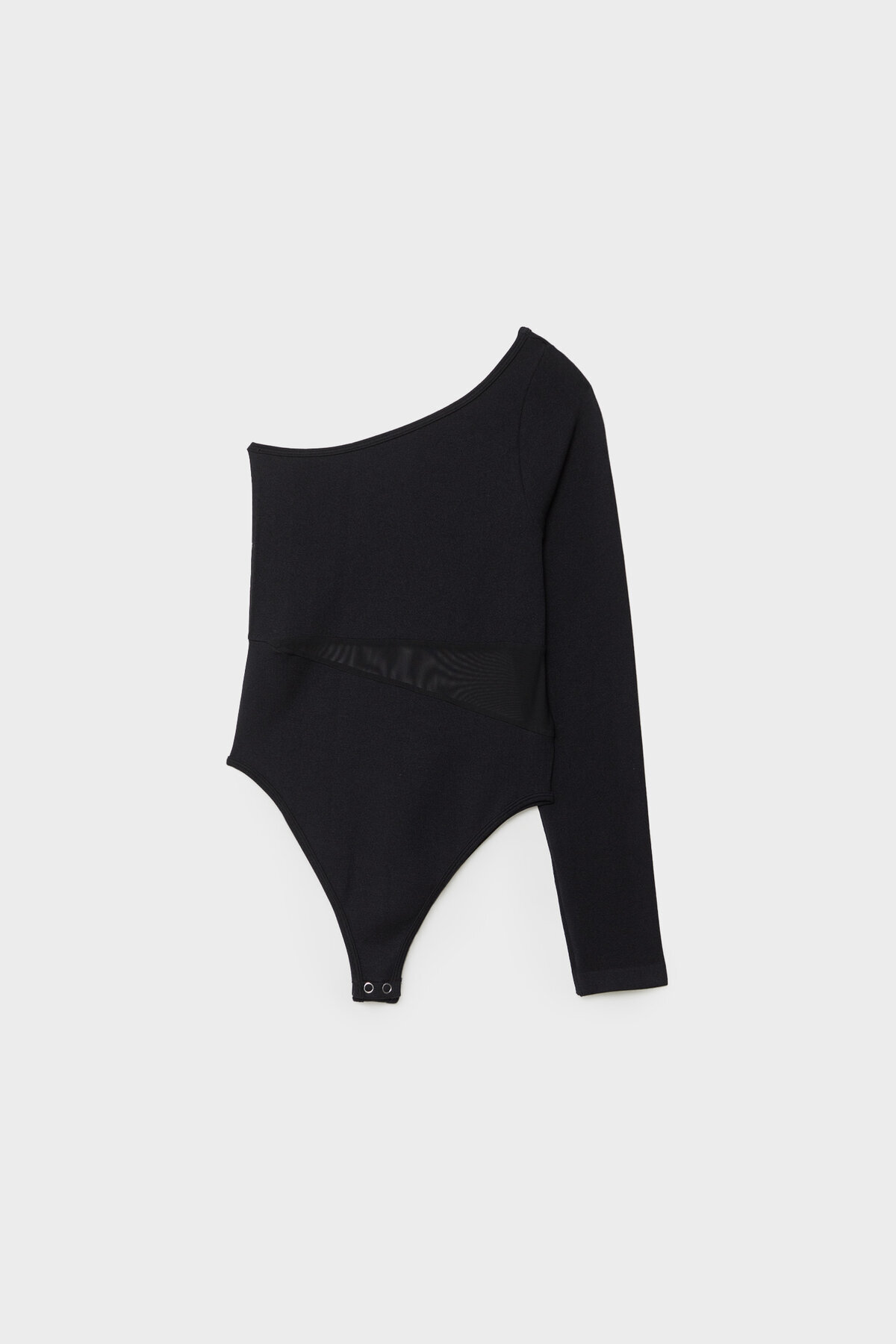 Beli tül kumaşlı, asimetrik yaka, vücuda oturan tek kollu body. Çıtçıt düğmeli.