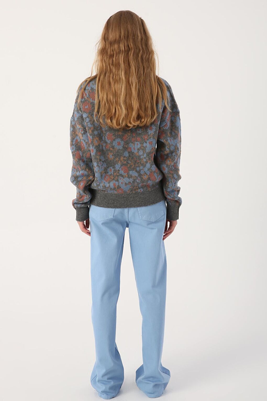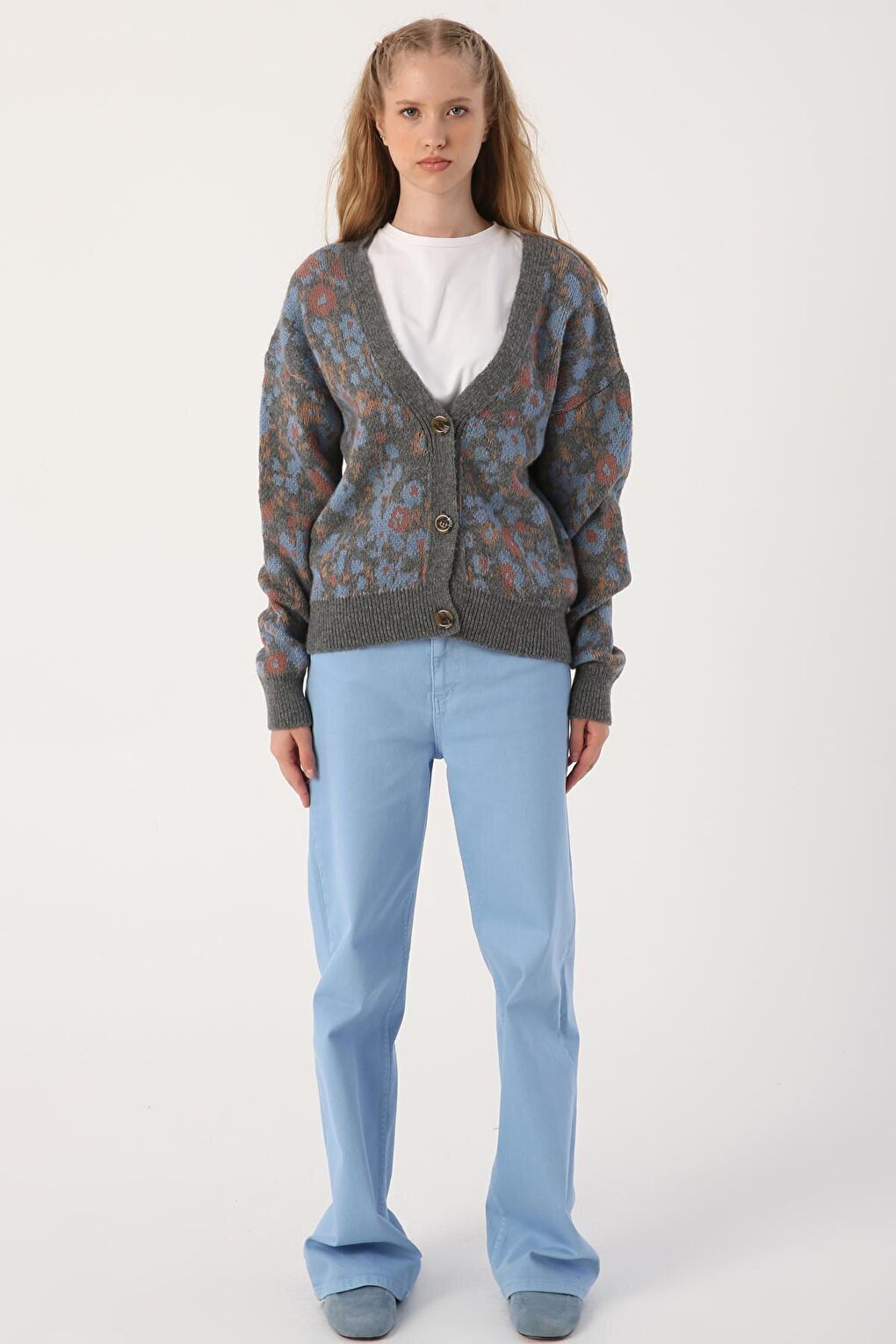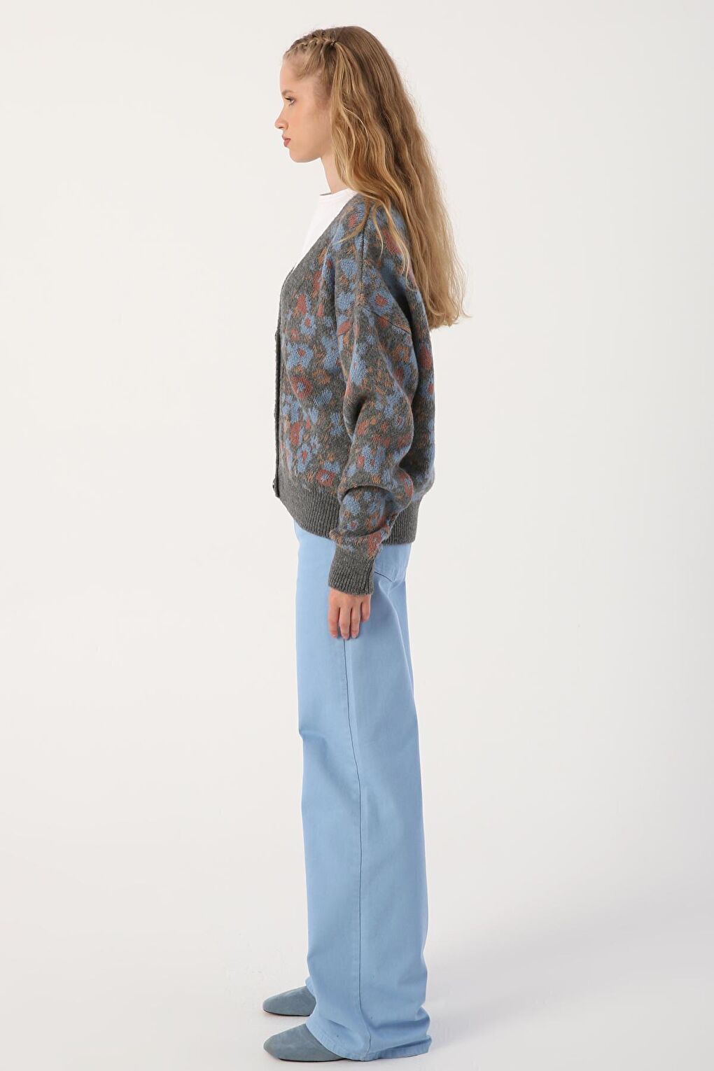 - نام : Gri-Mavi V Yaka Çiçek Desenli Rahat Kısa Triko Hırka