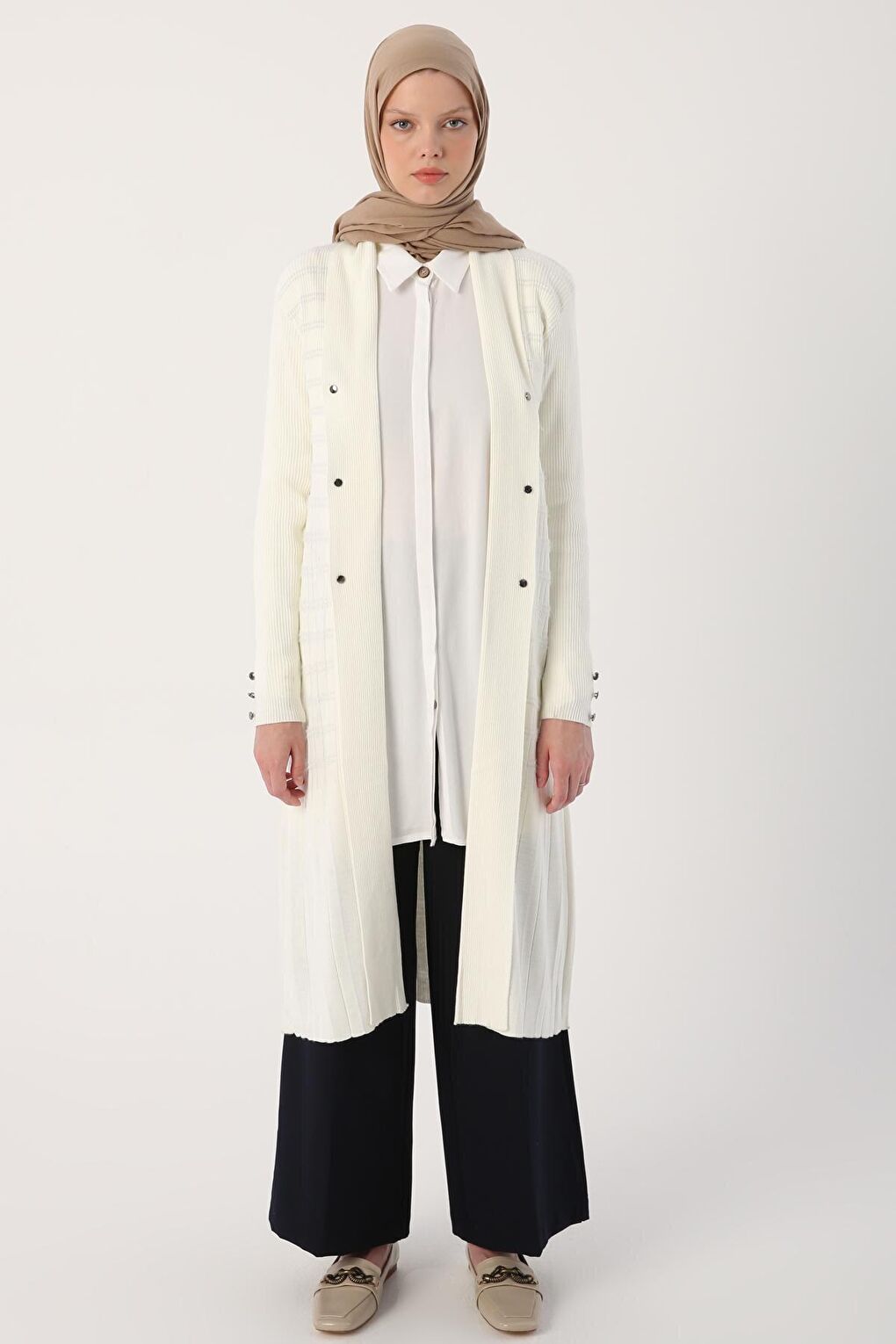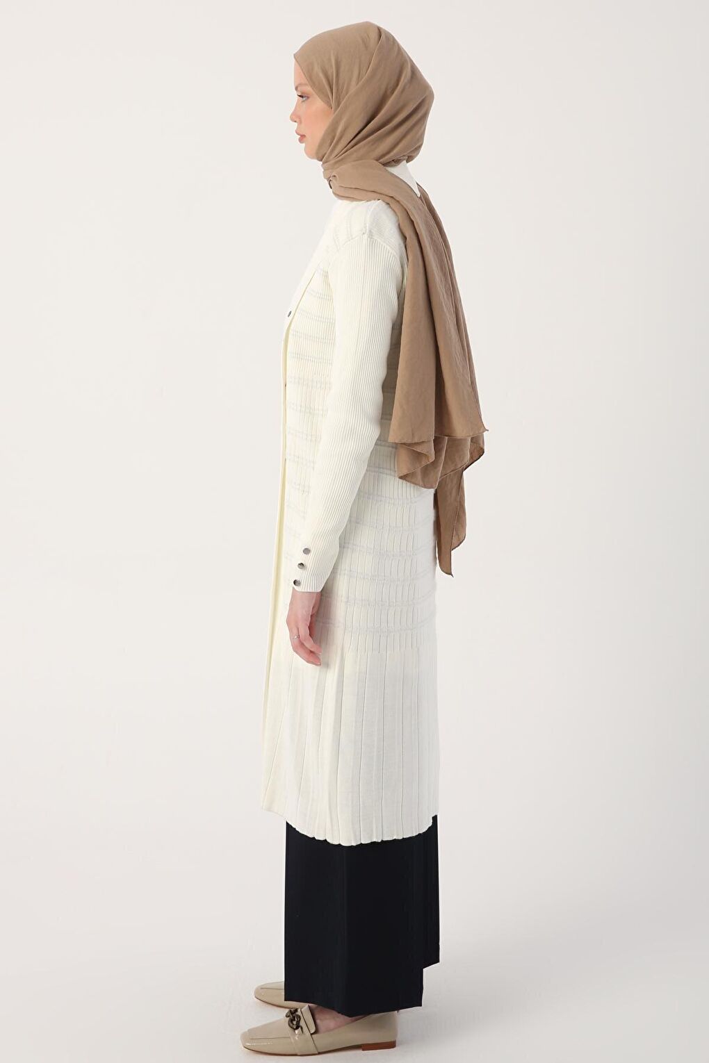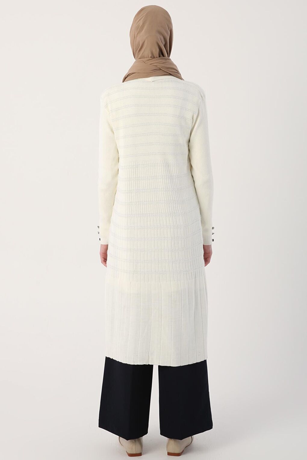- نام : Ekru Simli Çizgili Düğme Detaylı Triko Hırka