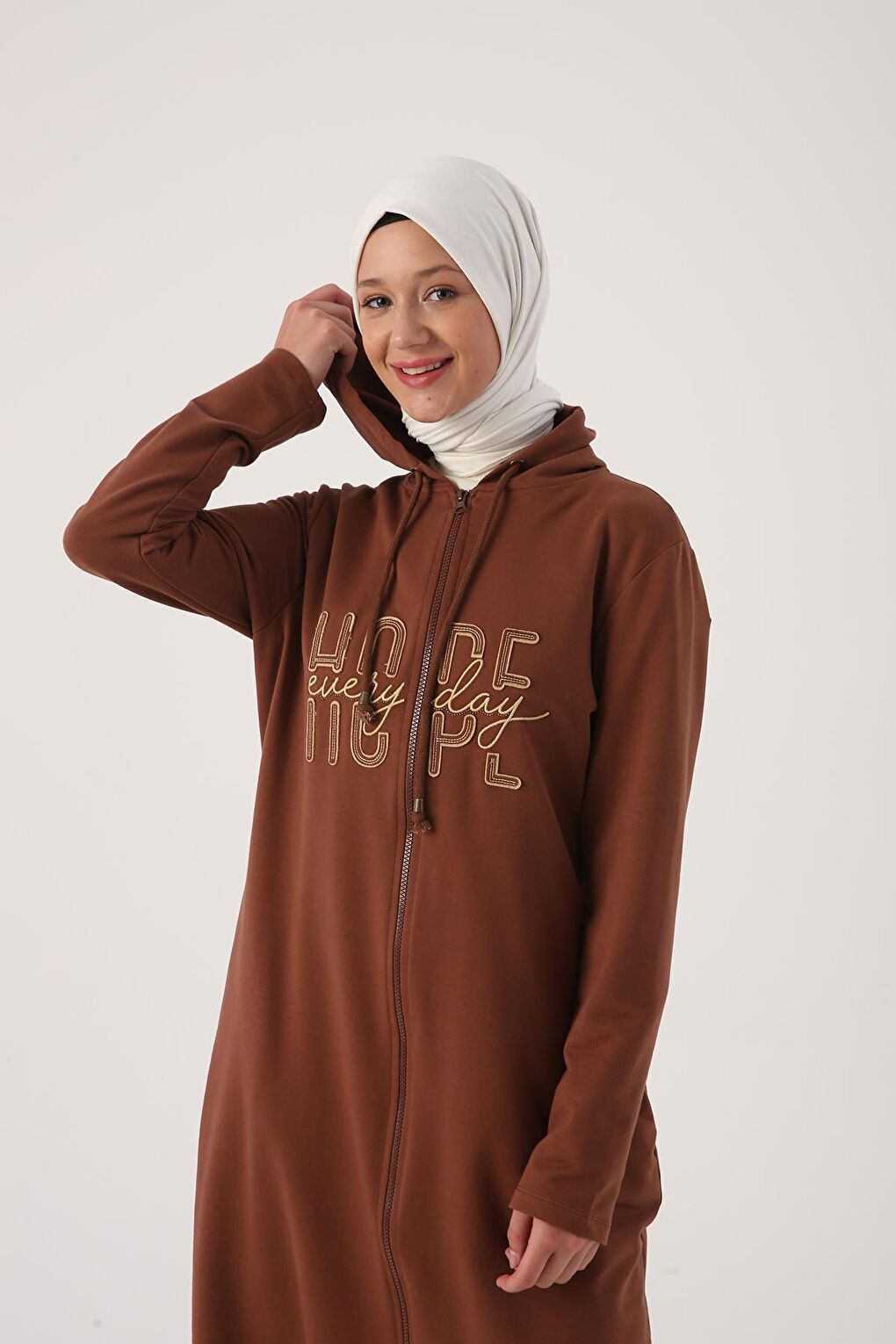 - نام : Kahve Kapüşonlu Aplike Nakışlı Fermuarlı Hırka