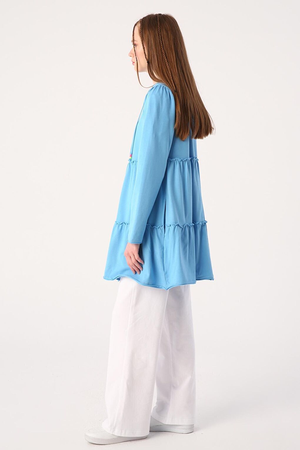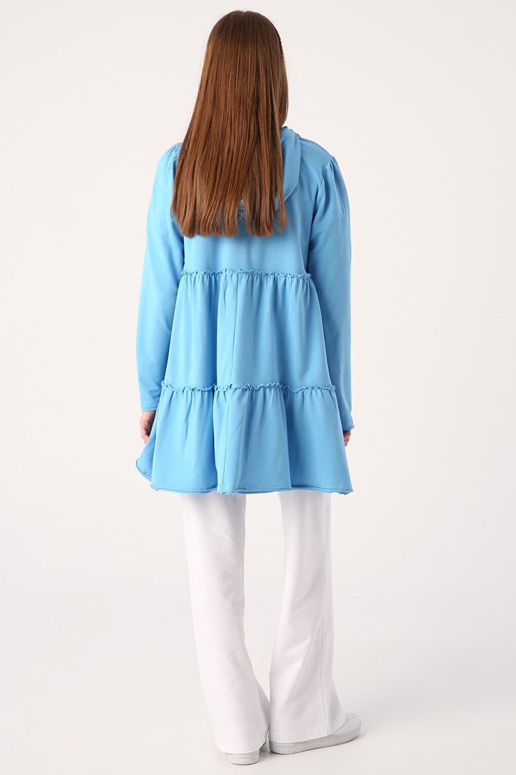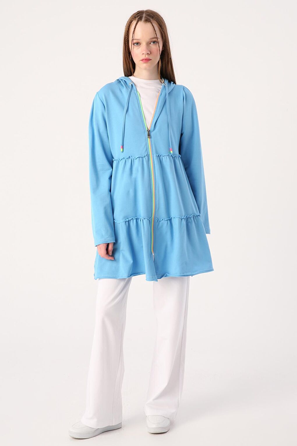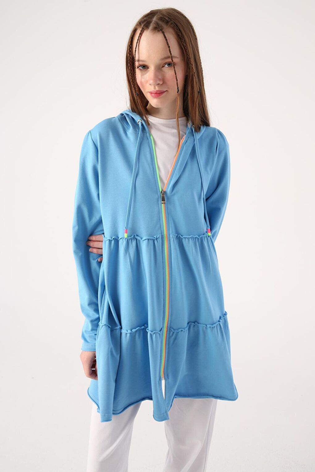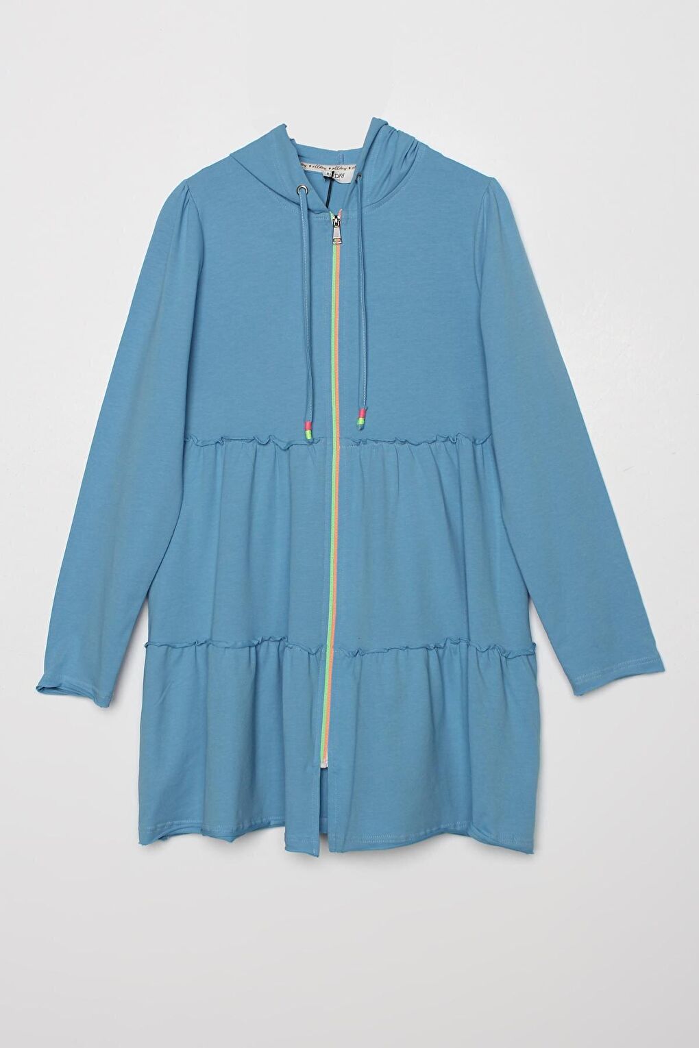 - نام : Mavi Fırfırlı Neon Detaylı Kapüşonlu Örme Hırka