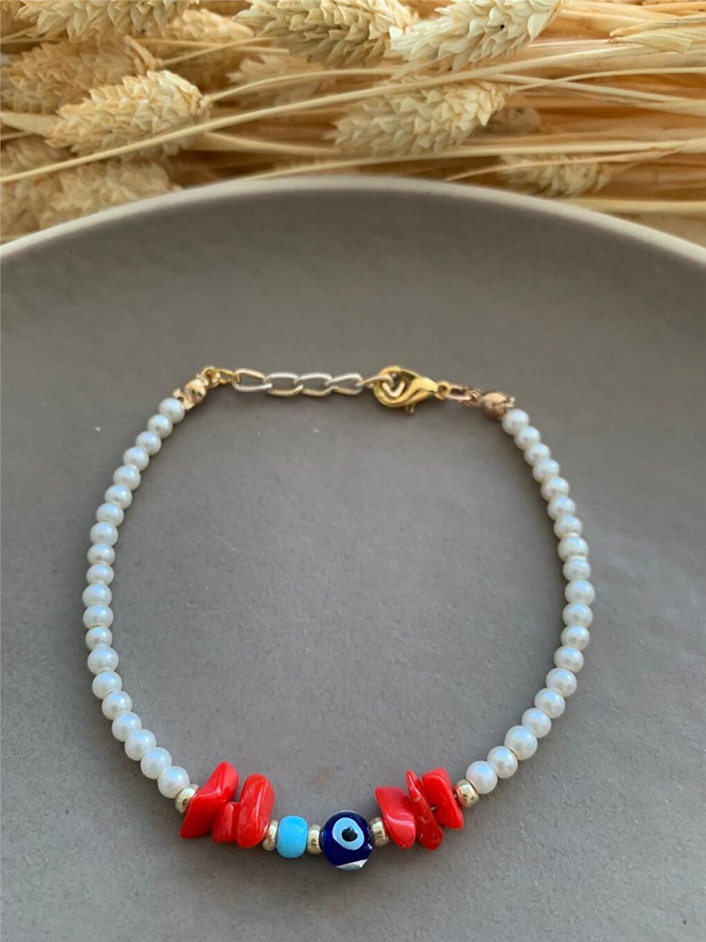 - نام : Mercan Taşlı Nazar Boncuklu İncili Bileklik