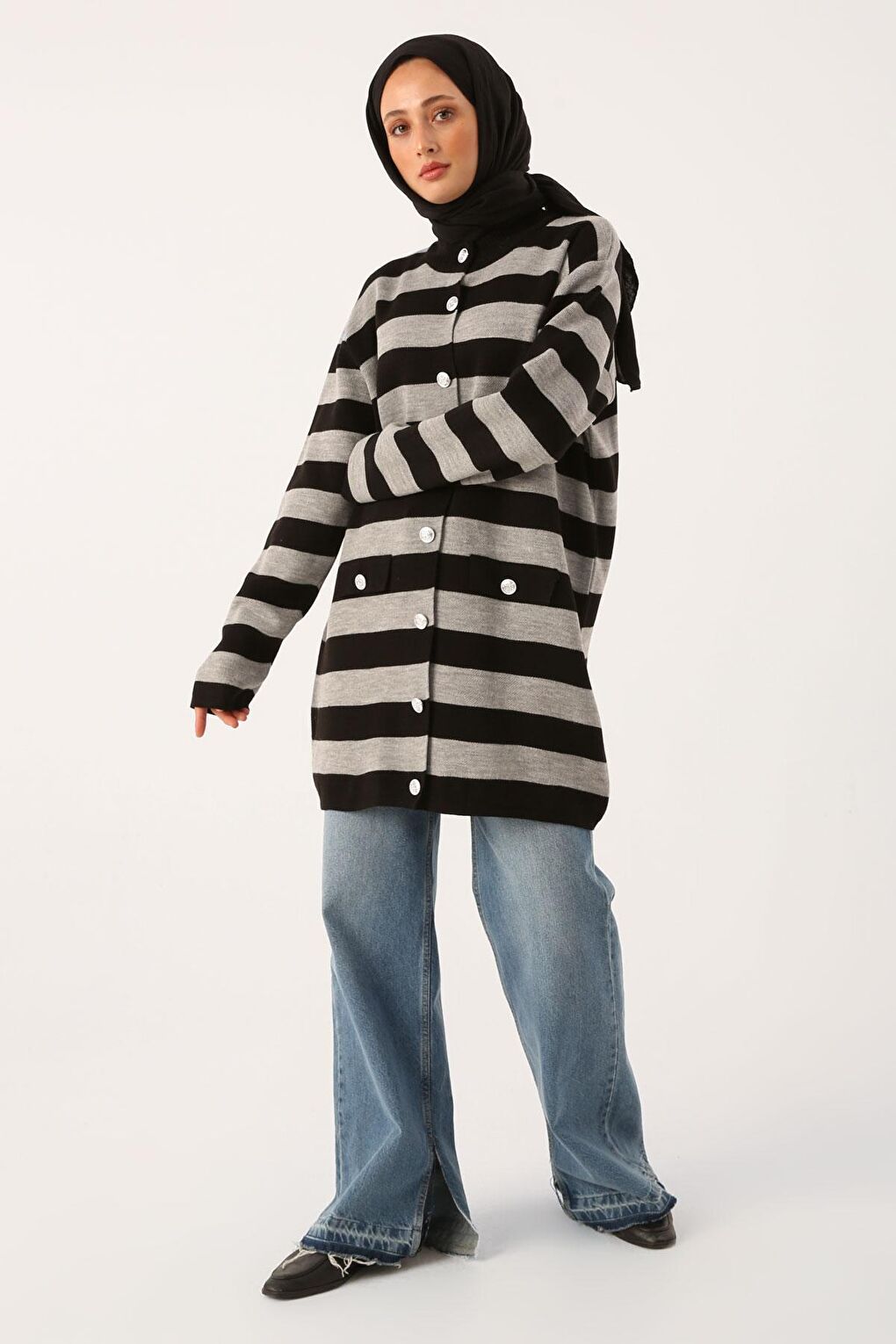 - نام : Siyah-Gri Çizgili Fitilli Yaka Düğmeli Hırka