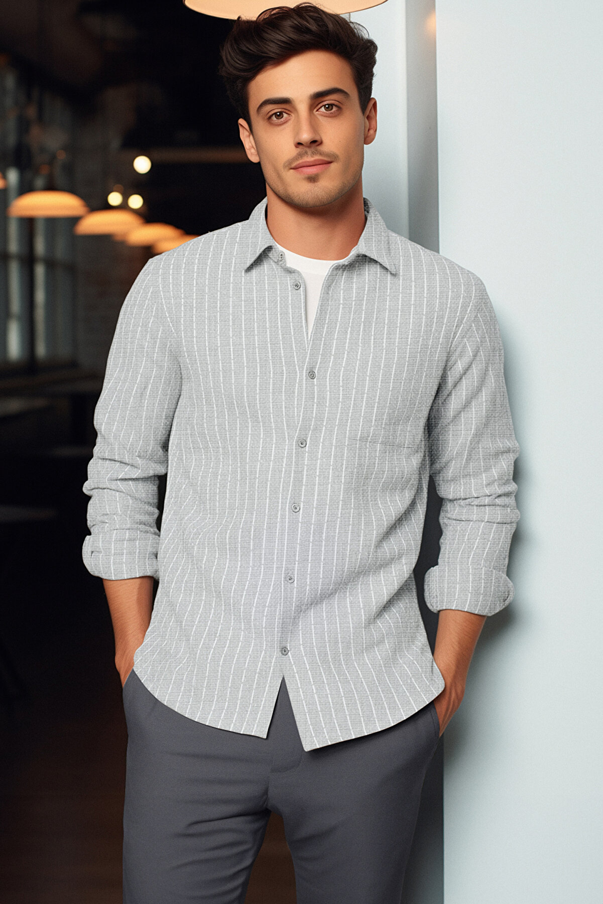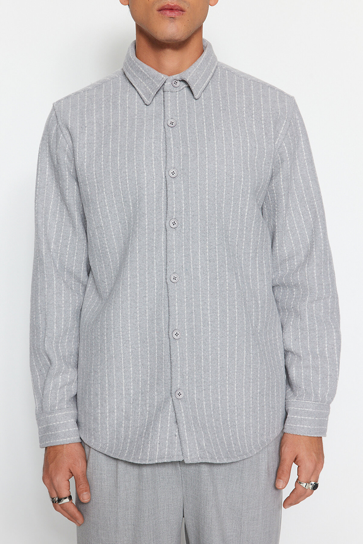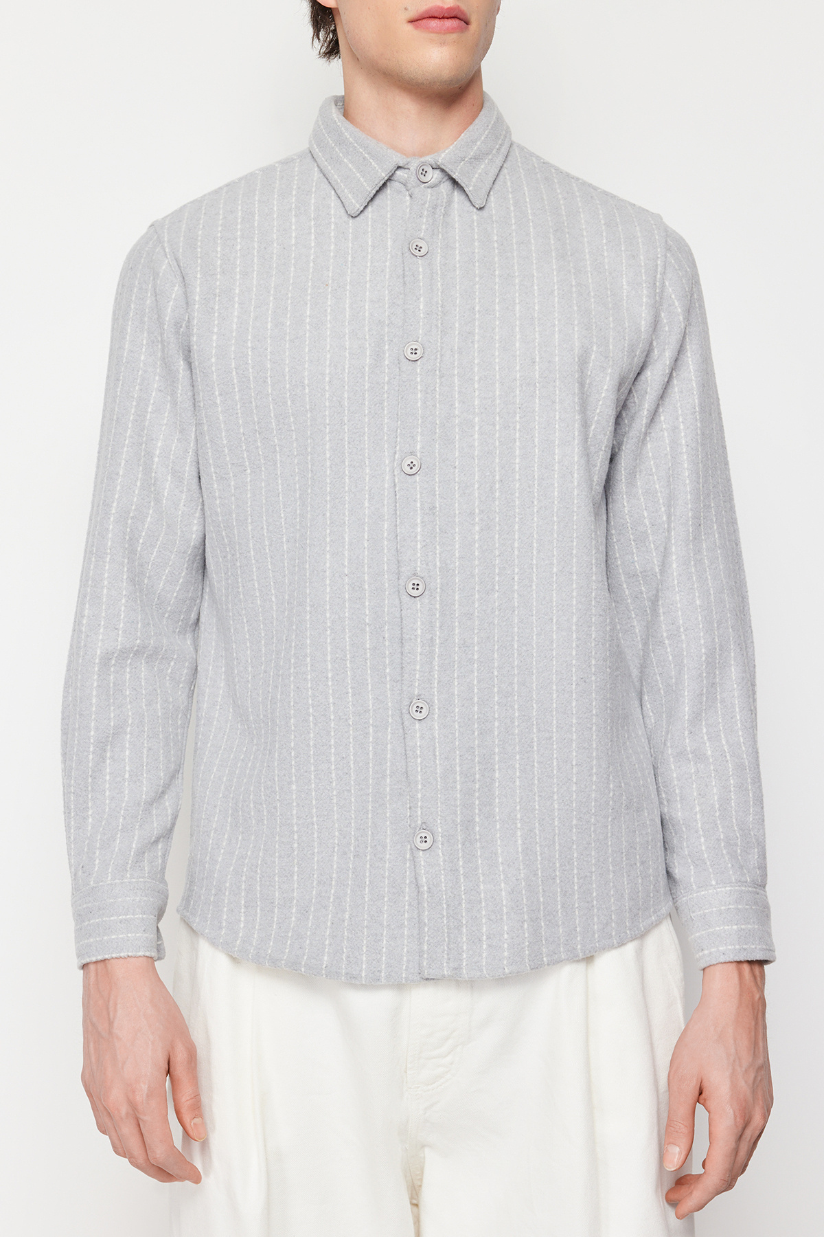 - نام : Gri Erkek Regular Fit Çizgili Kalın Kışlık Gömlek