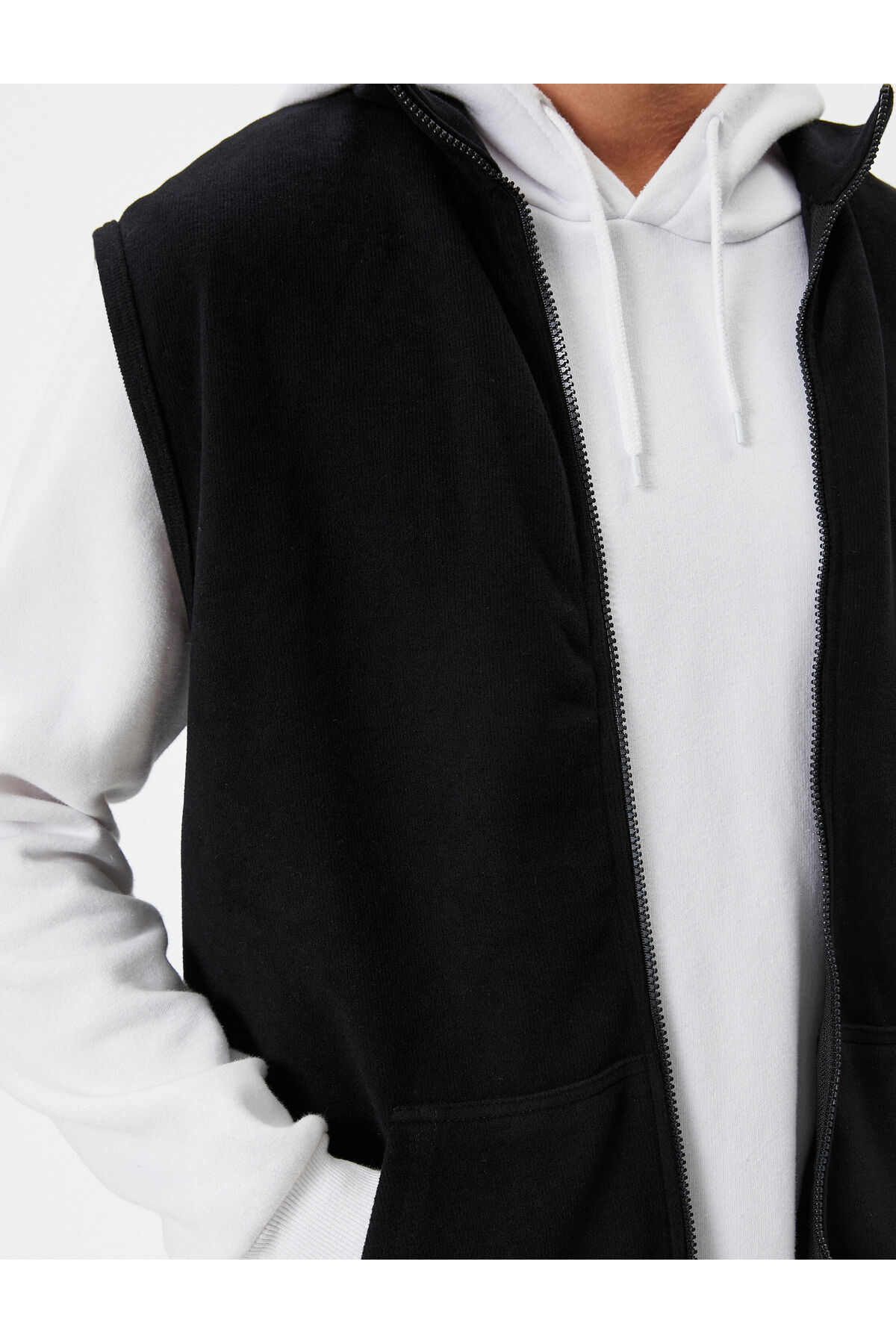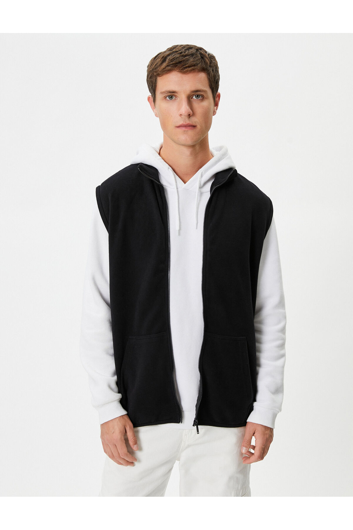 Kanguru cep detaylı, fermuarlı, dik yaka, kolsuz yelek.
