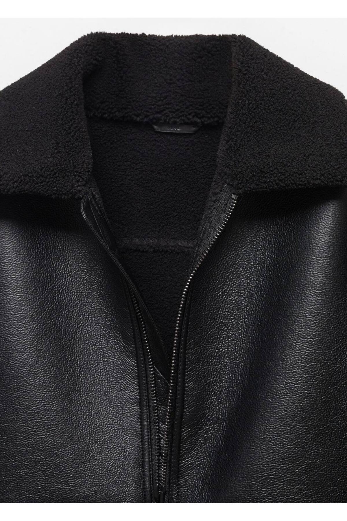 Ceket .-- Show. Kürk görünümlü yakalı, çift taraflı model, koyun yünü astarlı, suni deri, önden fermuarlı kapama, uzun kollu ve manşetli, ön tarafta iki adet klapalı cep, düz paça, modelin boyu 190 cm'dir ve m beden giymektedir. 100% polyester, dolgumalzemesi: 100% polyester, tel: 98% polyester,1% elastodien,1% elastan, coating: 100% poliüretan, astar cebi: 81% polyester,19% pamuk. Arka uzunluk 70.0 cm. Elde maks. 30°c'de yıkayın, çamaşır suyu kullanmayın, ütülemeyin, kuru temizleme yapılmaz, kurutma makinesinde kurutulamaz