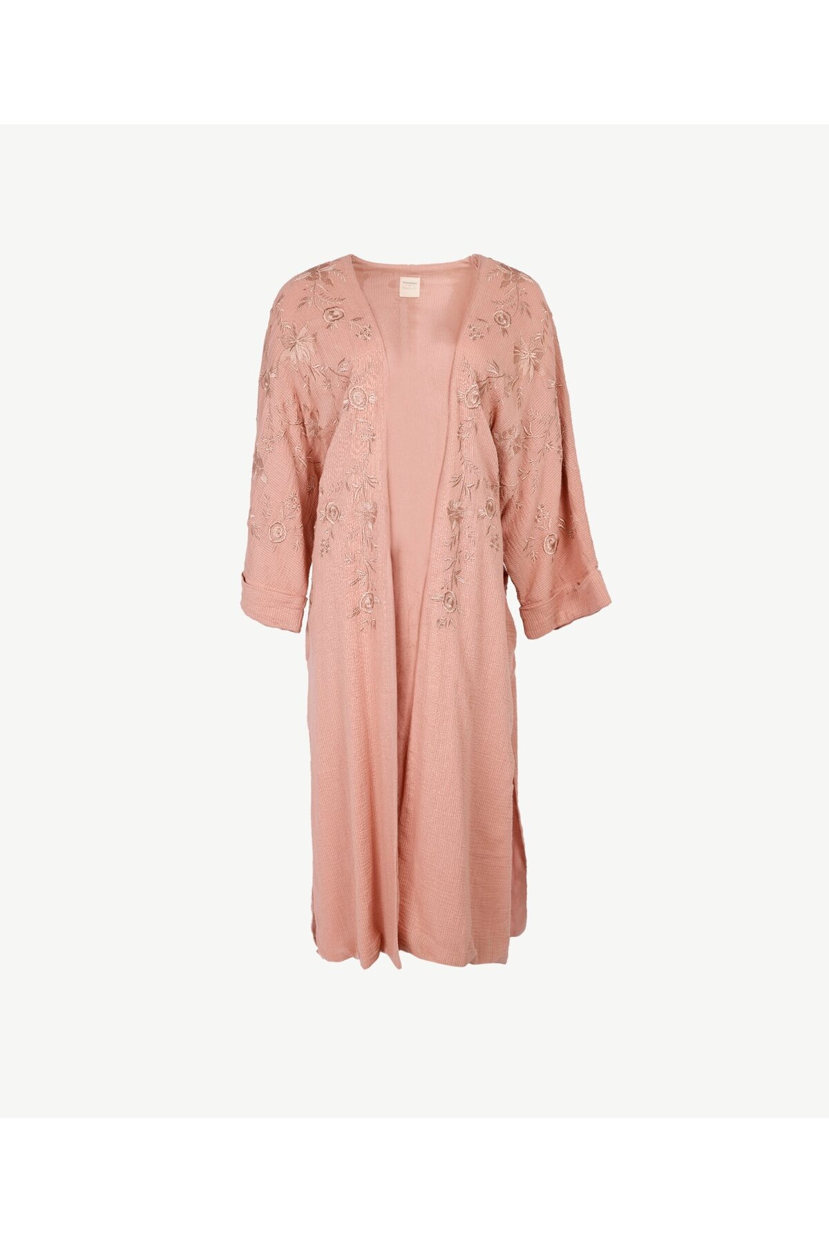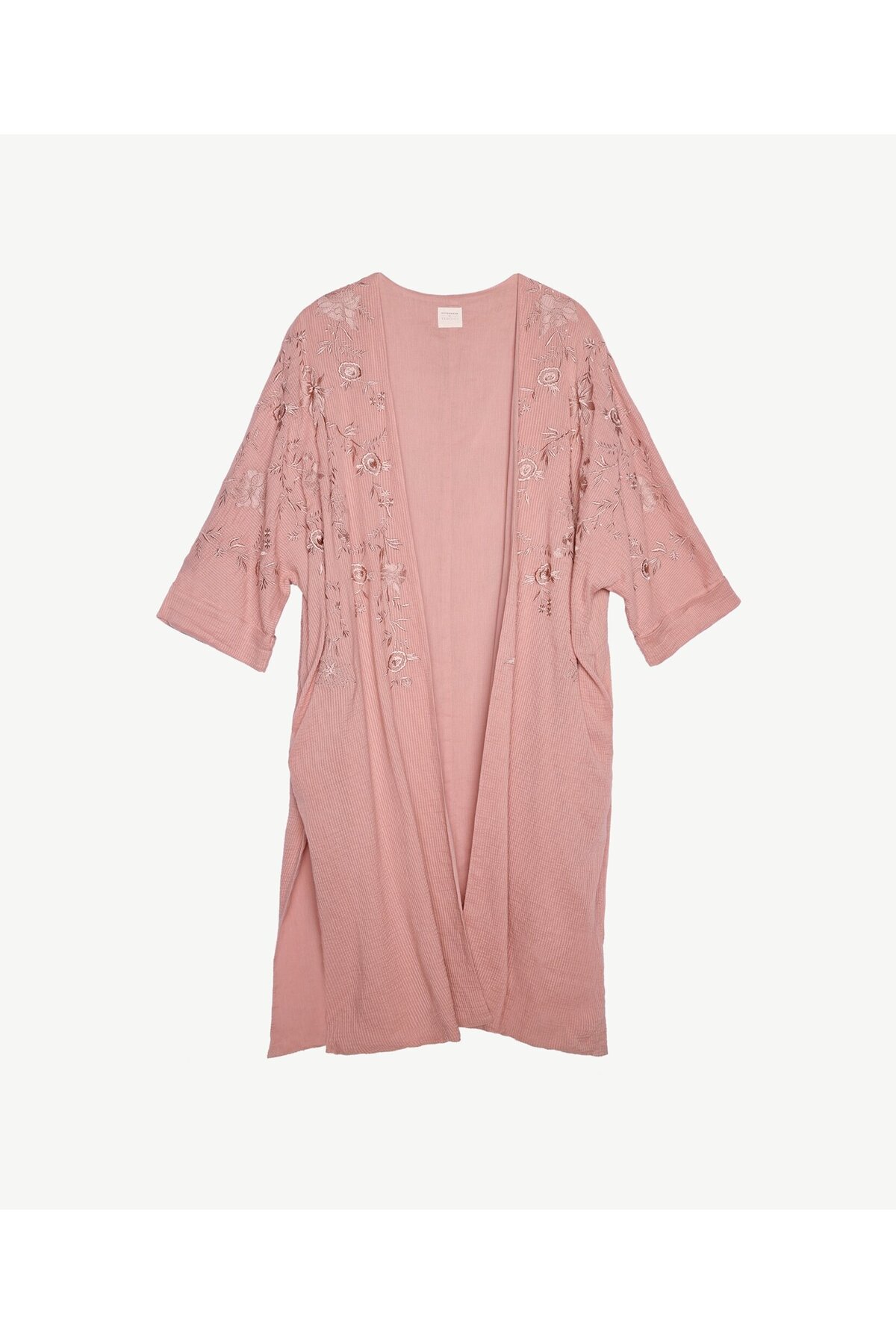 Materyal: 100-pamuk | Ürün Ölçüleri: Zeminle aynı renkteki işlemeleriyle zenginleştirilen kimono pamuğun natürel konforuyla estetik tarzı birleştiren bohem ruhlara sesleniyor. Sokak kombinlerinizde otantik vurguları yükseltmek için bu parçayı kullanabilirsiniz.