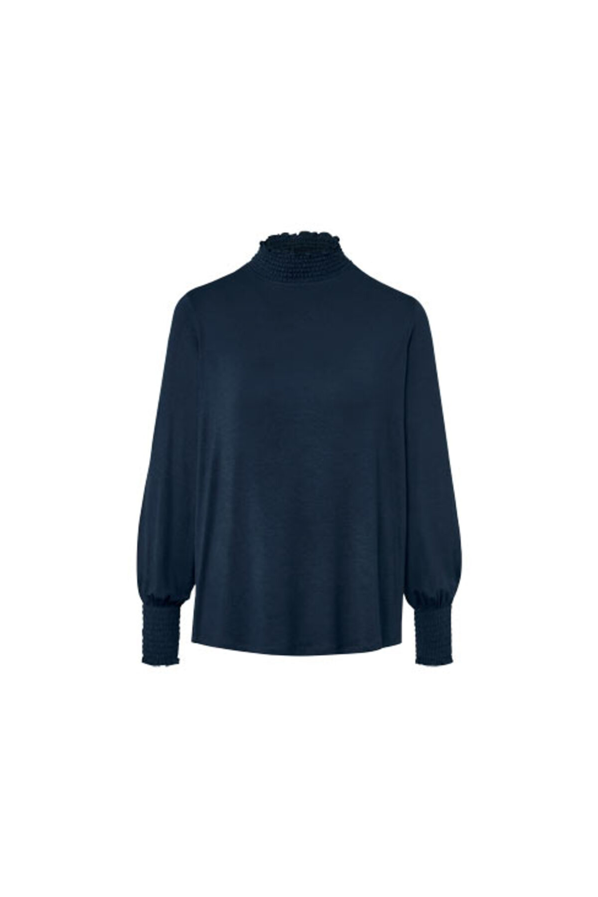 Dik Yakalı Bluz, Koyu Mavi Kesim: Regular Fit Renk: Koyu mavi Malzeme: %95 viskoz, %5 elastan Ölçüler: Toplam uzunluğu yakl. 66 cm (M 40/42 beden) Yumuşak dökümlü viskoz streç kumaş|Esnek, büzgülü manşetli ve dik yakalı|Elastanlı: formunu korur, mükemmel oturur, yüksek giyim konforu sunar