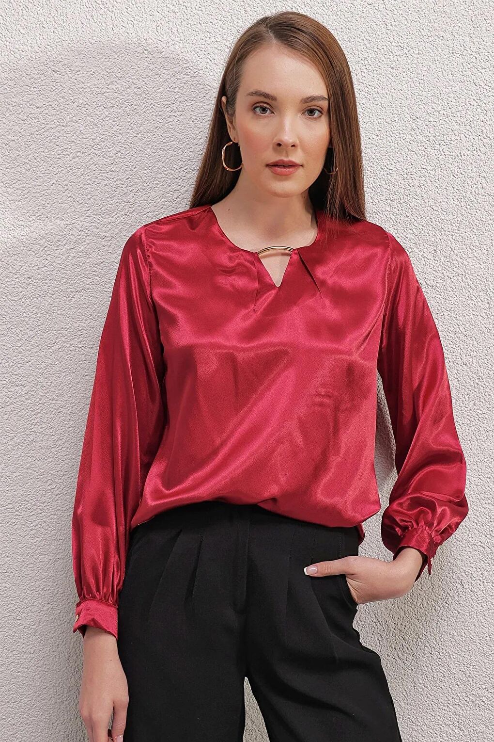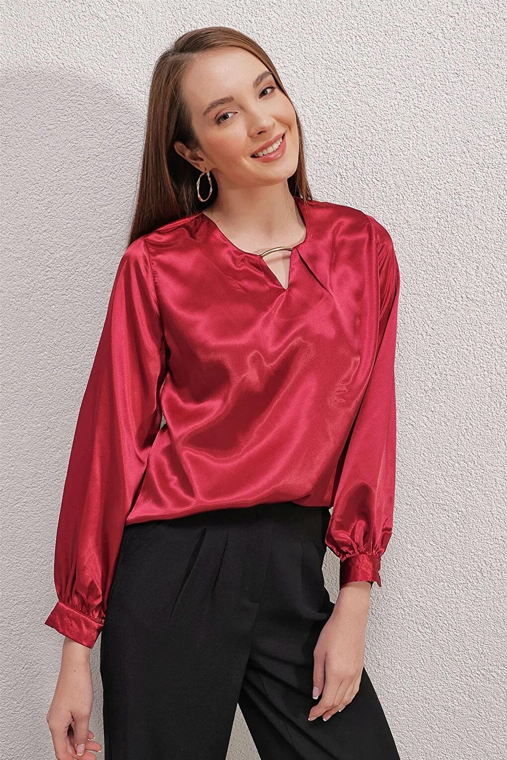 - نام : Kadın Bordo Yaka Detaylı Dökümlü Uzun Kollu Bluz HZL23S-BD104481