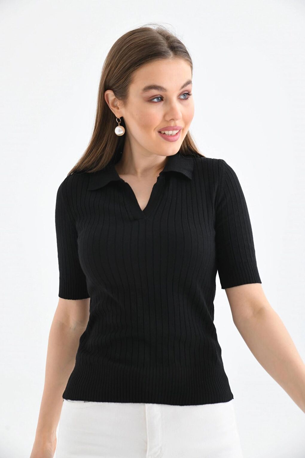 - نام : Kadın Slim Fit Pola Yaka Basic Triko Kısa Kol Kazak