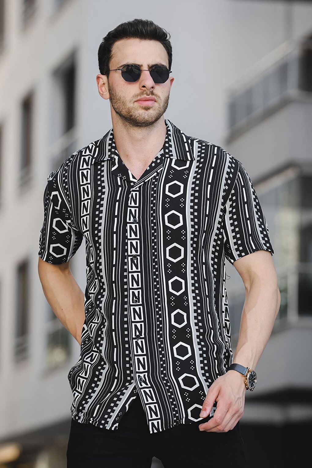 - نام : Slim Fit Likralı Kısa Kol Kilim Desen Apaç Yaka Erkek Gömlek