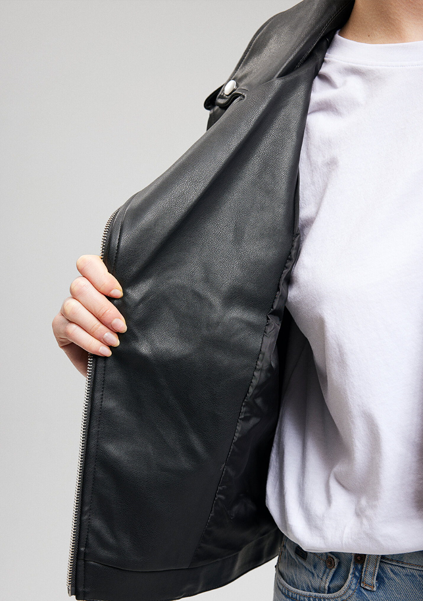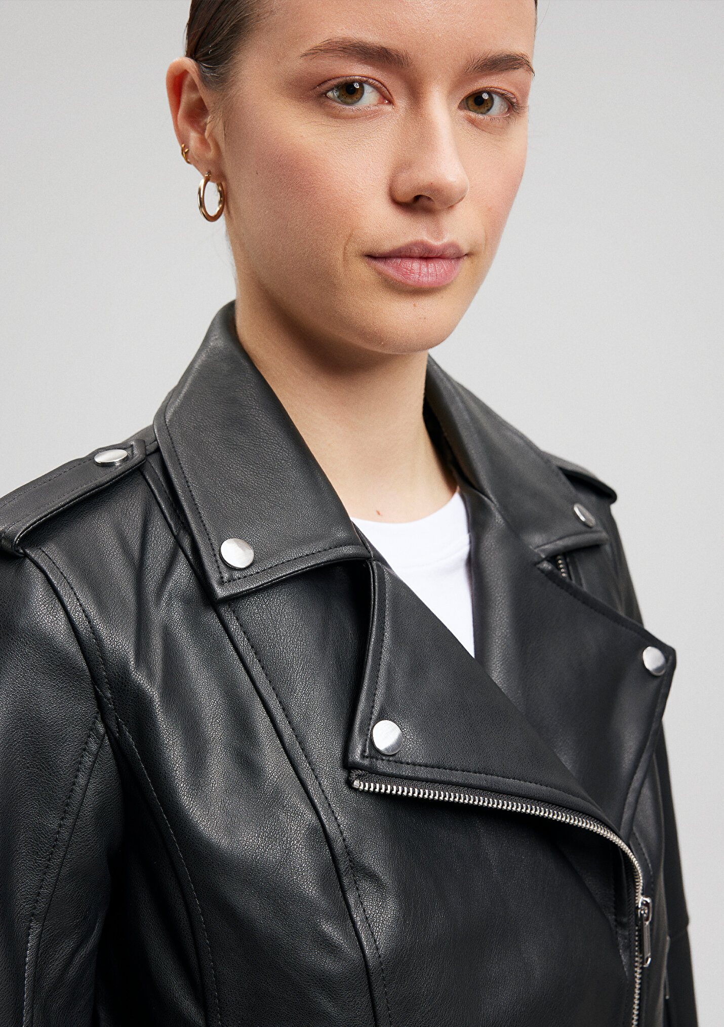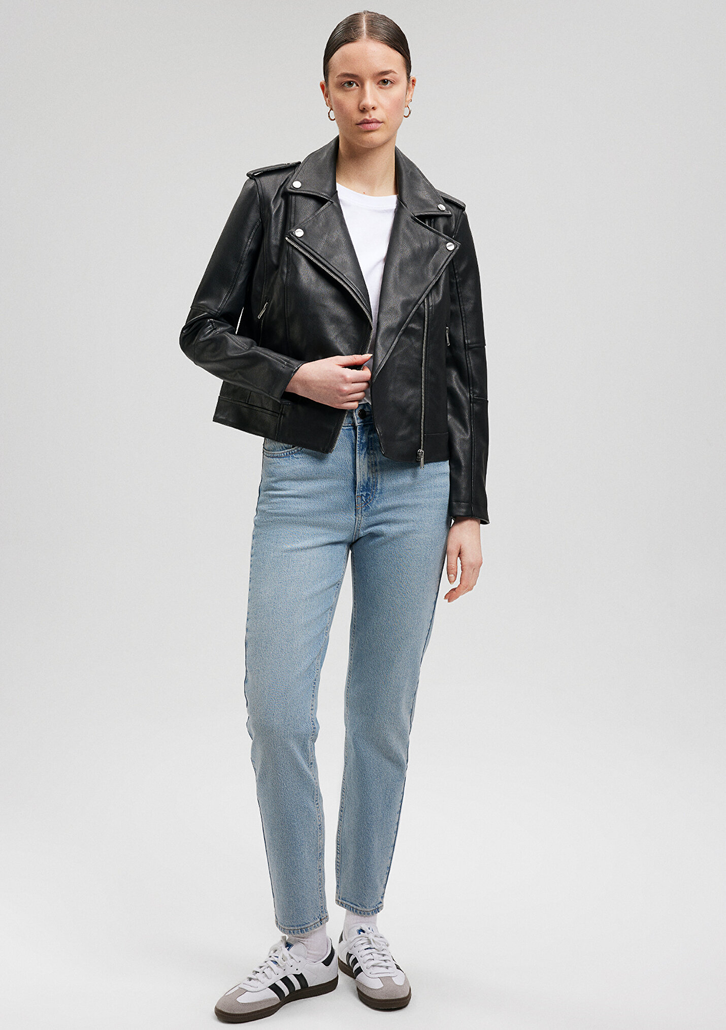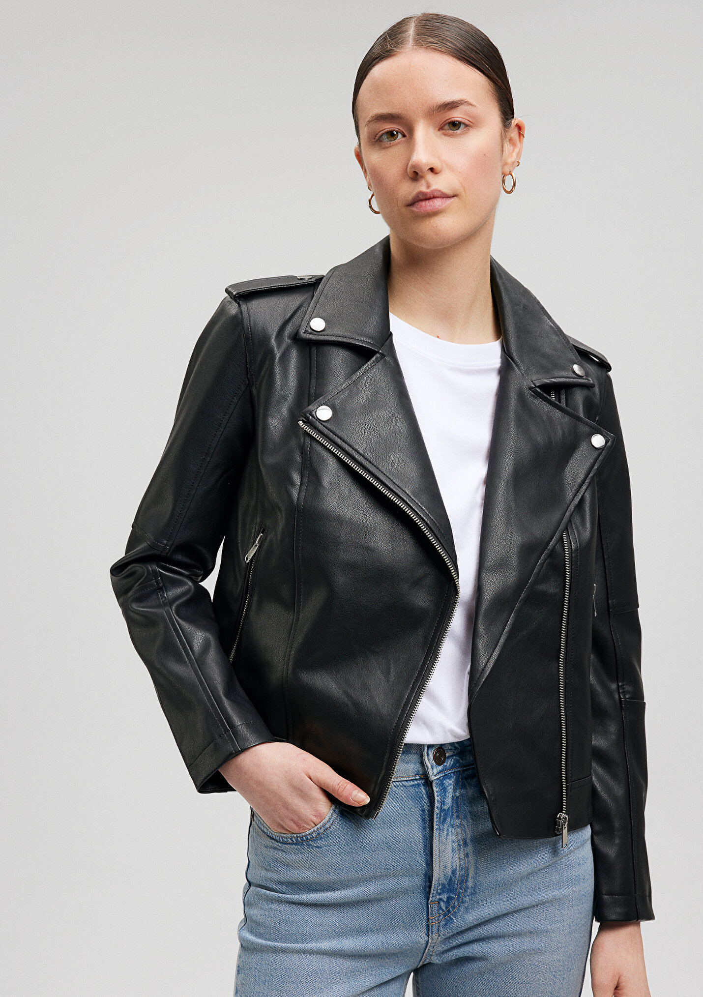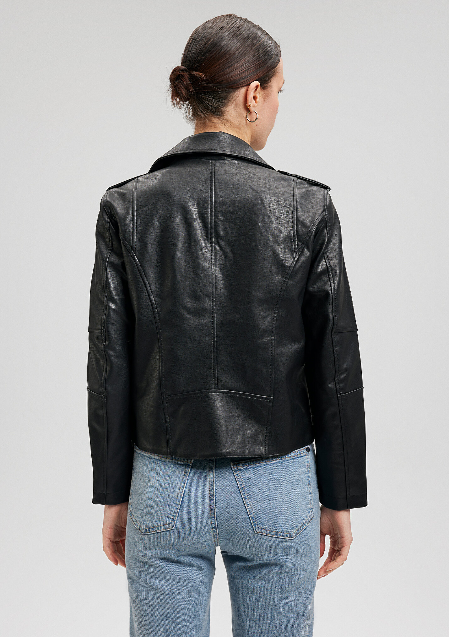 Mavi nin kadın koleksiyonundan Biker Yaka Siya Suni Deri Ceket. Ürün özellikleri, iki adet fermuarlı yan cep.