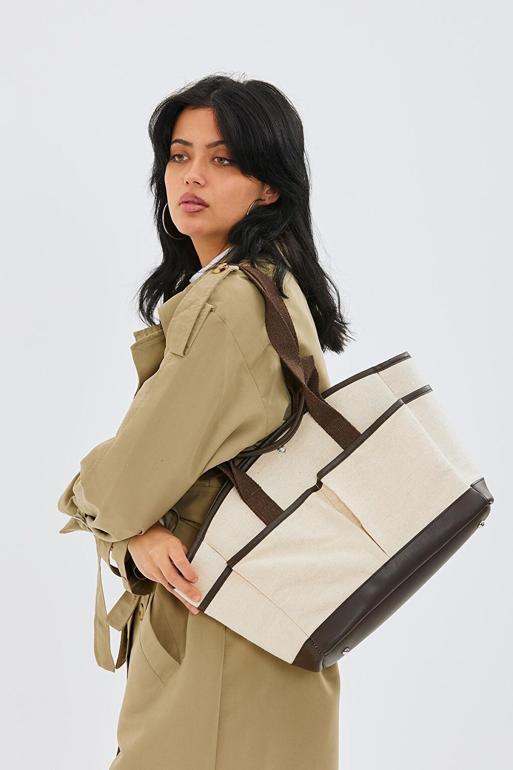 - نام : Çok Gözlü Kanvas Deri Kombinasyonlu Naturel Kadın Kol Çanta Kahverengi