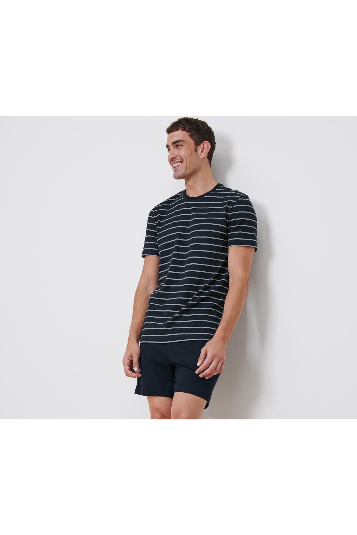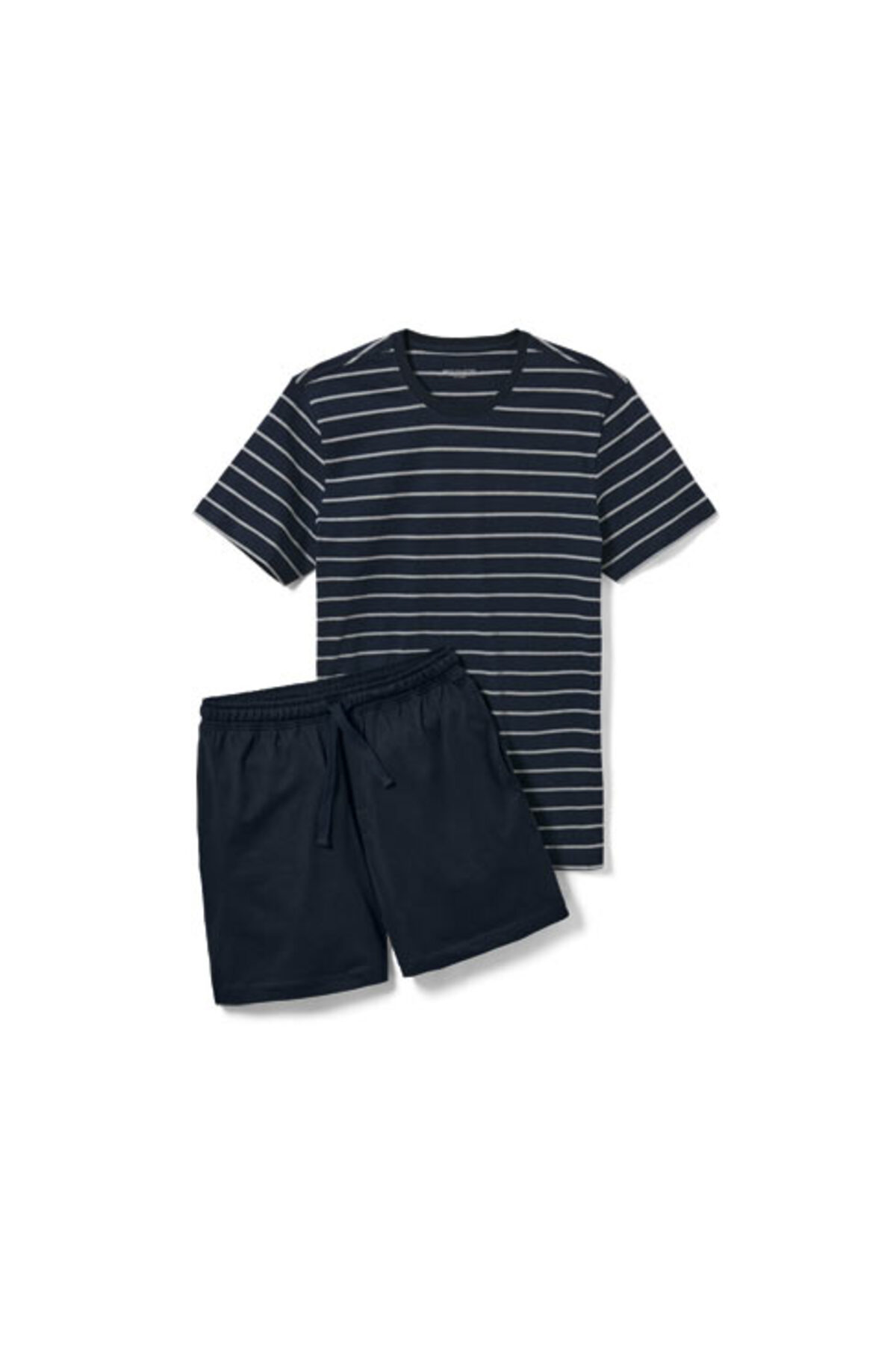 Şortlu Pijama Takımı Kesim: Regular Fit Renk: Pijama üstü koyu mavi-gri çizgiliPijama altı koyu mavi Malzeme: %100 pamuklu (Afrika'da pamuk üretimi girişimini destekler) Ölçüler: Pijama üstü toplam uzunluğu yakl. 77 cmPijama altı iç bacak uzunluğu yakl. 16 cm (L 52/54 beden) Yumuşak Single Jersey kumaş kalitesi|Yan cepli, elastik bel bantlı ve bağcıklı pijama altı|Yuvarlak yakalı pijama üstü |Afrika'da pamuk üretimi girişimini destekler|Bu pijama takımı çiftçileri destekliyor.