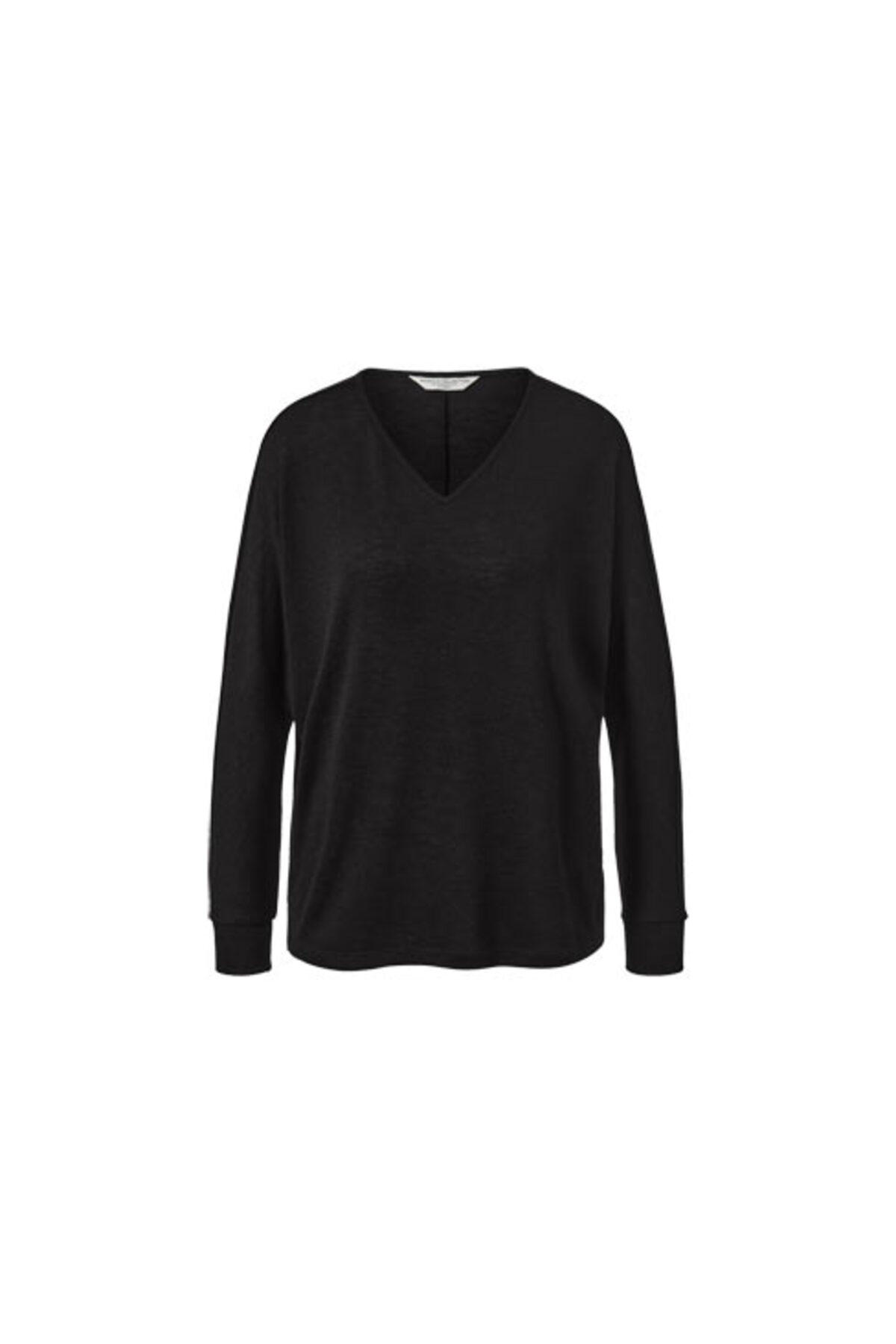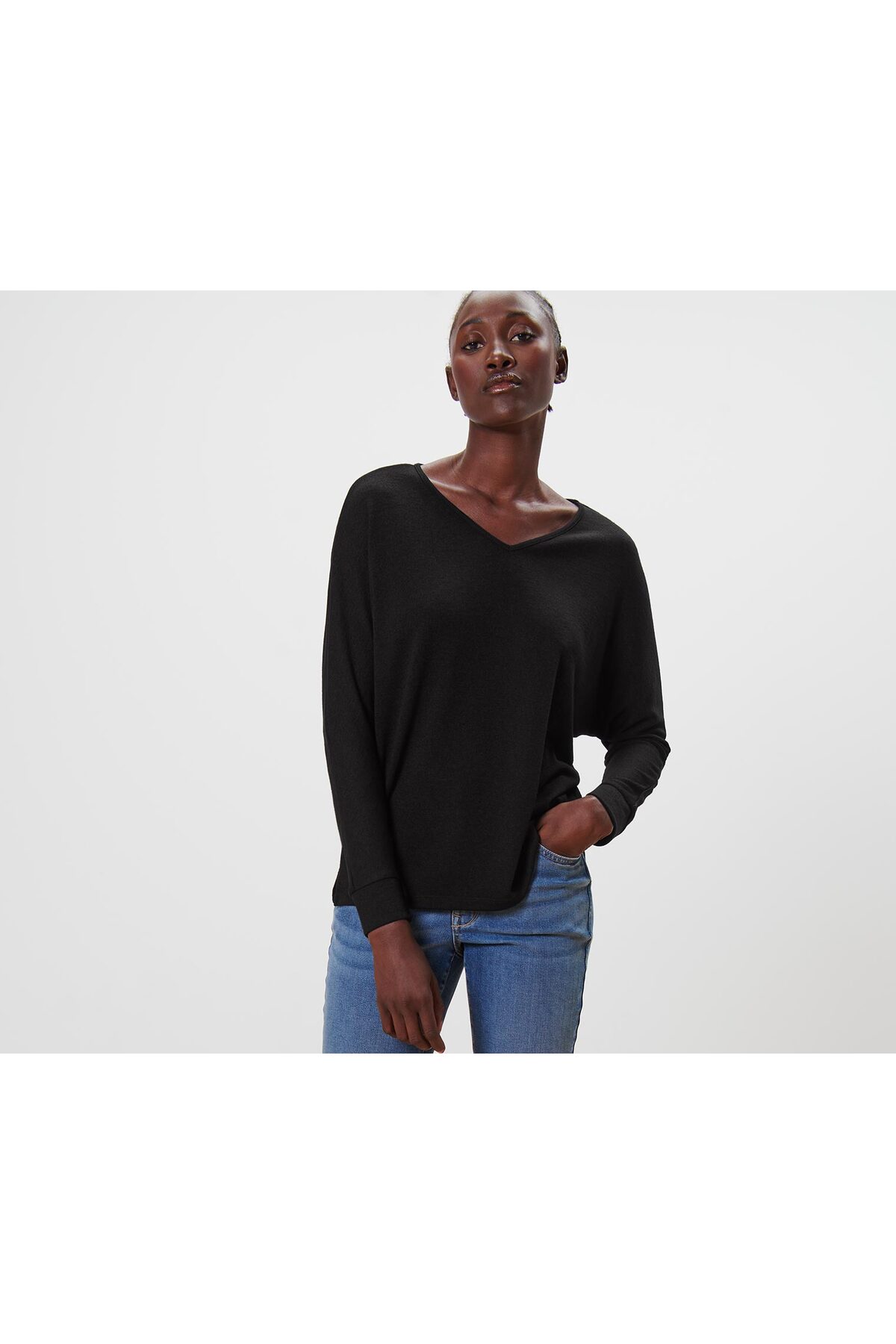 Yarasa Kol Bluz Kesim: Comfort Fit Renk: Siyah Malzeme: %73 viskoz (Lenzing'den), %27 polyester (geri dönüştürülmüş) Ölçüler: Toplam uzunluğu yakl. 66,5 cm (M 40/42 beden) Viskozlu yumuşak dökümlü kumaş|Yuvarlatılmış V yaka|Geniş bilek detayı|Yan yırtmaçlı paçalar|Yarasa kollar|Bölme dikişli sırt kısmı|Bu üst, sürdürülebilir ahşap fiberler içerir.