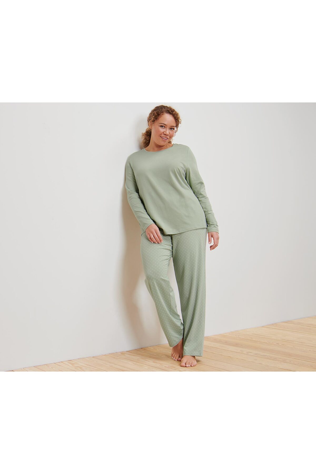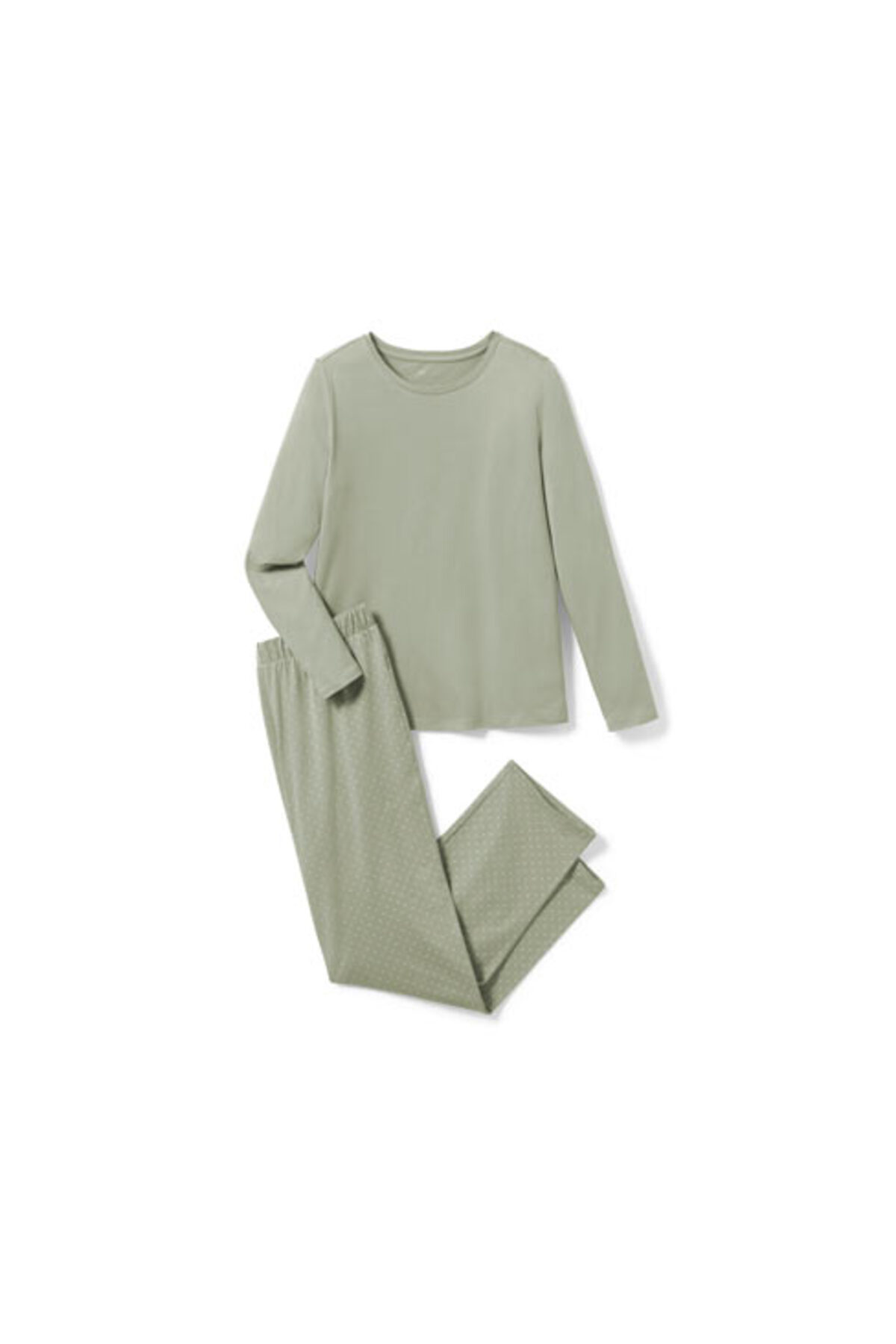 Pijama Takımı Kesim: Regular Fit Renk: Pijama üstü ada çayı yeşiliBeyaz puantiyeli ada çayı yeşili pijama altı Malzeme: %58 pamuklu (Afrika'da pamuk üretimi girişimini destekler), %39 viskoz, %3 elastan Ölçüler: Pijama üstü toplam uzunluğu yakl. 64,5 cm (M 40/42 beden)Pijama altı iç bacak uzunluğu yakl. 77,5 cm Yumuşak pamuk-viskoz kumaş|Yuvarlak yakalı pijama üstü|Elastik bel bantlı pijama altı|Dayanıklılık ve yıkamaya dirençlilik için yüksek kaliteli marka elastanlı|Bu pijama takımı çiftçileri destekliyor.